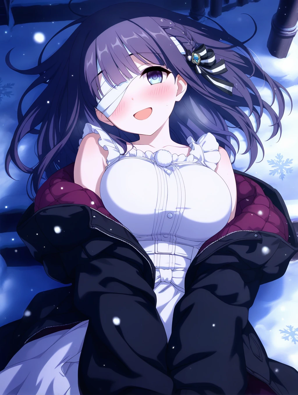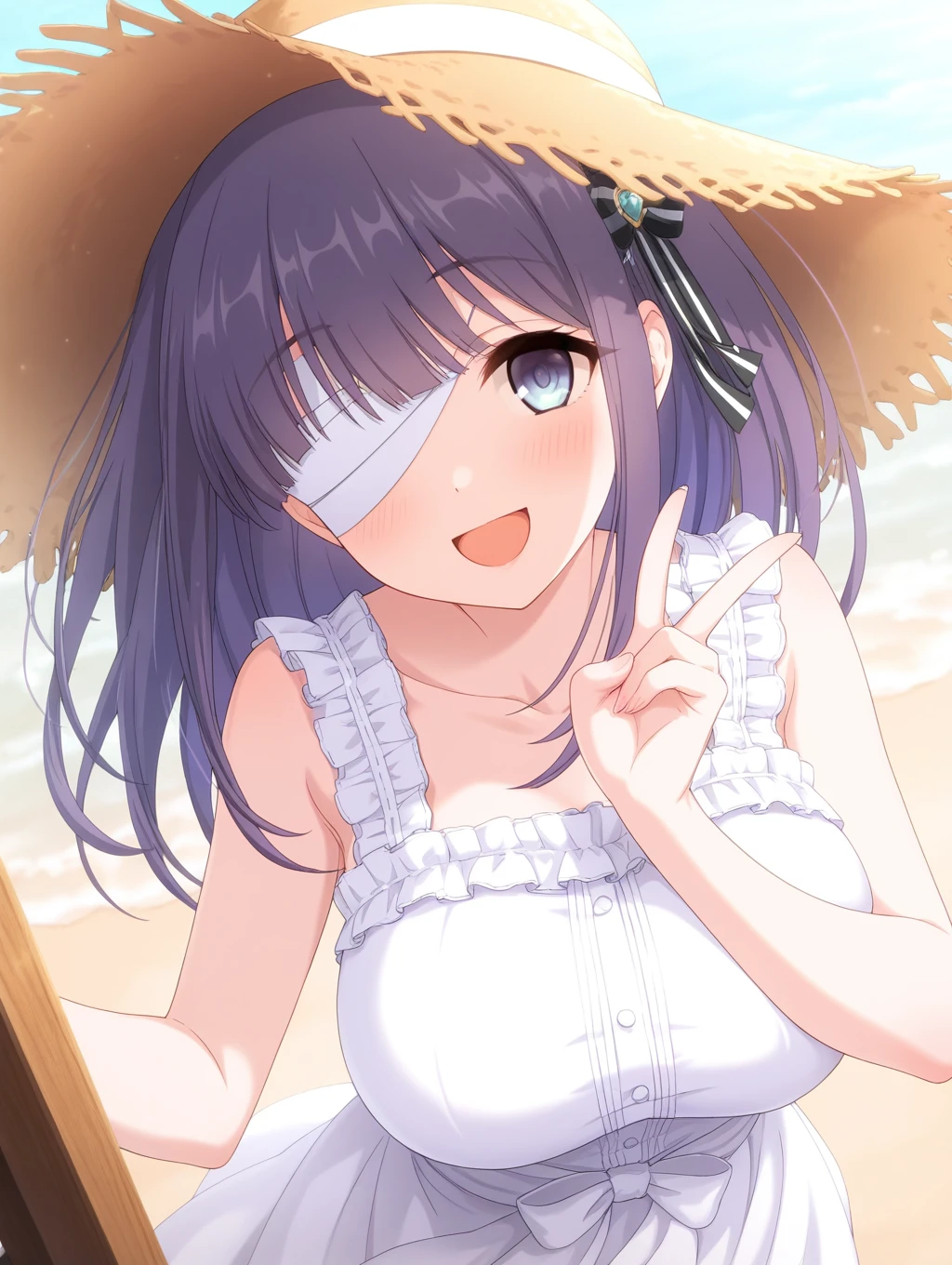 misora,1girl,solo,large breasts,white dress,sleeveless dress,bandage over one eye,open mouth,smile,standing,straw hat