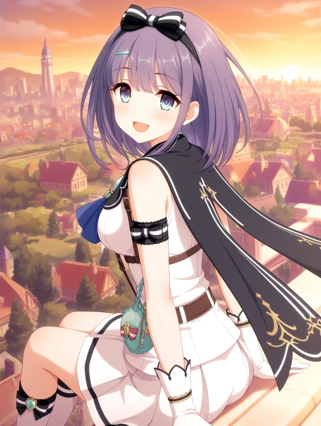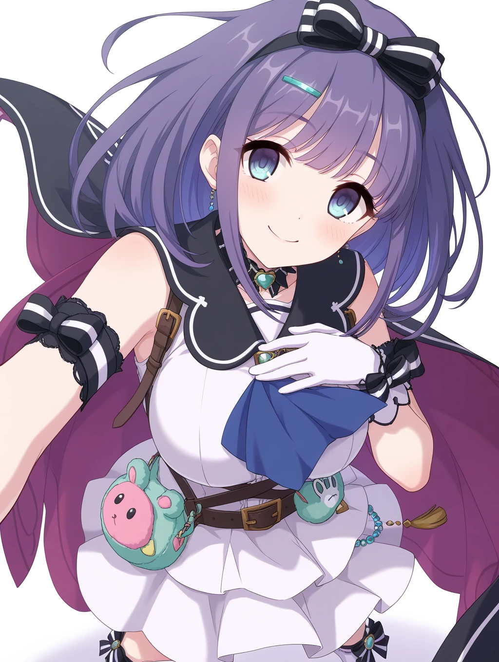 misora,1girl,bow hairband,black hairband,blue eyes,smile,white skirt,blue hair,hairclip,white gloves,blue ascot,looking at viewer,short hair,purple hair,solo,white shirt,sleeveless,standing,belt,arm cuffs,bow,white socks,capelet,