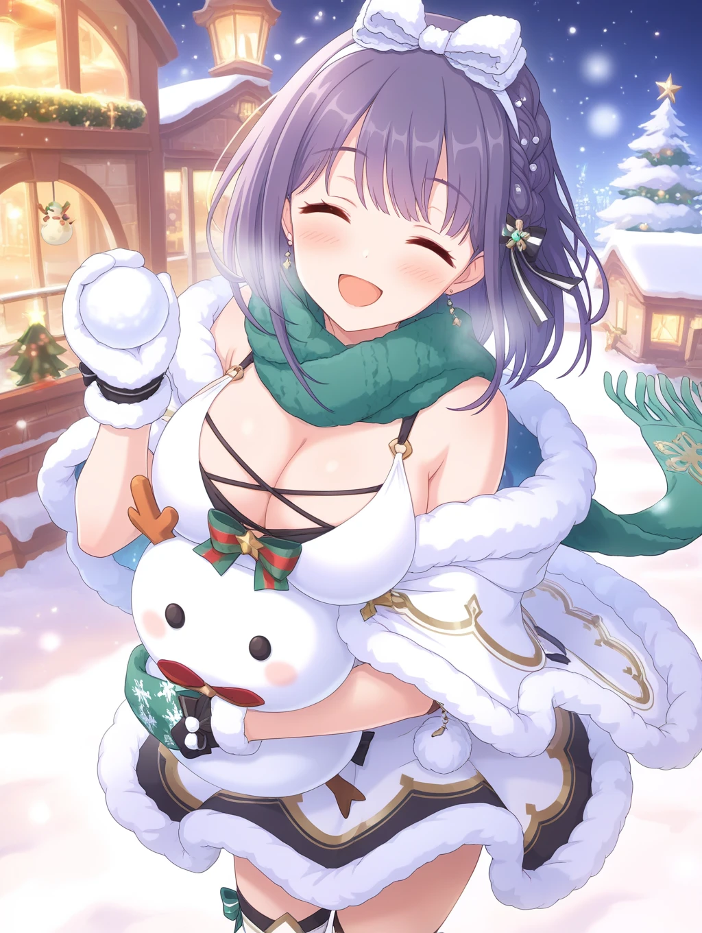 misora\(summer\),1girl,solo,mittens,short hair,white dress,cleavage,bow,blue eyes,looking at viewer,smile,fur trim,bow hairband,white thighhighs,purple hair,jewelry,capelet,hair bow,christmas,large breasts,braid,white hairband,