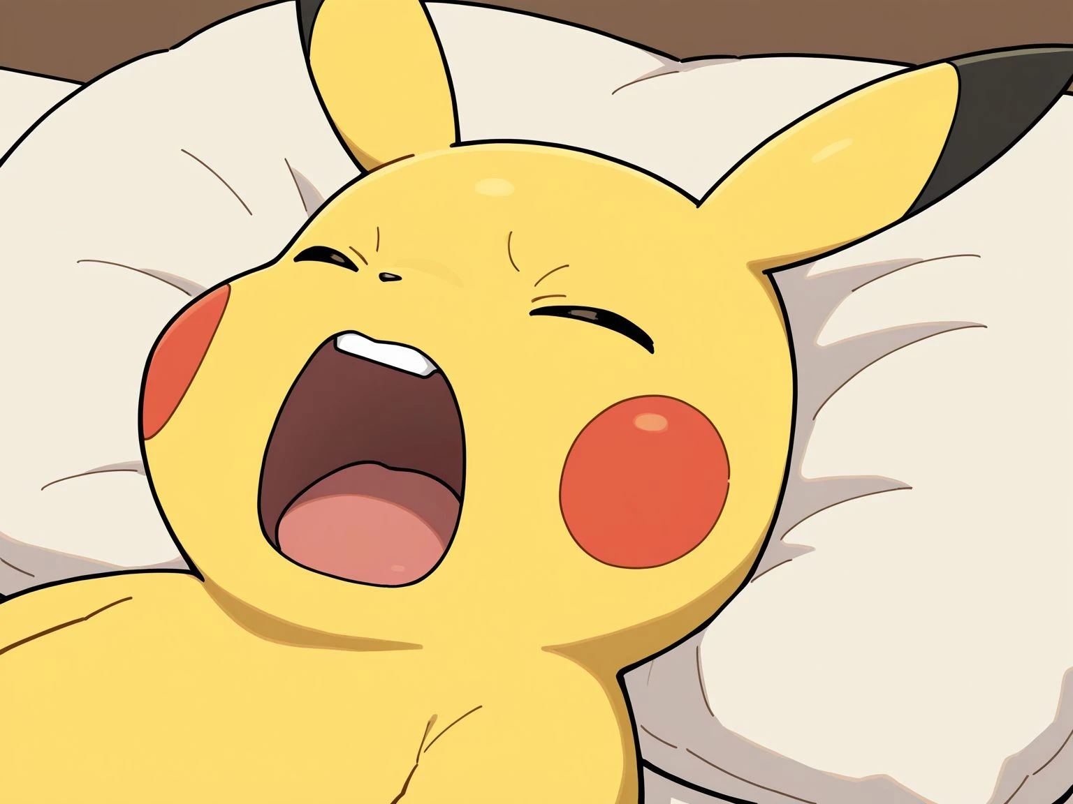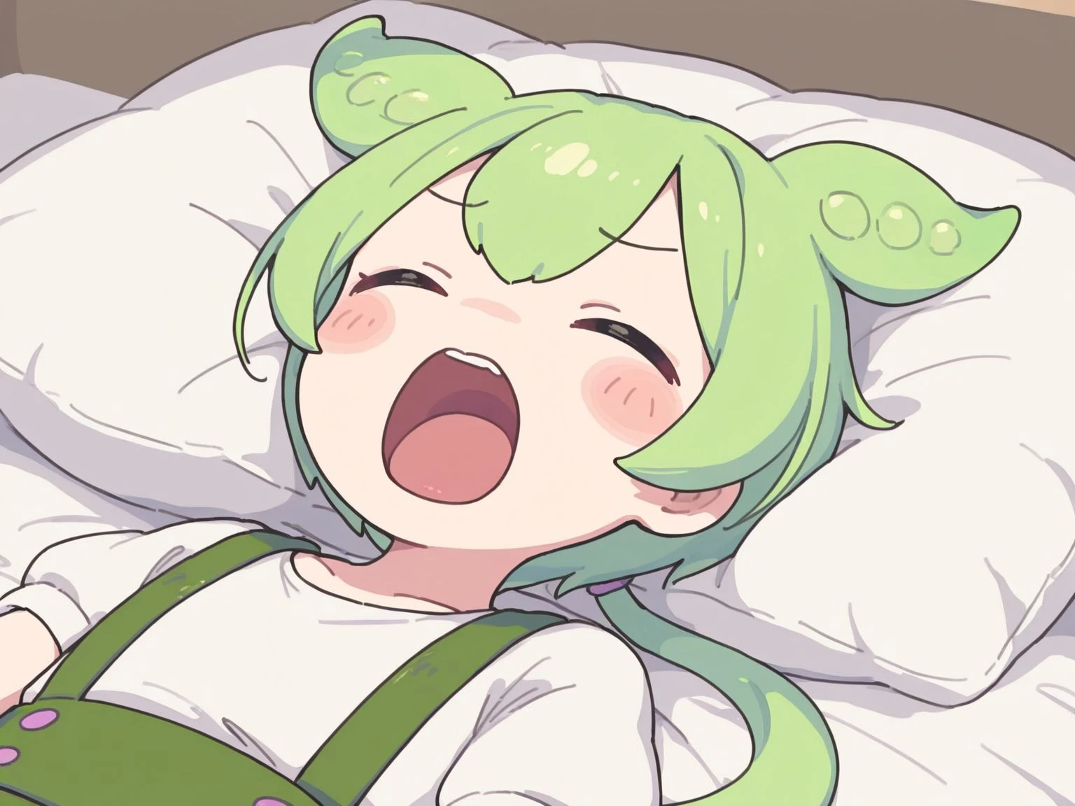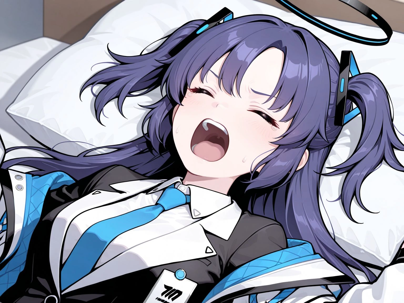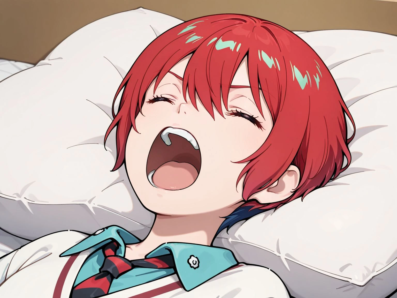 open mouth,closed eyes,on back,lying,pillow,teeth,upper teeth only,screaming