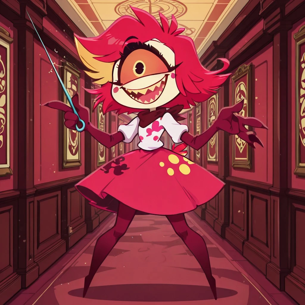 cyclops female, solo, curvy, pale skin, large red/orange gradient sclera, black eye, red hair with yellow accent, short messy red hair, brown neckerchief, maroon neckerchief, brown opera gloves, maroon opera gloves, brown leggings, maroon leggings, four fingers, sharp nails, white baggy shirt with pink accents, red poodle_skirt, pointed legs, pointed feet, sharp teeth,