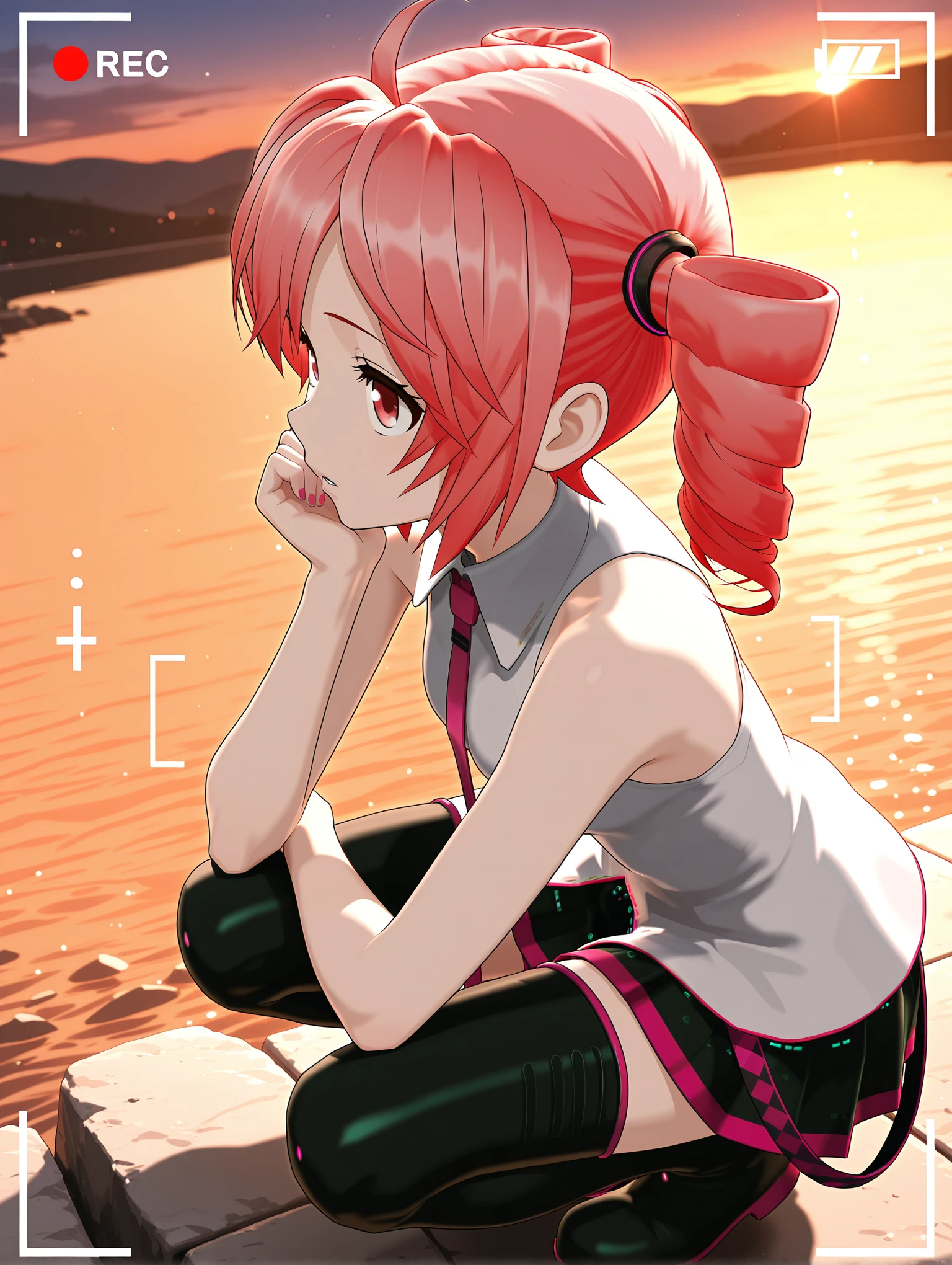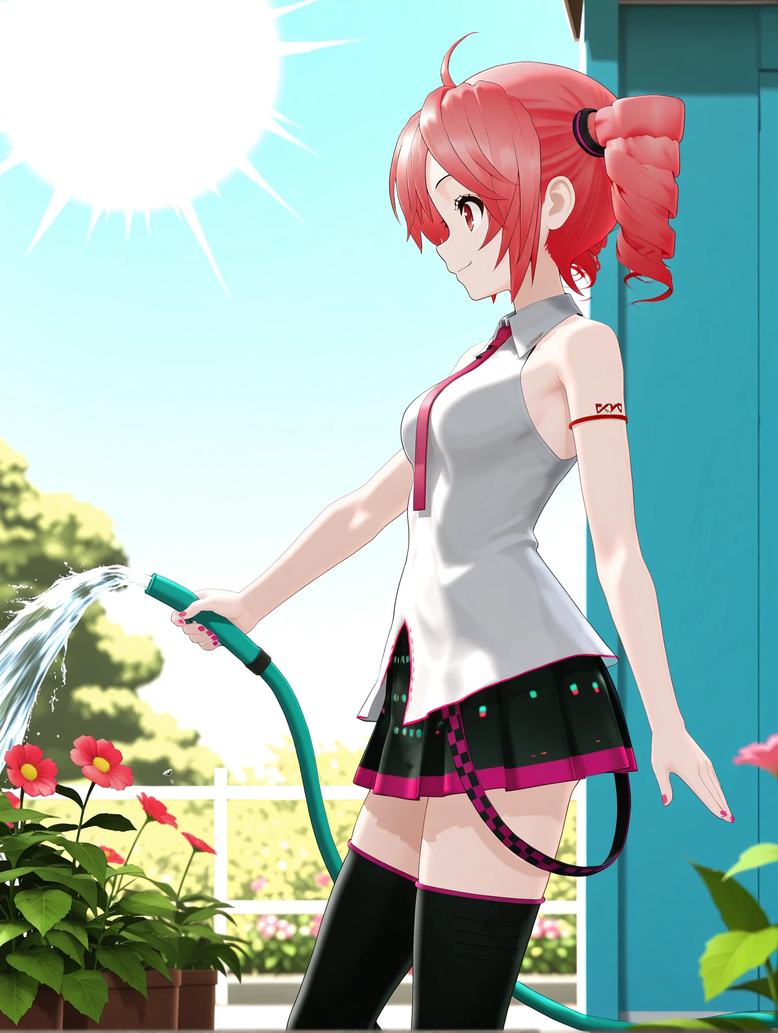 t_clothes,bare shoulders,red tie,sleeveless shirt,black pleated skirt,thigh boots,