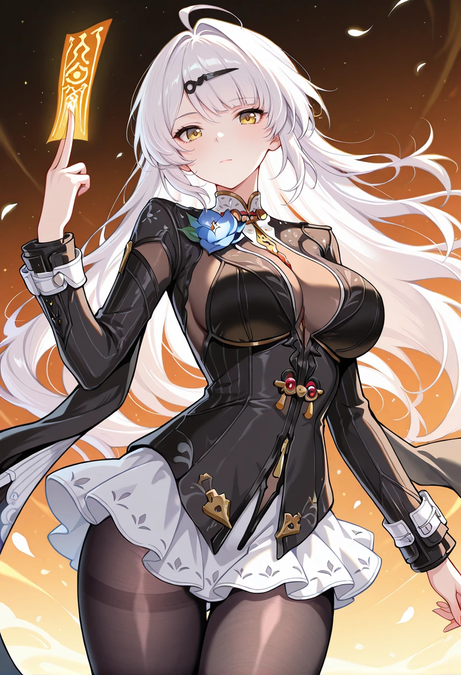 yixuanzzzxl1111 illustrious, yixuan, white hair, ahoge, long hair, yellow eyes, hairclip,Outfit promt (trails of ink):