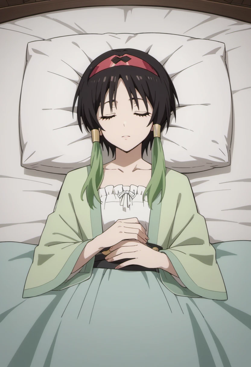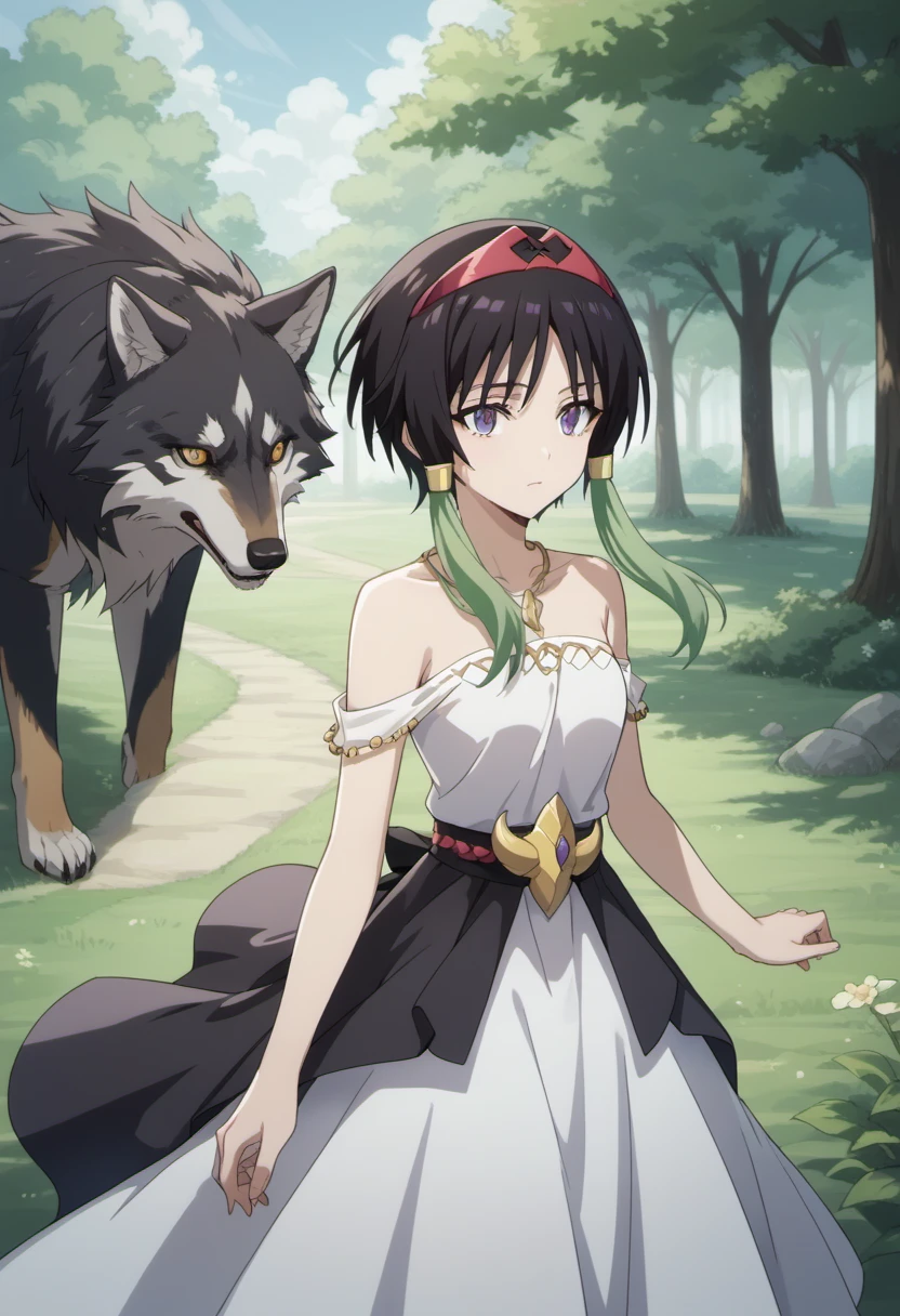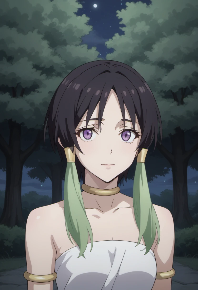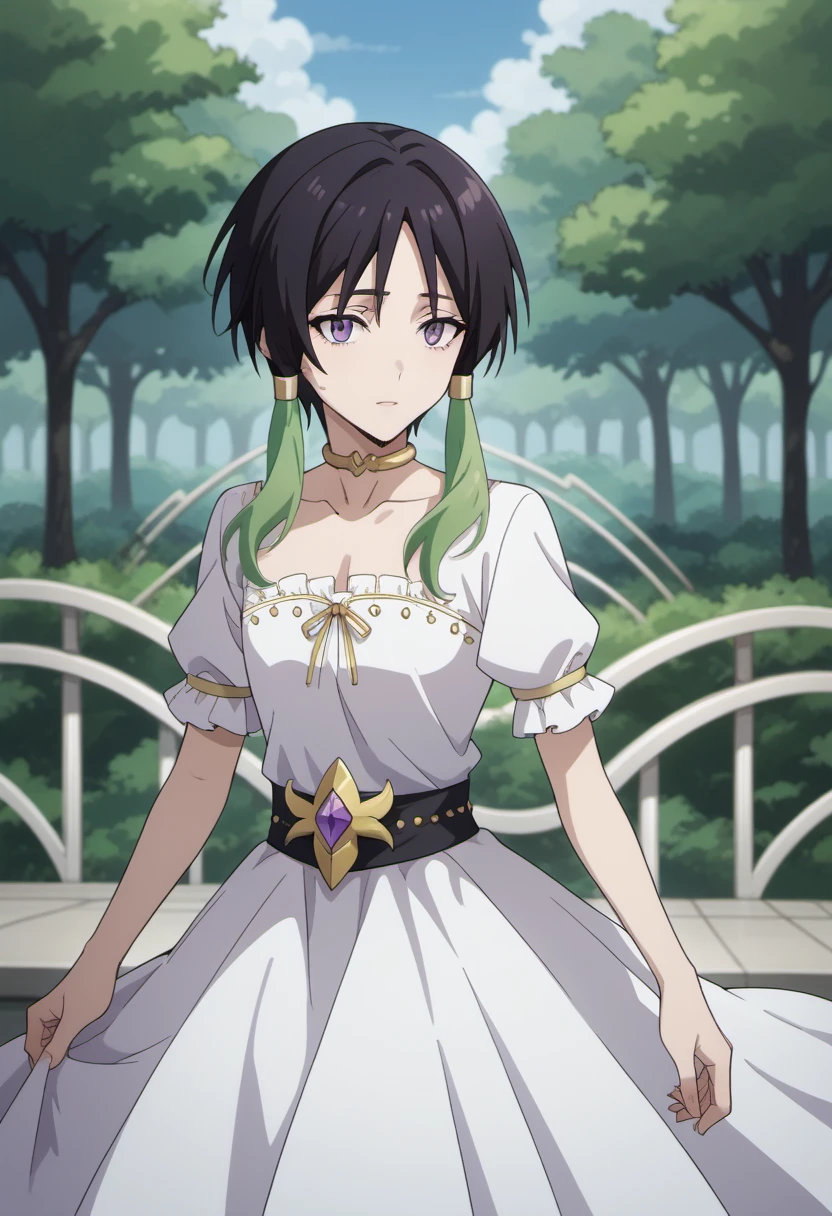 Trigger Words: towa (tensura), black hair, multicolored hair, green hair, short hair with long locks, purple eyes