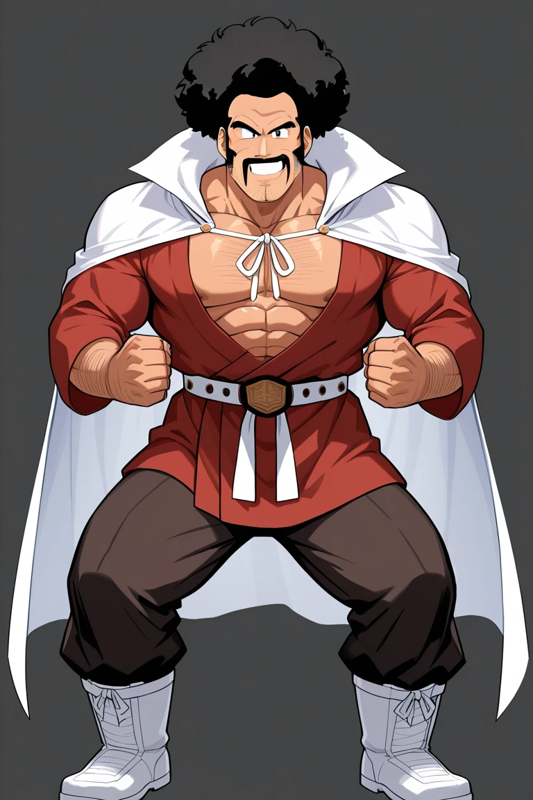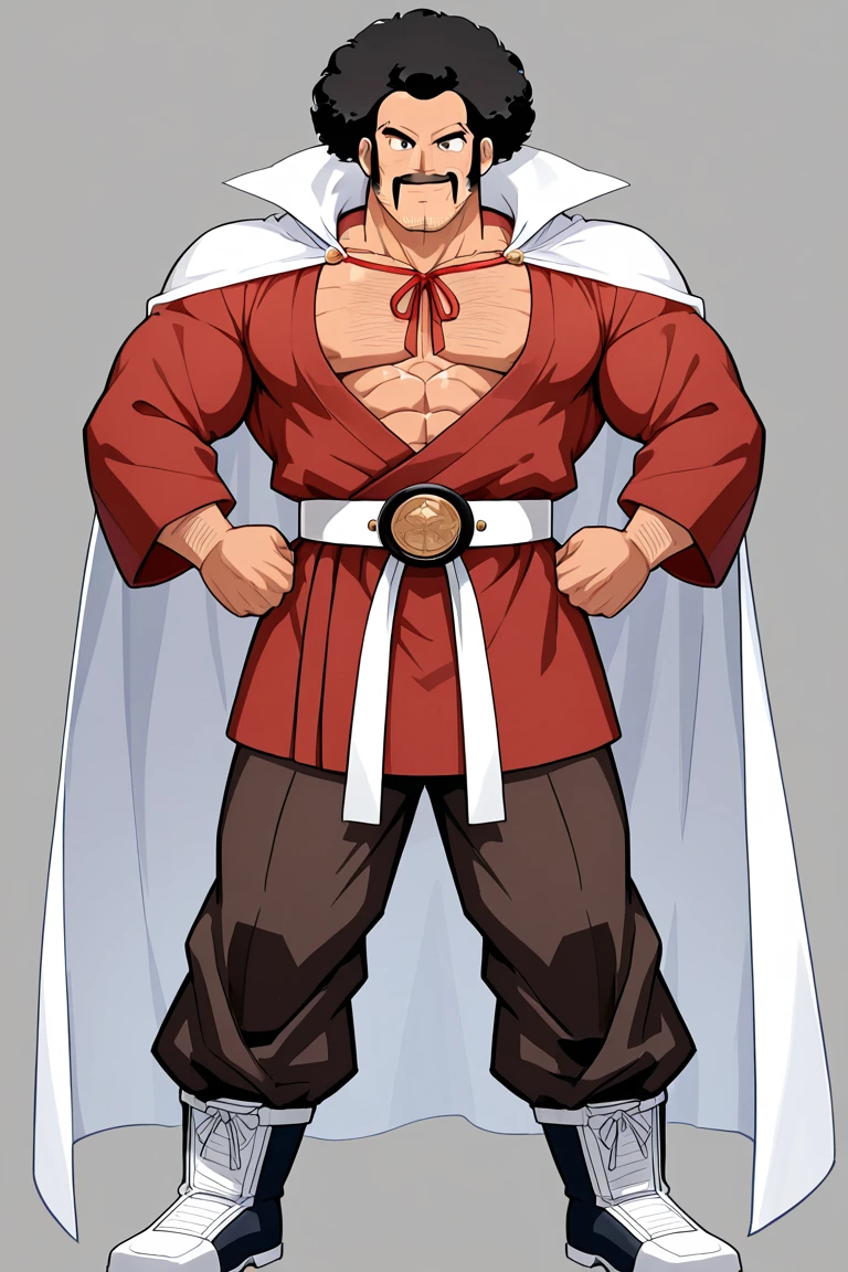 solo, male, adult, mr santa, Voluminous, black, slightly messy Afro hair, long sideburns, Thick black eyebrows, Eyes Blue, Light skin tone, slightly tanned, Black mustache, thick and distinctive, shaped like a “handlebar” extending downwards, Firm, square jaw, with three-day beard, stubble, Prominent straight nose, Tall stature (approx. 1.88 m), Robust muscular build, martial arts fighter body, Broad shoulders, Marked chest, with defined muscle lines, Strong toned arms, Big hands, Martial arts gi, White pants ,dark brown, white belt, White cape, boots