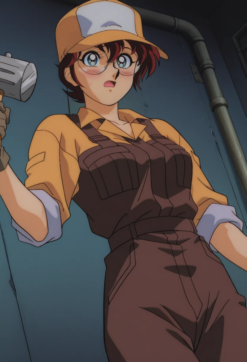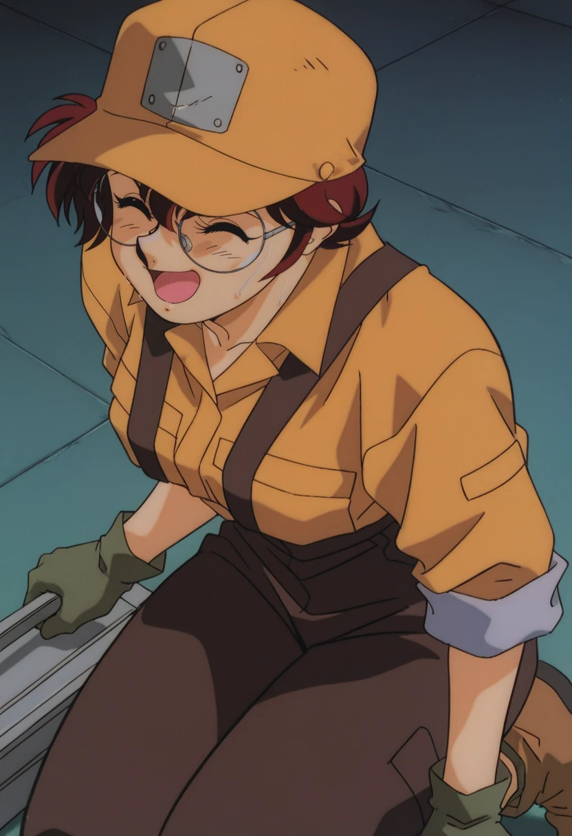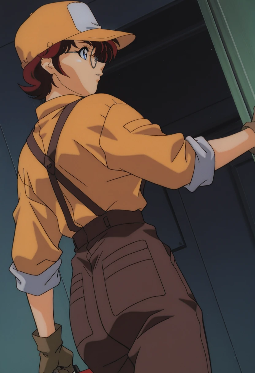 yellow baseball cap, round glasses, brown suspenders, yellow shirt, long sleeves, rolled-up sleeves, black gloves, brown overalls, brown footwear, holding toolbox,Camouflage Top Outfit: