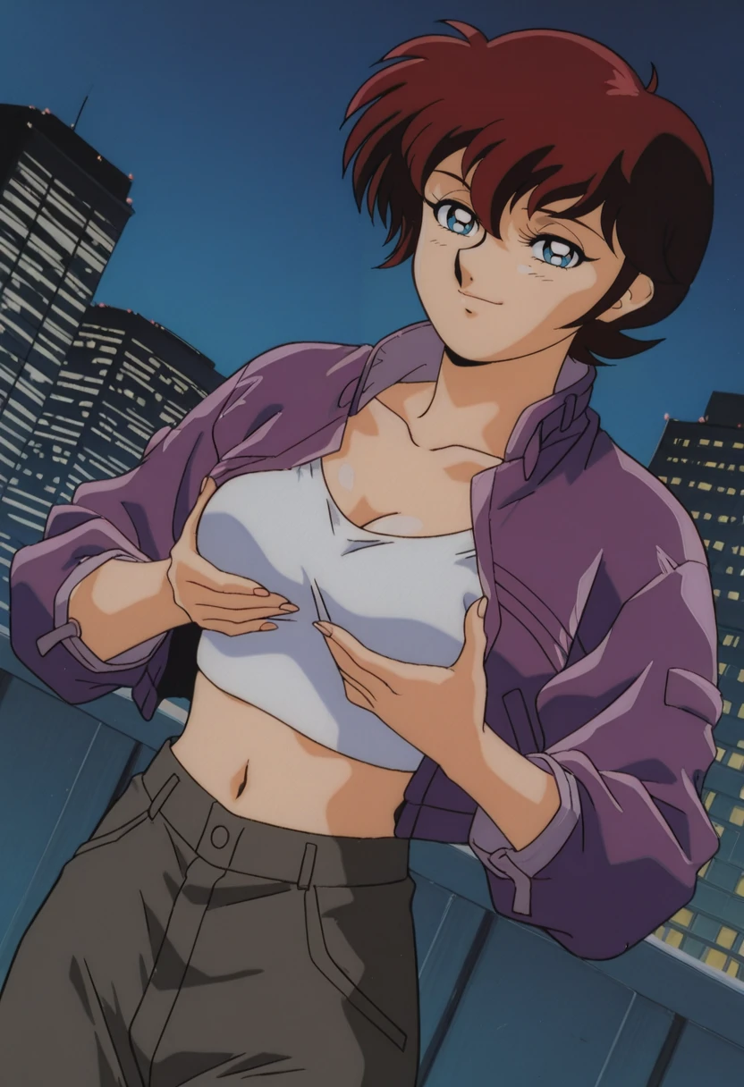 white tank top, purple jacket, open jacket, long sleeves, midriff, navel, gray pants, black socks, grey footwear,Bomb Disposal Expert: