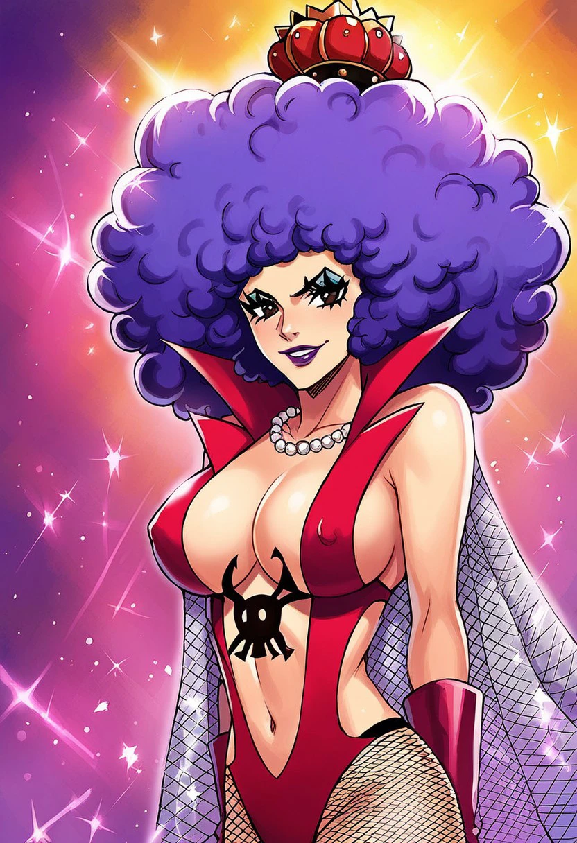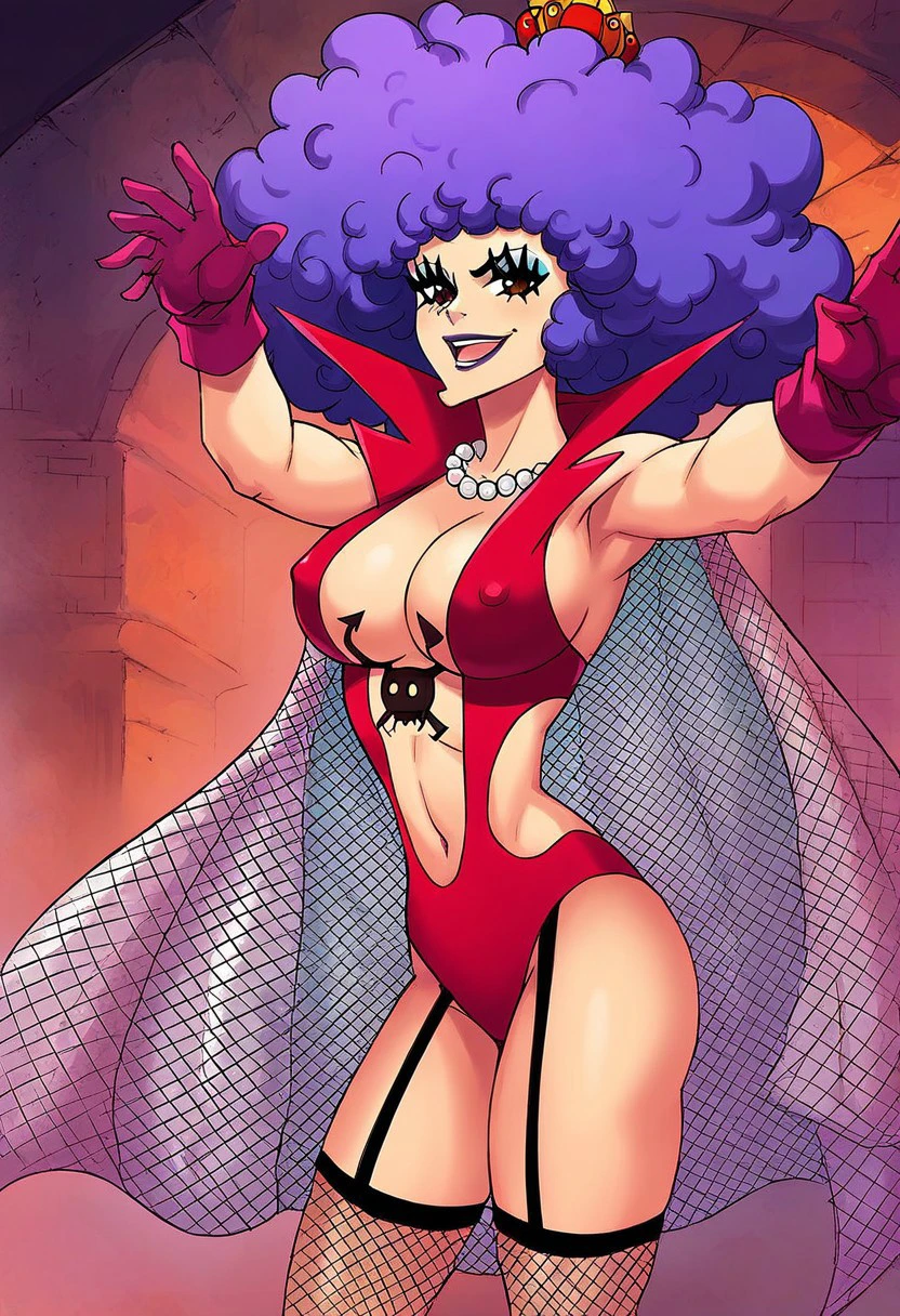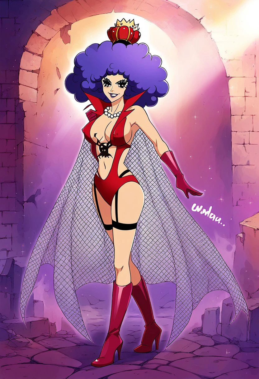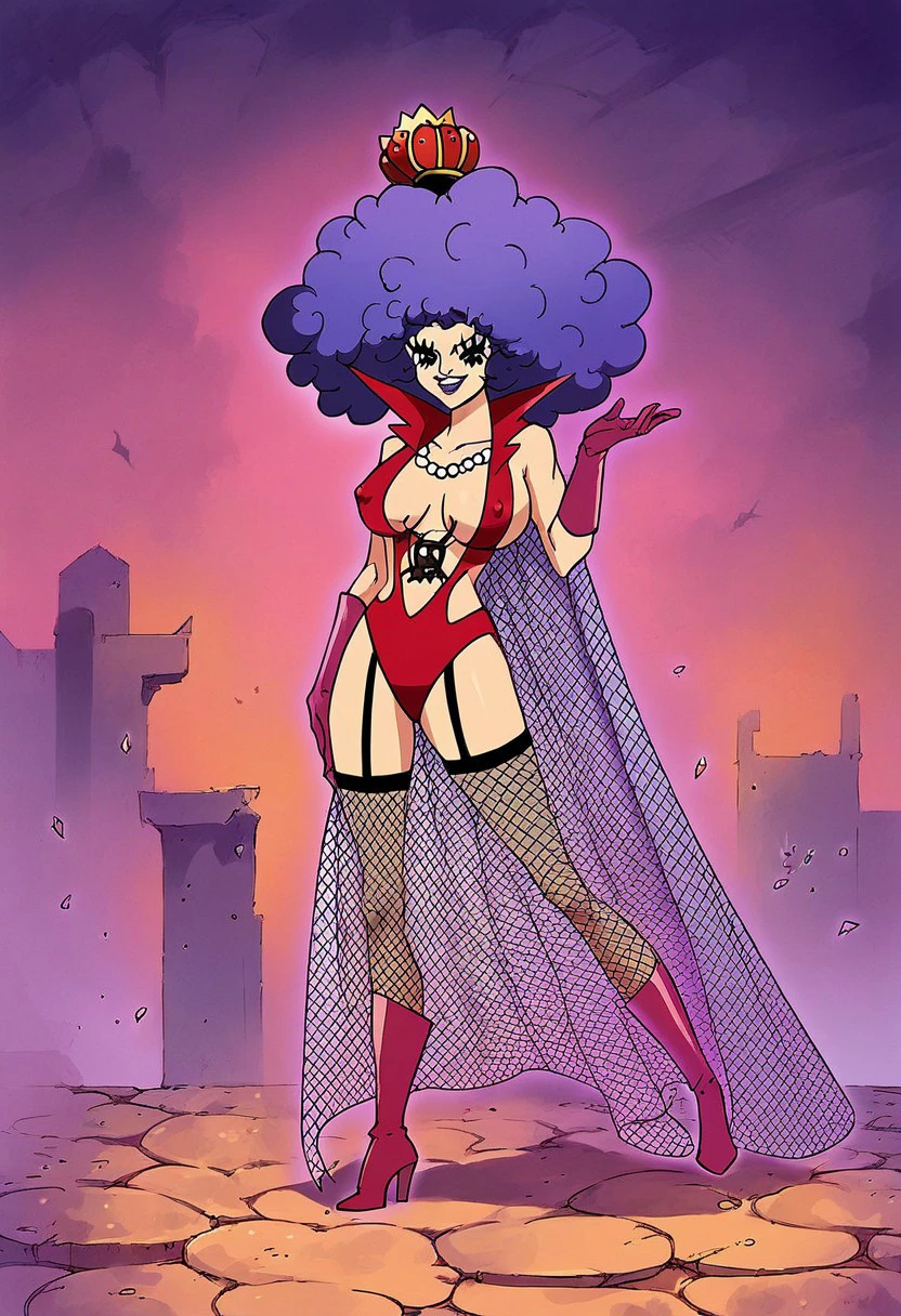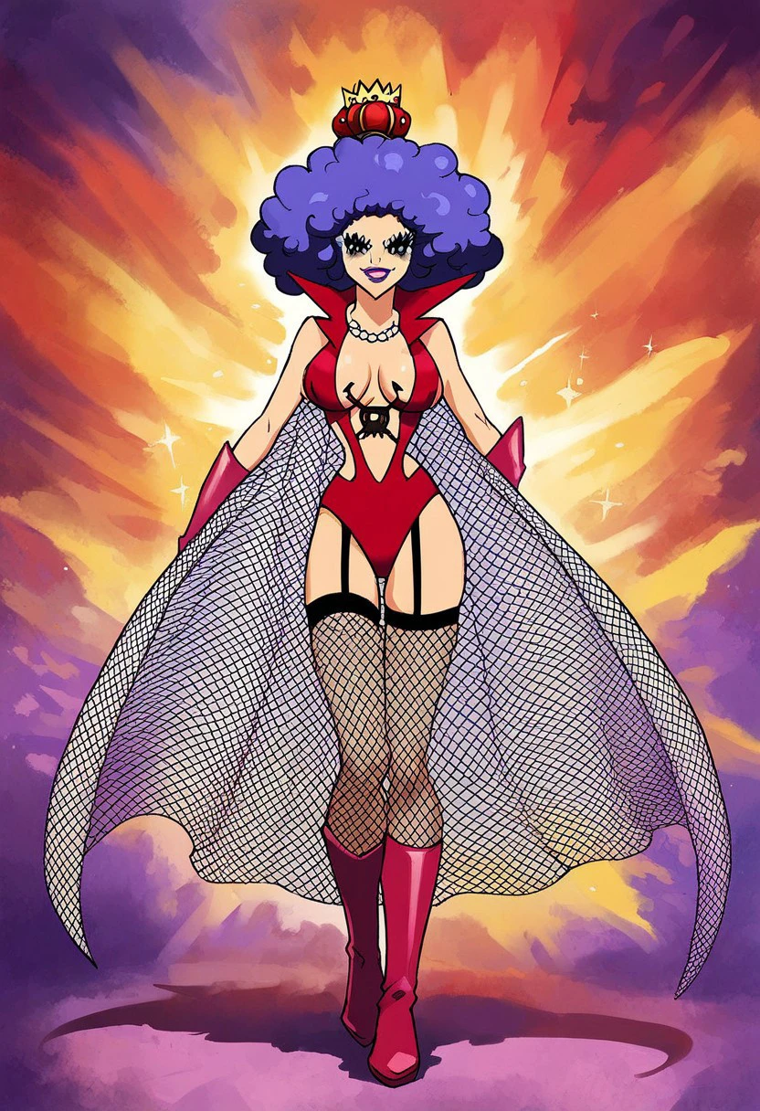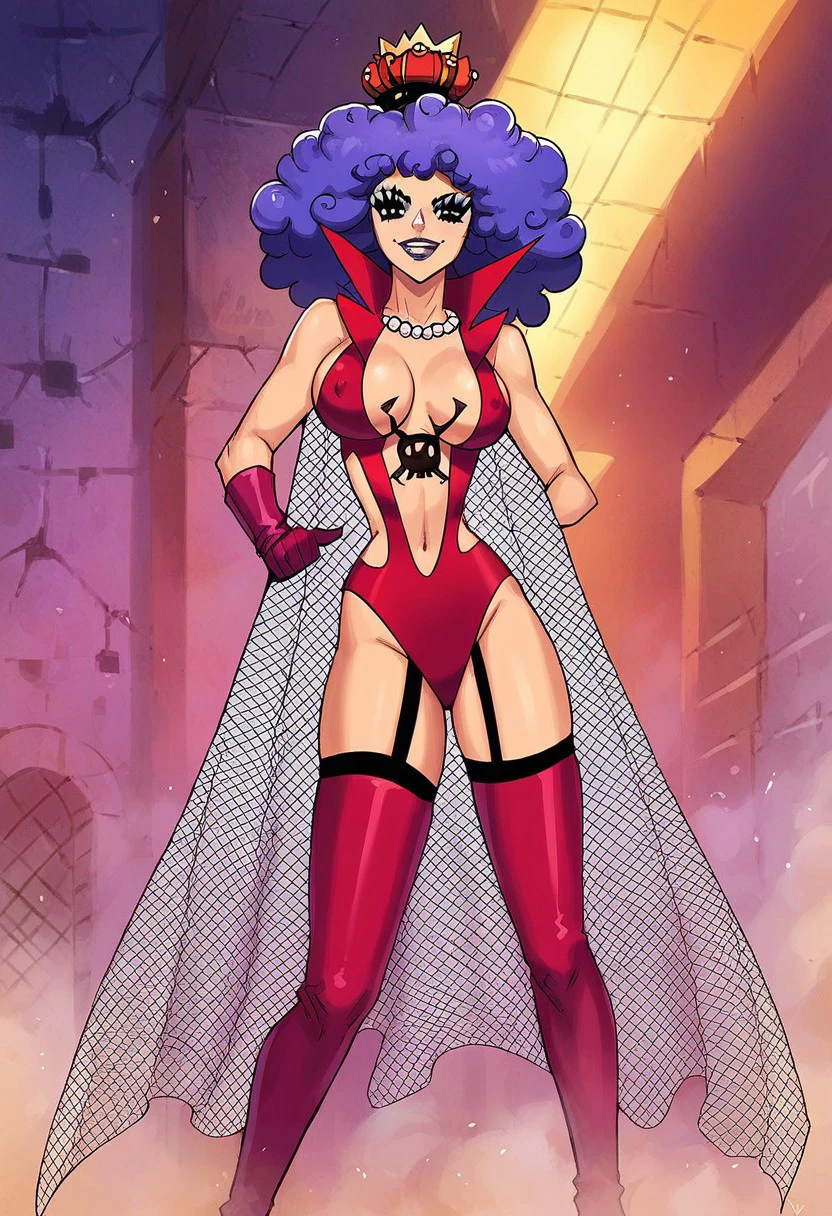 EmporioIvankovOP, 1girl, solo, purple hair, afro, crown, indigo hair, eyelashes, makeup, lips, lipstick, odd-shaped chin, large breast, reddish-purple leotard, high collar, deep V-neck, pearl necklace, gloves, boots, high heels, net cape, net leggings, jewelry, tattoo, black eyes, cleavage, garter straps,