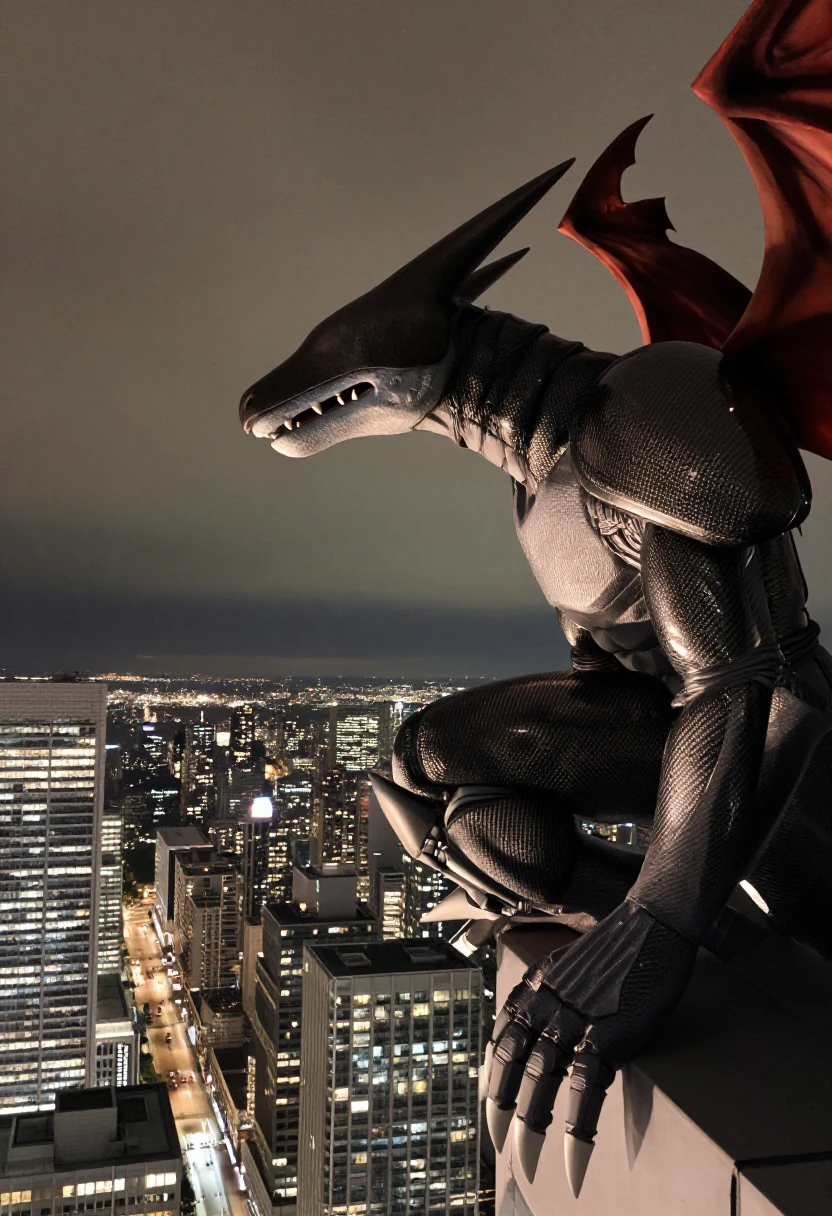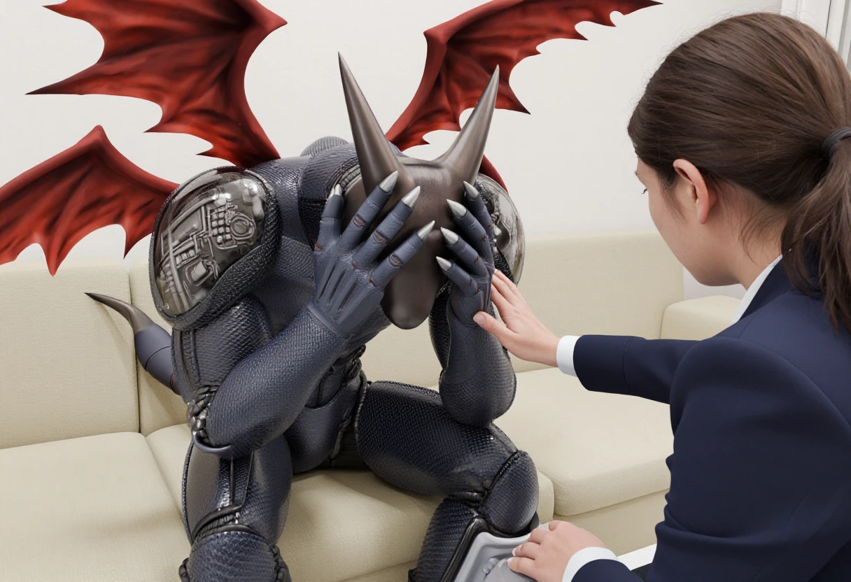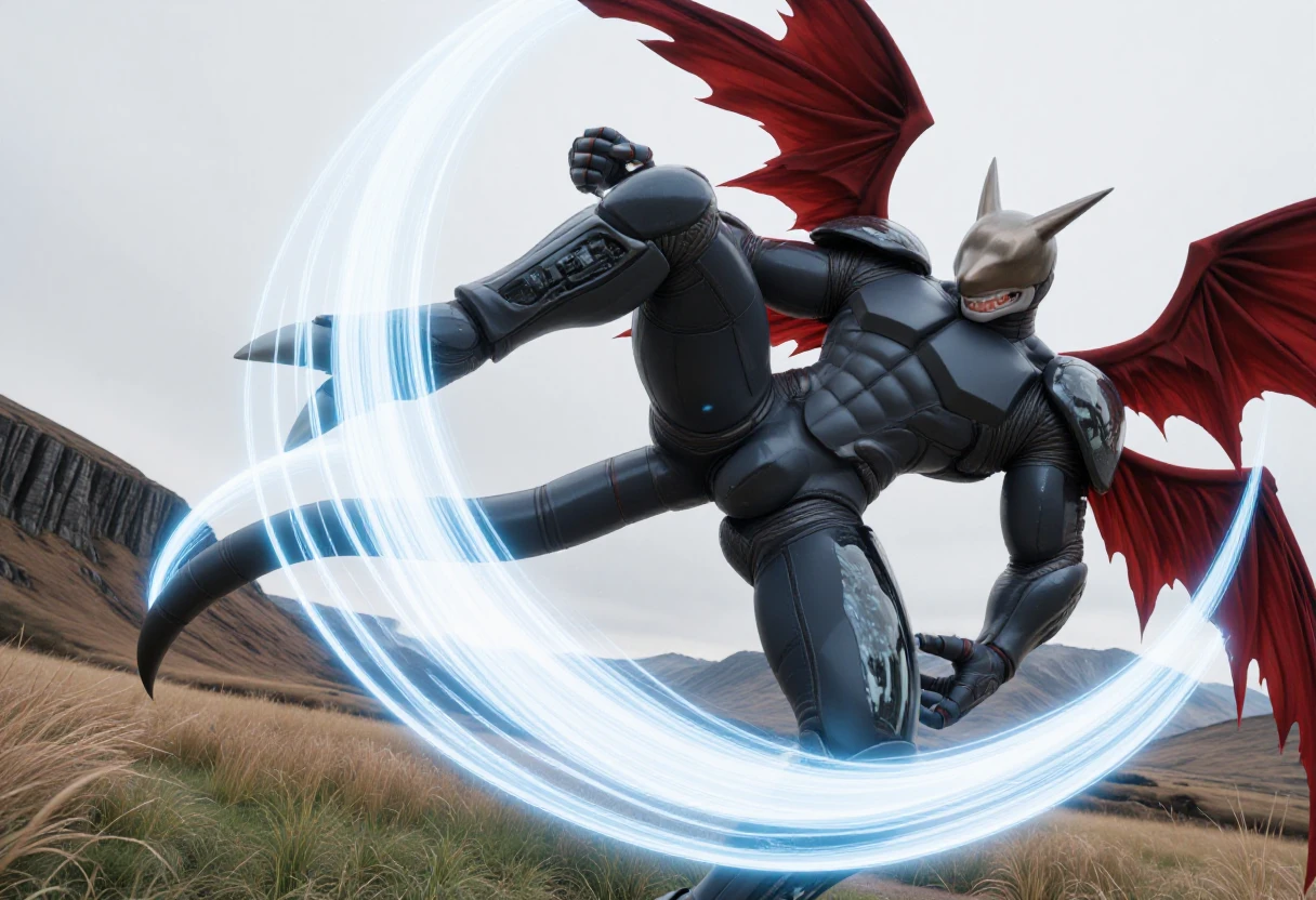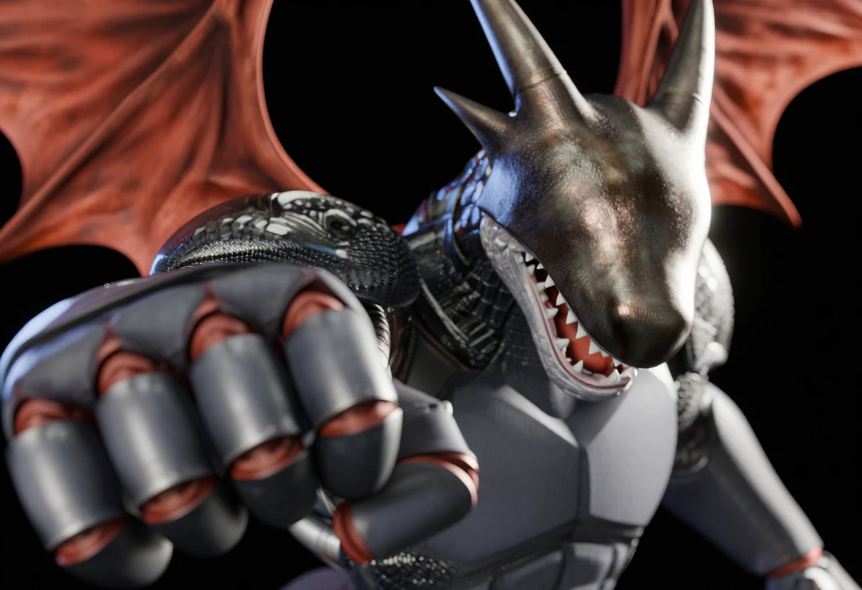 humanoid dragon, android, sharp teeth, arm blades, covered eyes, segmented armor, bat wings, white claws, metal helmet,