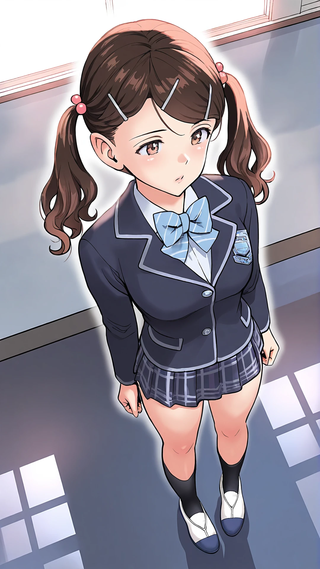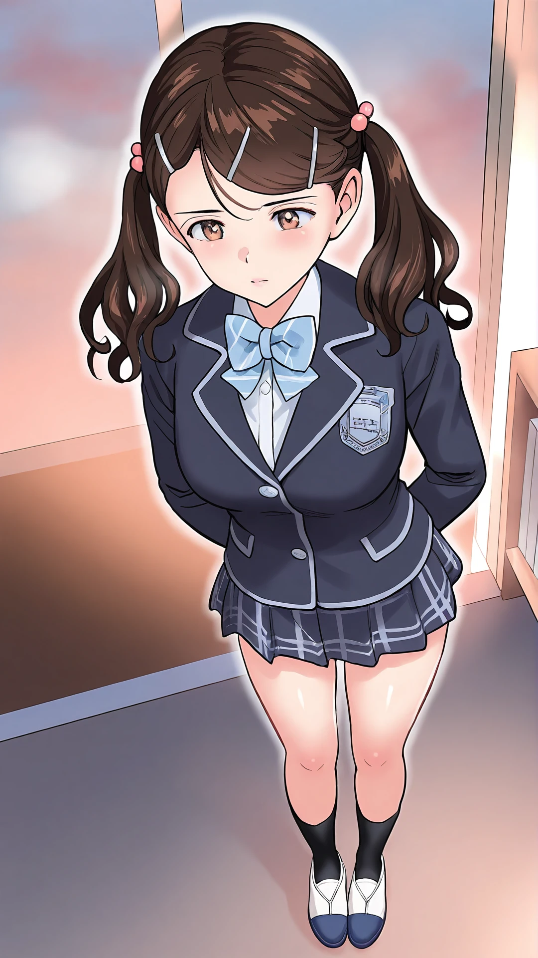 ,Unabara Shiori,1girl,solo,twintails,hair ornament,skirt,brown hair,school uniform,jacket,socks,blazer,brown eyes,hairclip,uwabaki,bow,plaid,pleated skirt,black socks,long hair,plaid skirt,