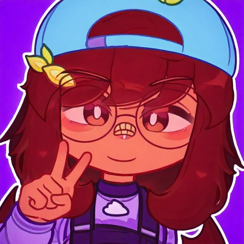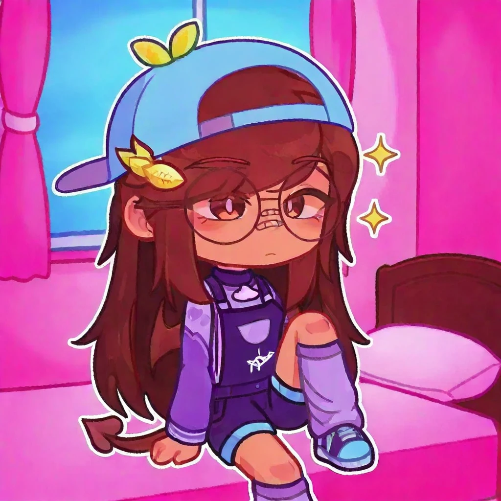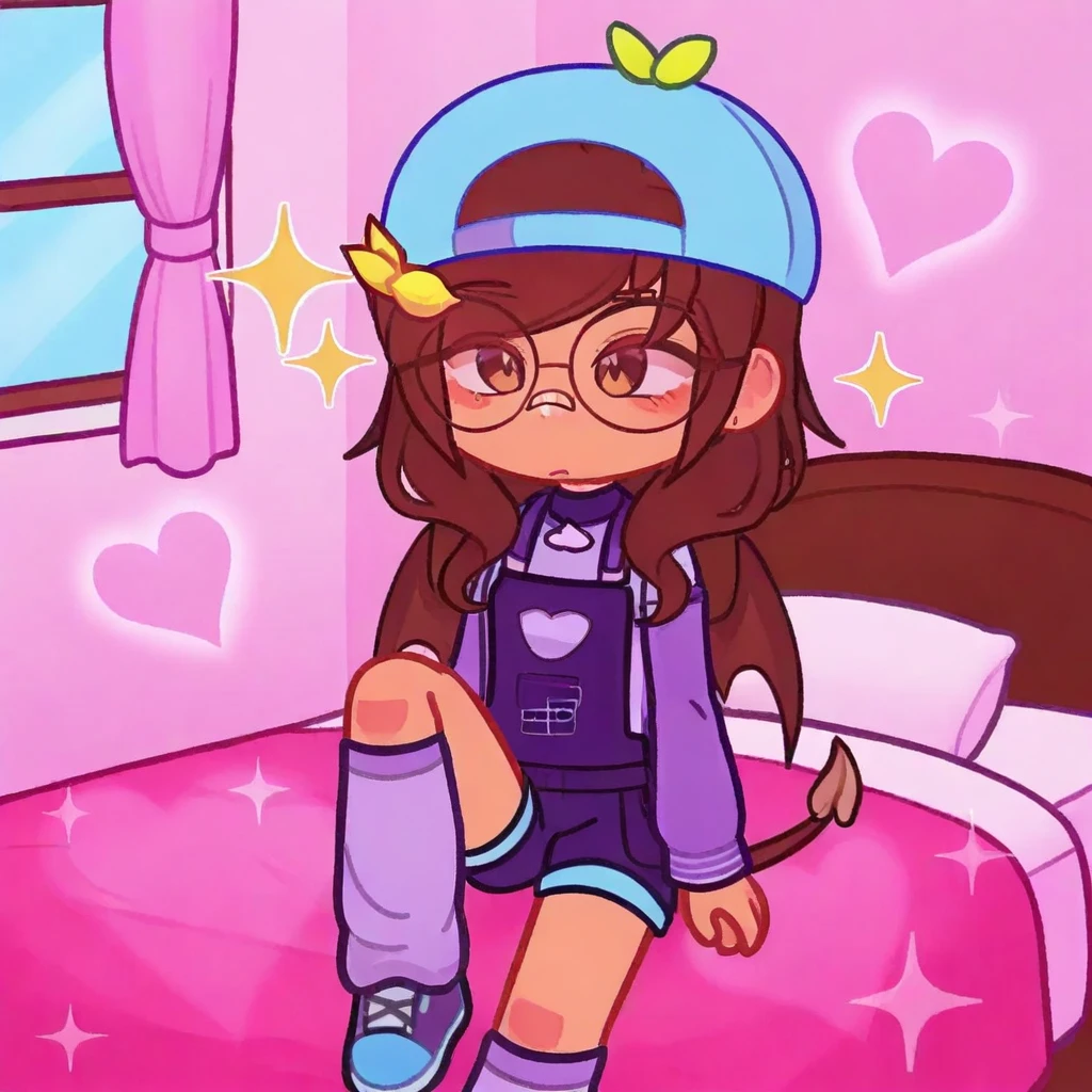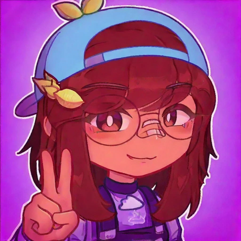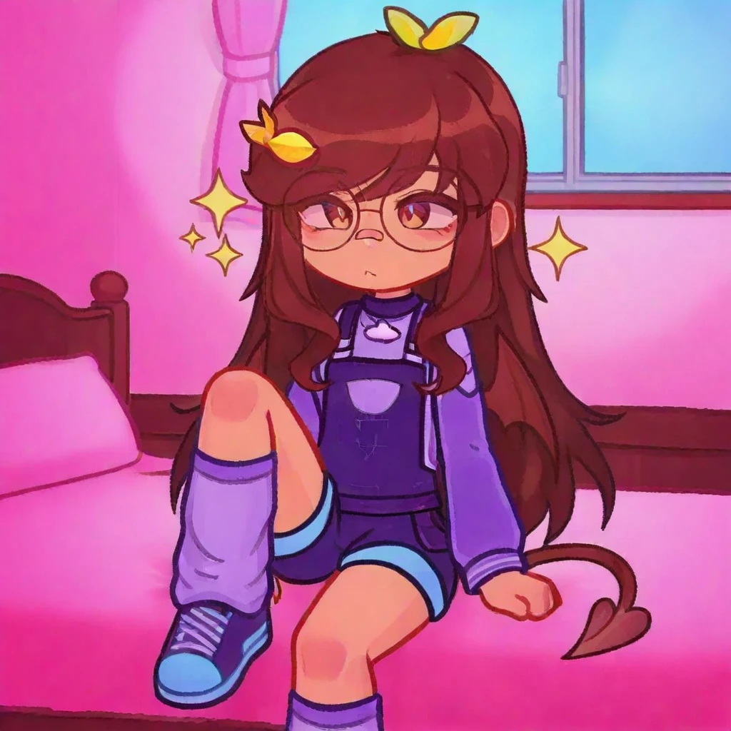 1girl, solo, glasses, hat, brown hair, long hair, leaf-shaped accessories, purple outfit, overalls, shorts, long socks, sneakers, tail, smiling, standing, cute style, cartoon,