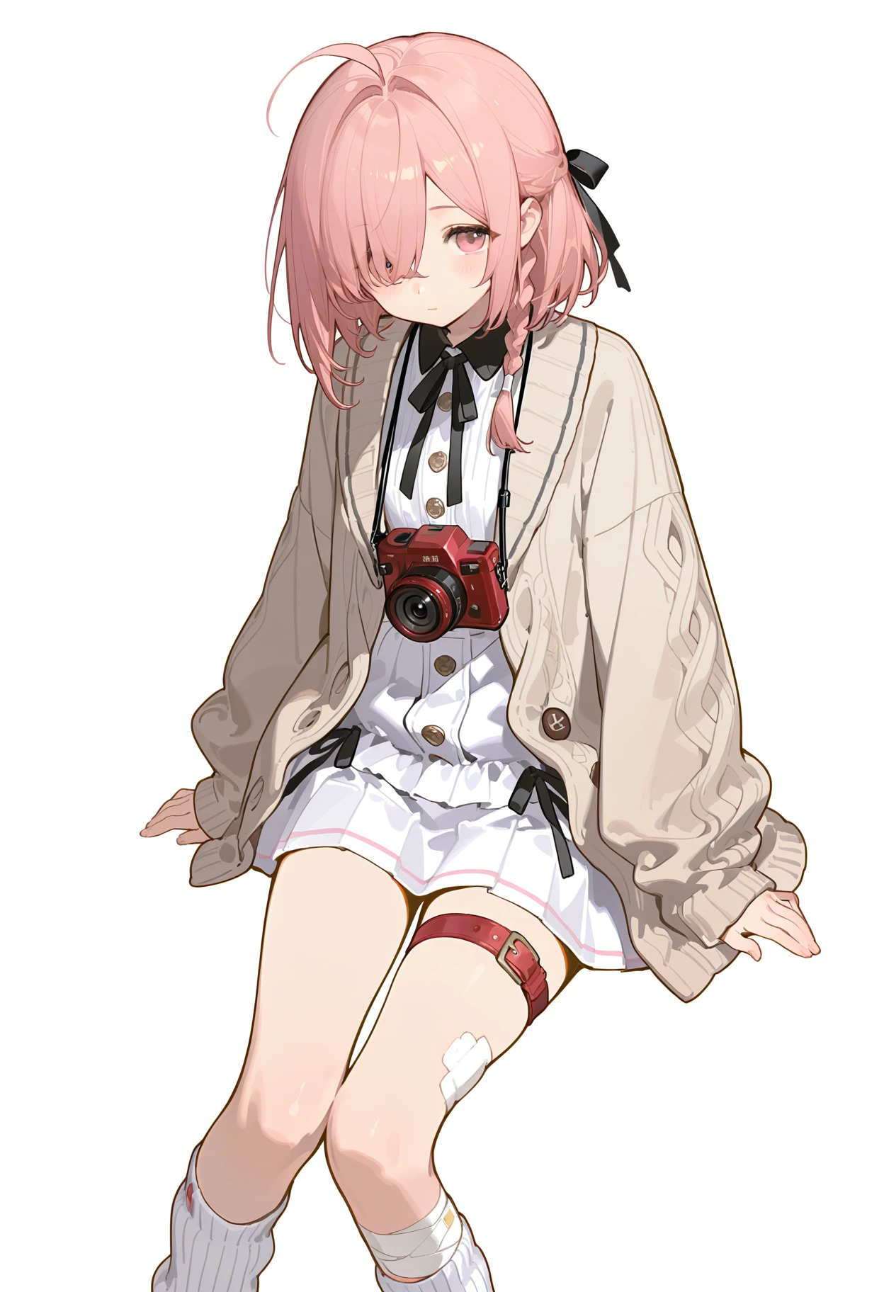 skuld (aether gazer) 1, 1girl, solo, pink hair, black ribbon, single braid, long sleeves, pink eyes, cardigan, hair ribbon, jacket, medium hair, neck ribbon, hair over one eye, white dress, black bow, white shirt, white skirt, ahoge, red thigh strap, loose socks, white socks, camera around neck, bandaged leg款式二