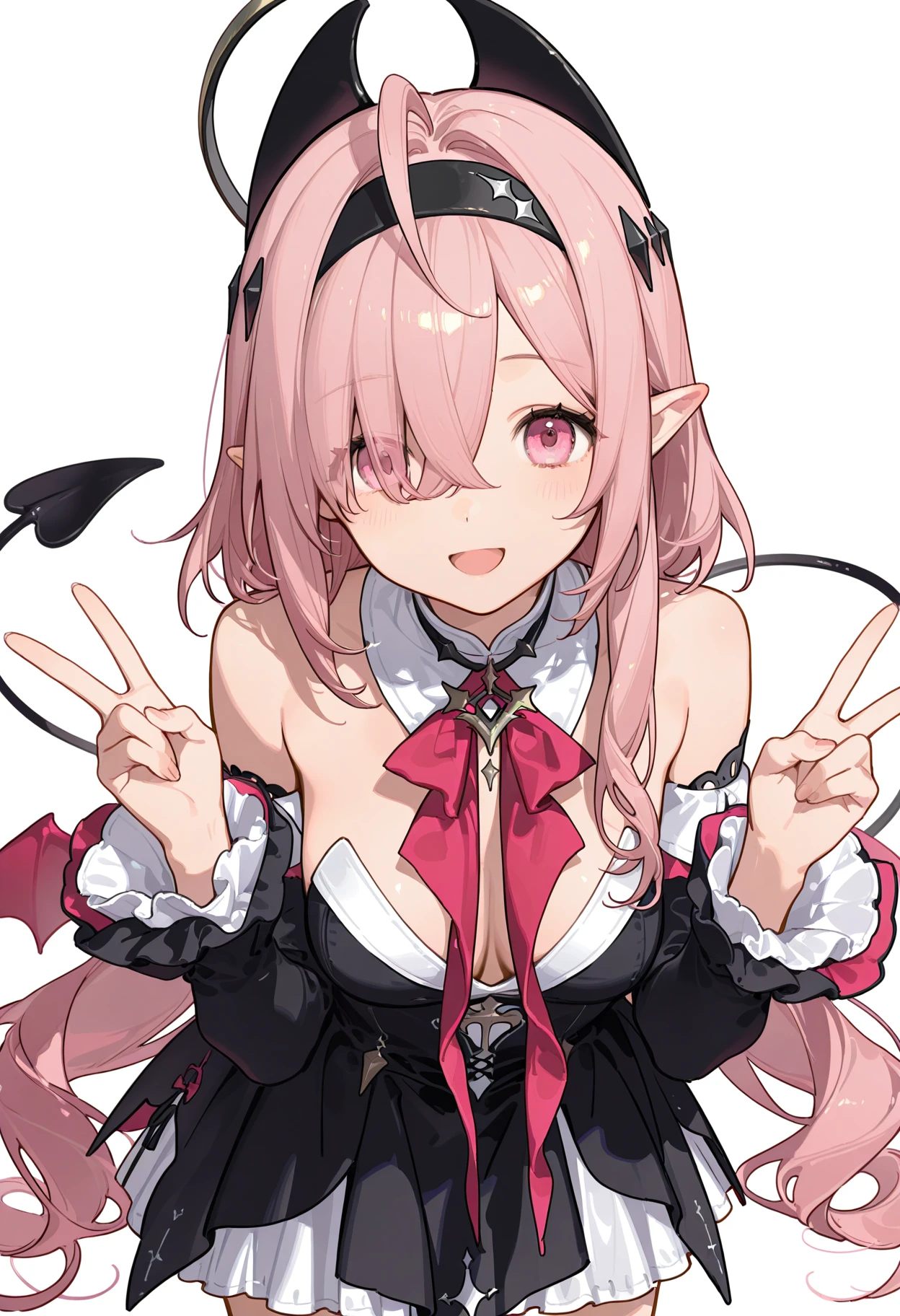 skuld (aether gazer), 1girl, solo, ahoge, frilled sleeves, frills, hair ornament, shoulders, very long hair, detached sleeves, pointy ears, black dress, black hairband, long sleeves, light pink hair, pink eyes, black sleeves, (hair over one eye:1.1), detached collar, , demon tailPS:怎么游戏里一直在吃保底啊,没招了...
