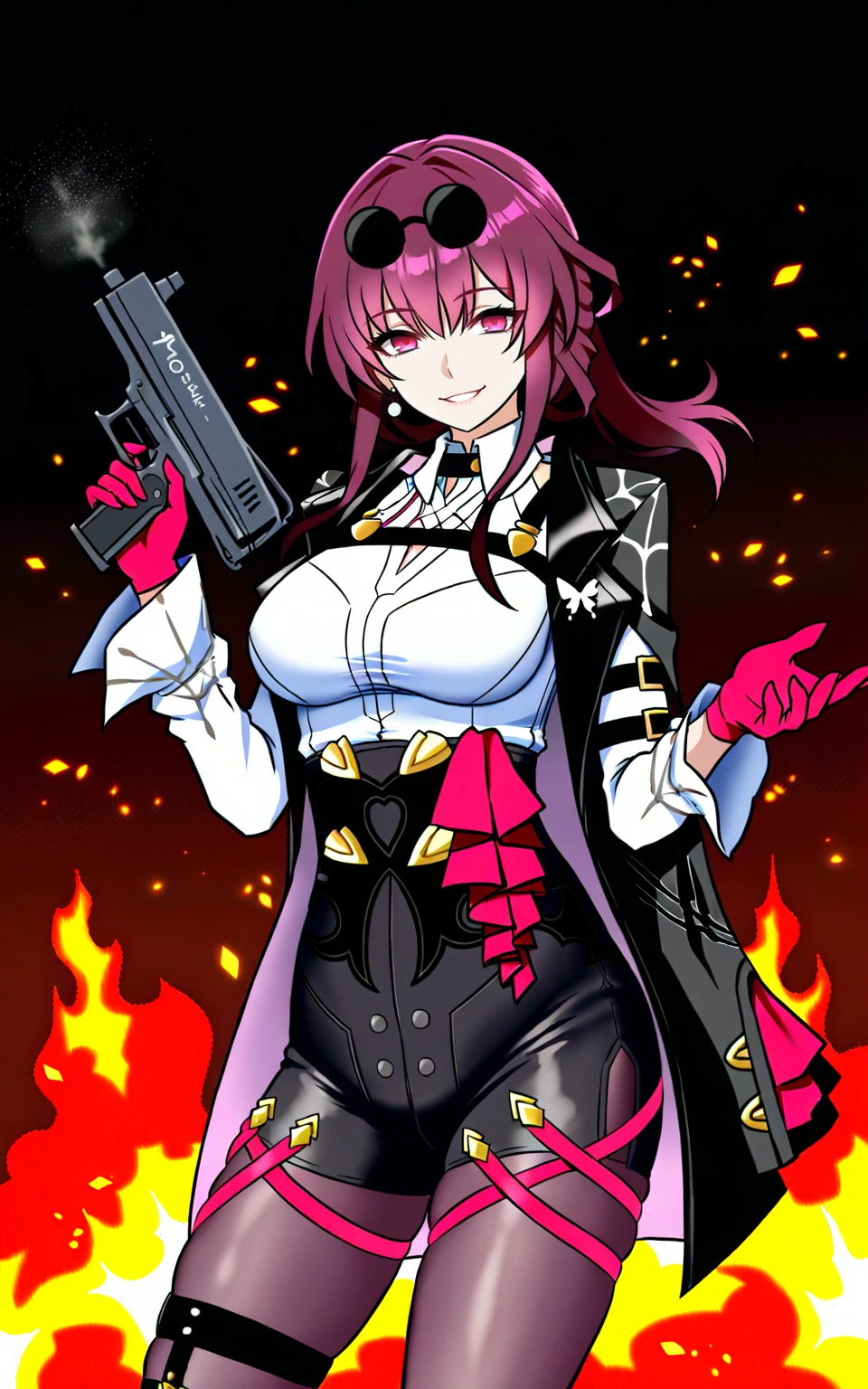 stelhun outfit, eyewear on head, round eyewear, earrings, shirt, long sleeves, gloves, shorts, jacket, pantyhose, boots, high heels, asymmetrical legwear, thighhigh boots, high heel boots