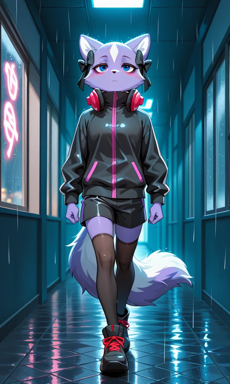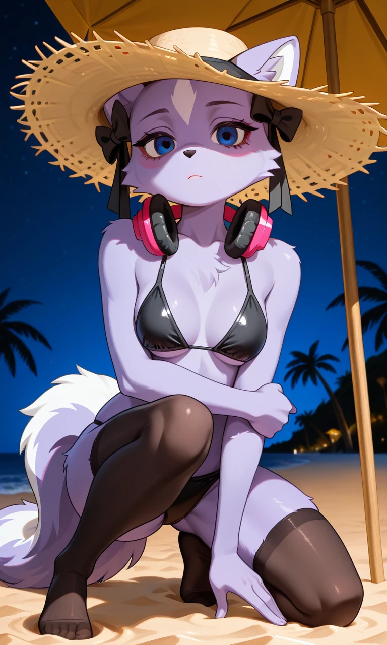 Shikabane_(Aggretsuko), anthro skunk, purple fur, Two-tone one, blue eyes, double ribbons over his ears