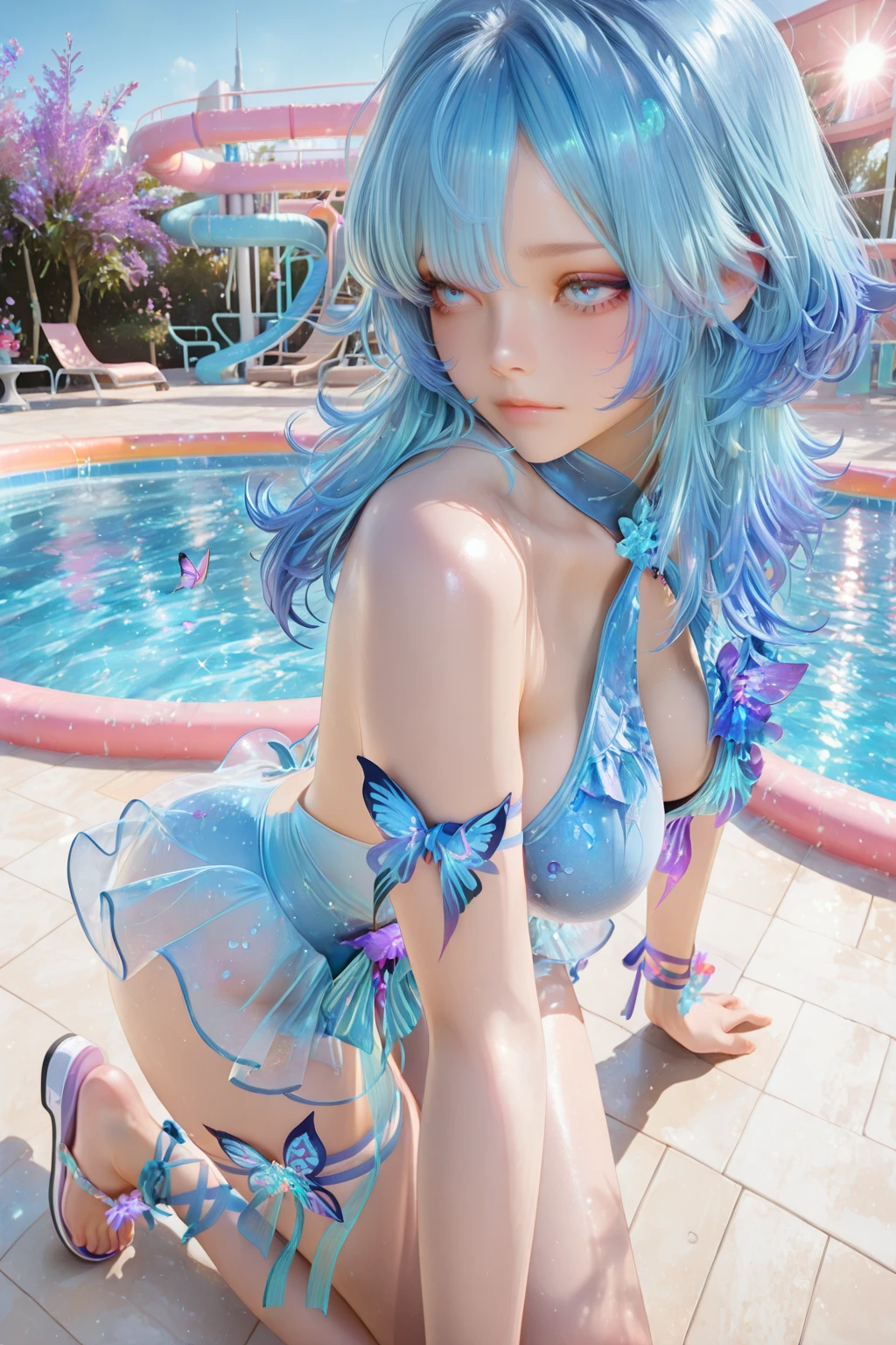 触发词(Trigger word):breasts,blue dress,arm ribbon,butterfly,flower,halterneck,leg ribbon,leotard,one-piece swimsuit,ribbon,sandals,see-through,sideboob,thigh strap,