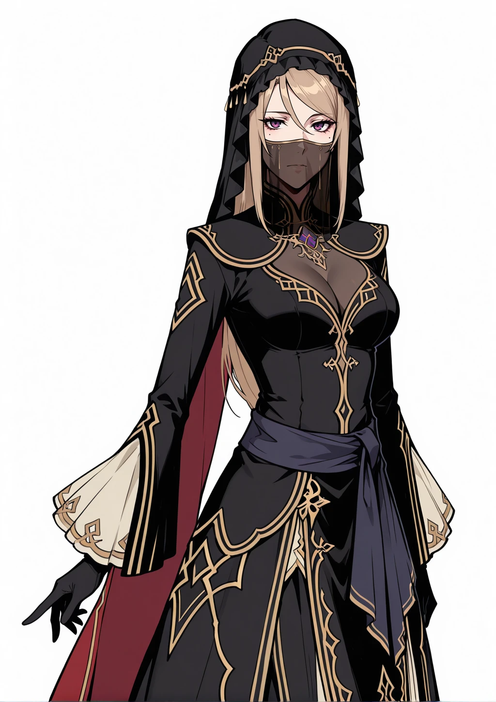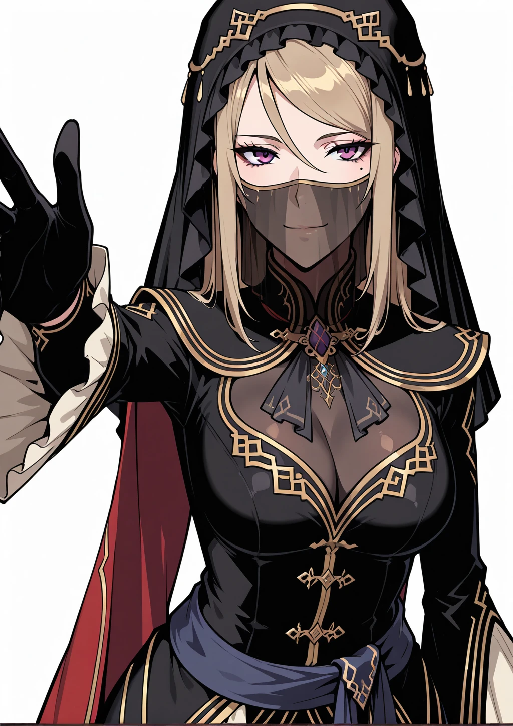 yekaterina, blonde hair, swept bangs, hair between eyes, sidelocks, purple eyes, single mole under eye, black veil, mouth veil, black dress, high collar dress, black see-through cleavage, wide sleeves, white frilled sleeves, long skirt, layered skirt, red lining skirt, gold trim, black gloves, dark blue sash, red cape, black pantyhose, black platform heels