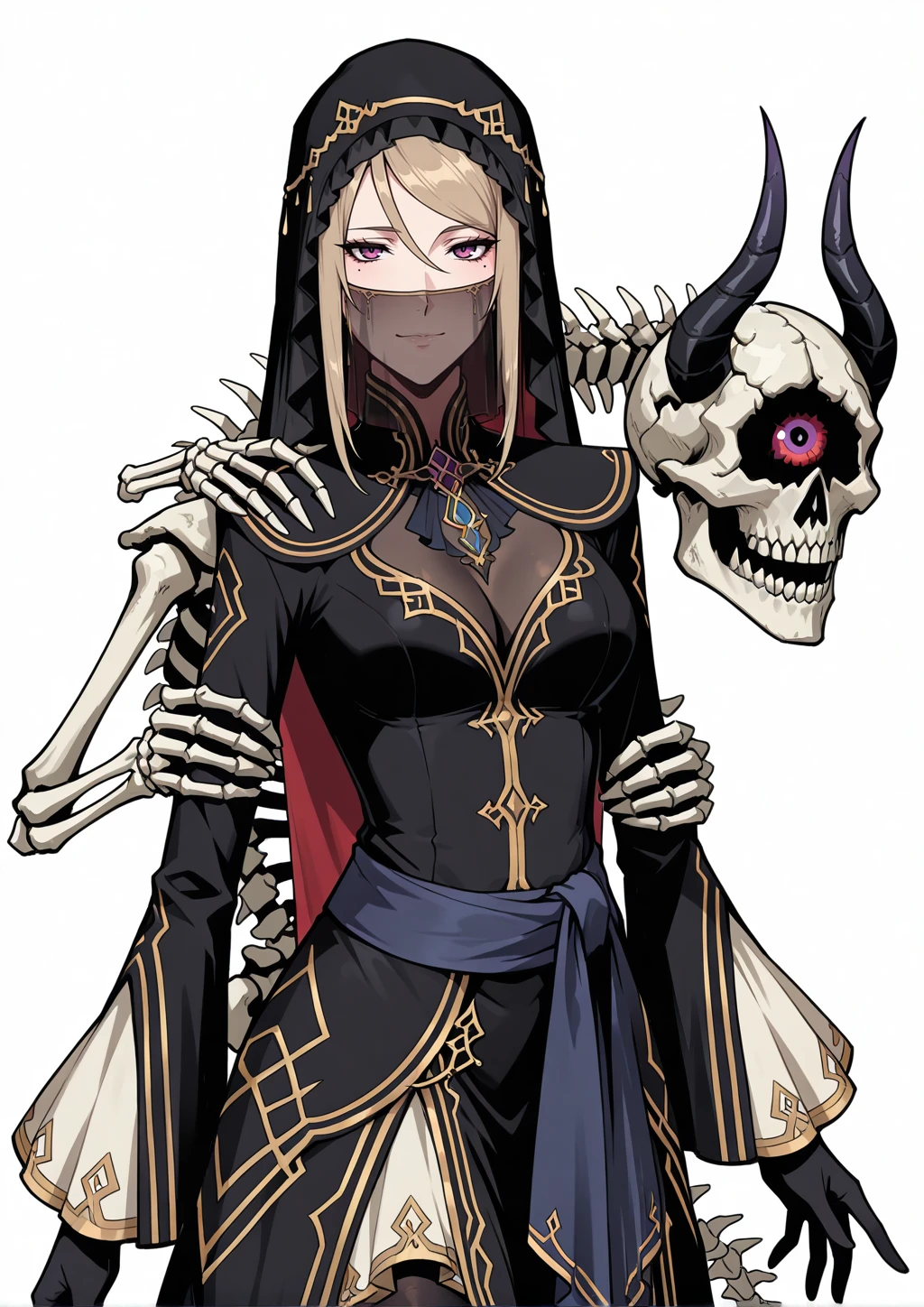 yekaterina, 1girl, blonde hair, swept bangs, hair between eyes, sidelocks, purple eyes, single mole under eye, black veil, mouth veil, black dress, high collar dress, black , wide sleeves, white frilled sleeves, long skirt, layered skirt, red lining skirt, gold trim, black gloves, dark blue sash, red cape, black pantyhose, black platform heelsdemon skeleton, red eye skeleton, cyclops skeleton, bone tail, skeleton cuddling, skeleton hands on shoulder, grabbing girl's arm, skeleton leg around waist, skeleton behind girlDescription