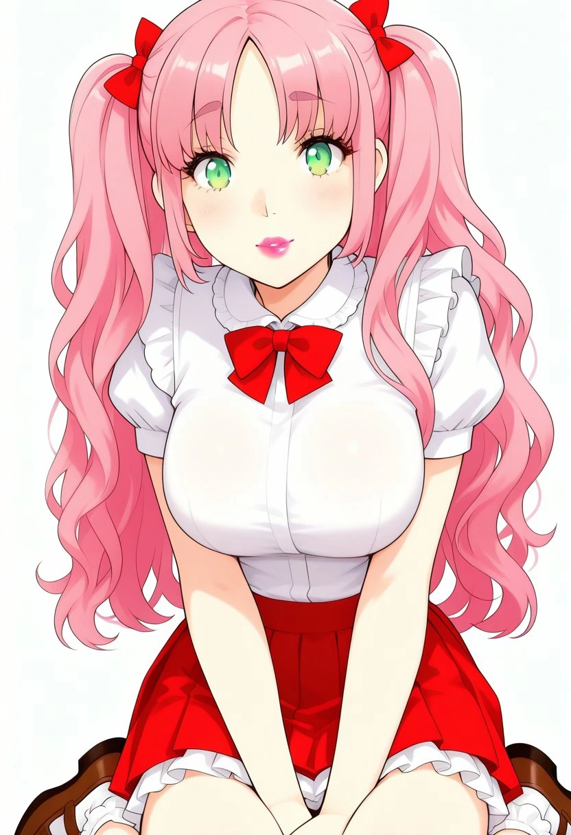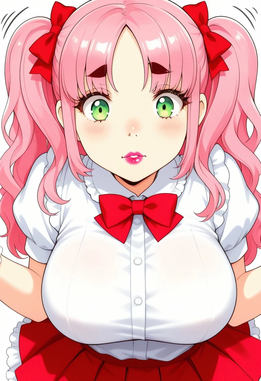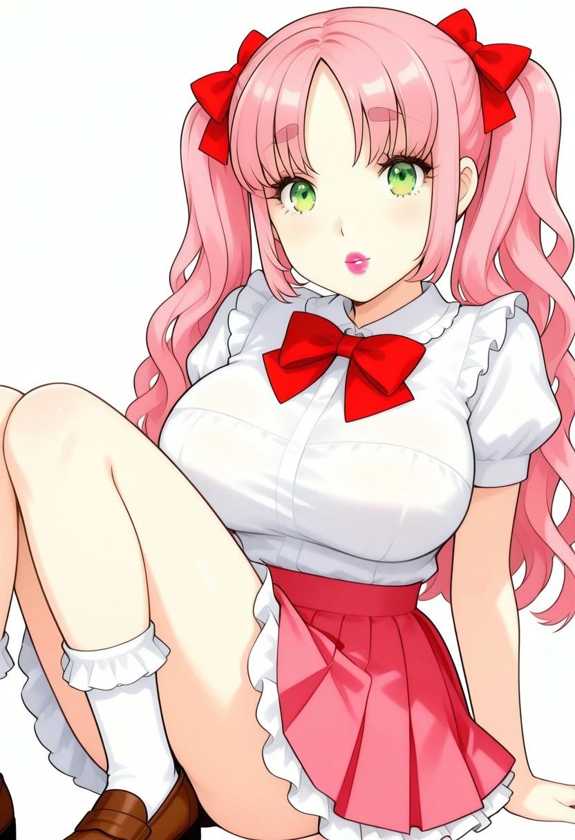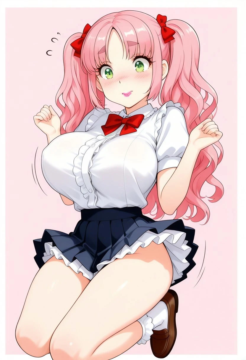 masterpiece, best quality, highly detailed, sharp focus, manga art style, anime, kawaii, 1girl, solo, cute girl, round feminine green eyes, petite , thin eyebrows, small nose, cute nose, thin feminine body, (busty:1.1), large breasts, eyelashes, thin eyebrows, pink hair, parted bangs, wavy hair, twintails, red hairbows, supple lips, lipstick, white blouse, short sleeves, poofy sleeves, red bowtie, pleated miniskirt, poofy skirt, petticoat, frilly socks, brown loafers,
