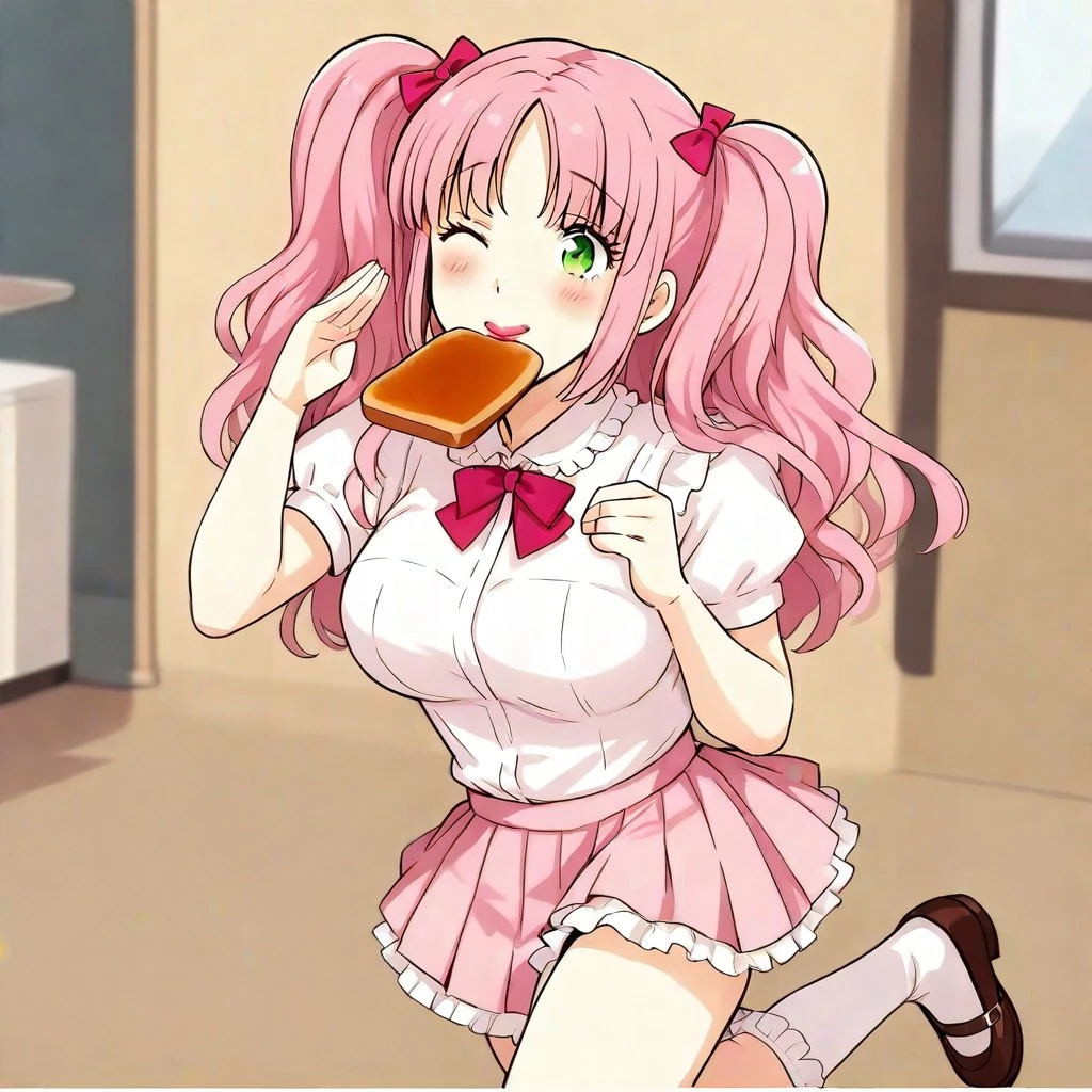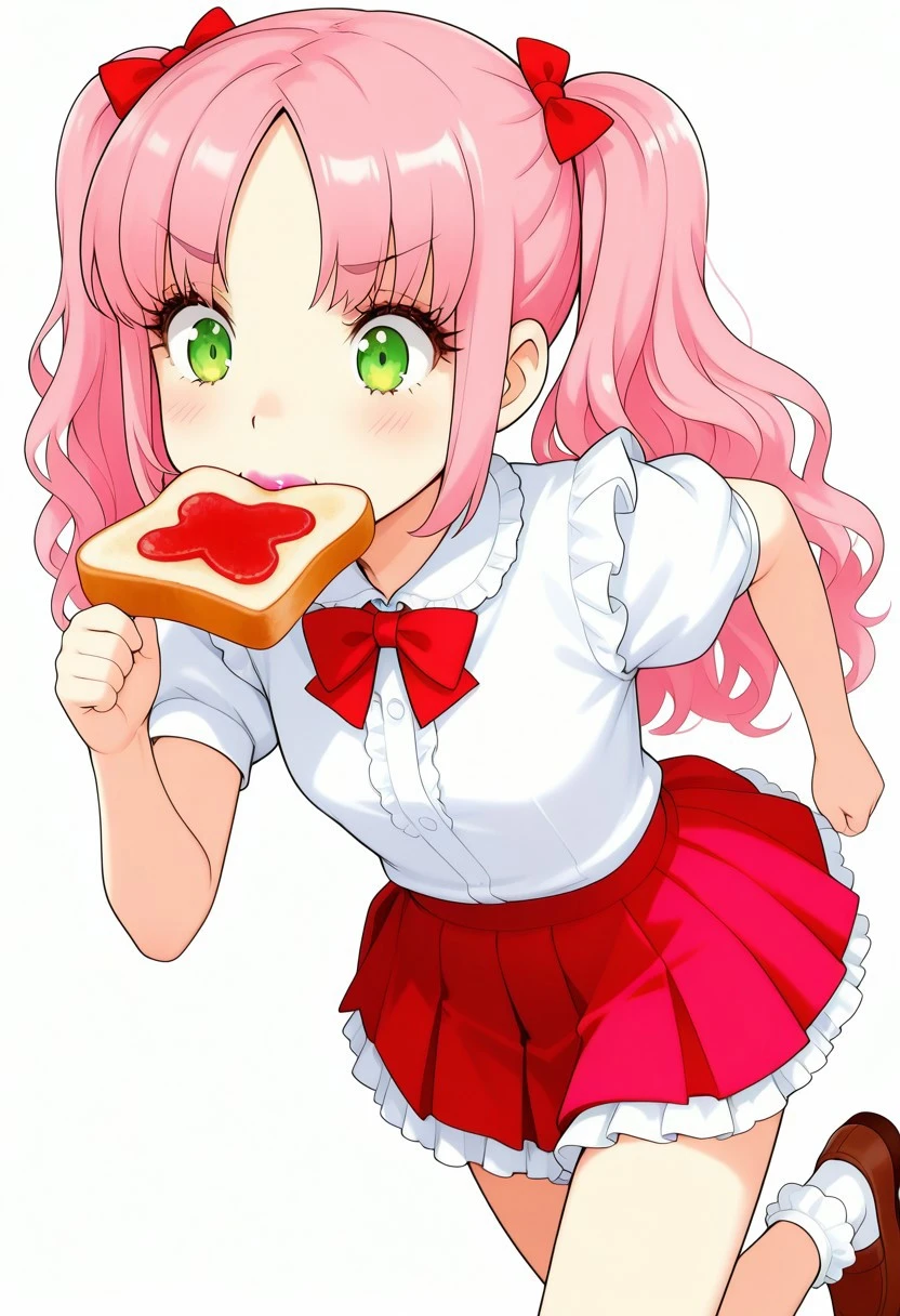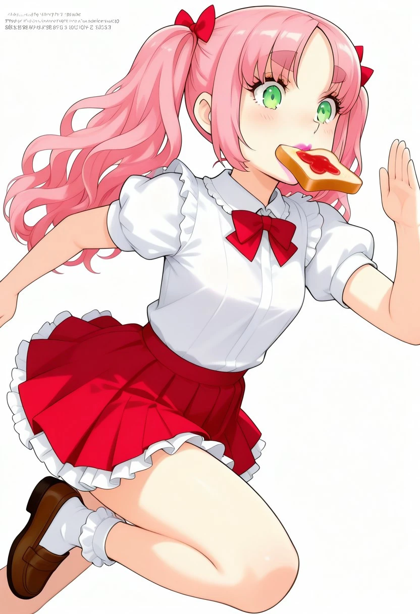 masterpiece, best quality, highly detailed, sharp focus, manga art style, anime, kawaii, 1girl, solo, cute girl, round feminine green eyes, petite , thin eyebrows, small nose, cute nose, thin feminine body, (busty:1.1), large breasts, eyelashes, thin eyebrows, pink hair, parted bangs, wavy hair, twintails, red hairbows, supple lips, lipstick, white blouse, short sleeves, poofy sleeves, red bowtie, pleated miniskirt, poofy skirt, petticoat, frilly socks, brown loafers,