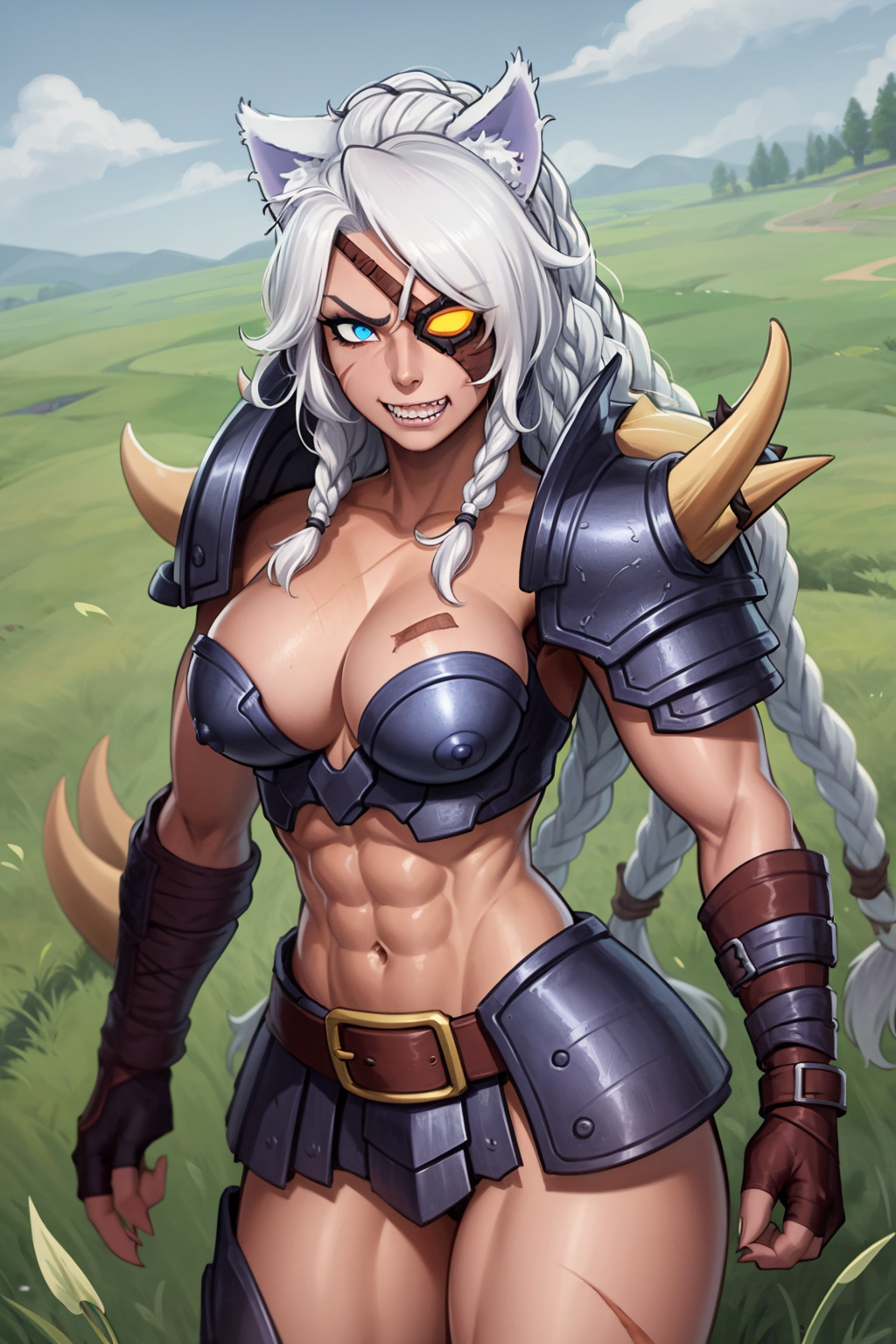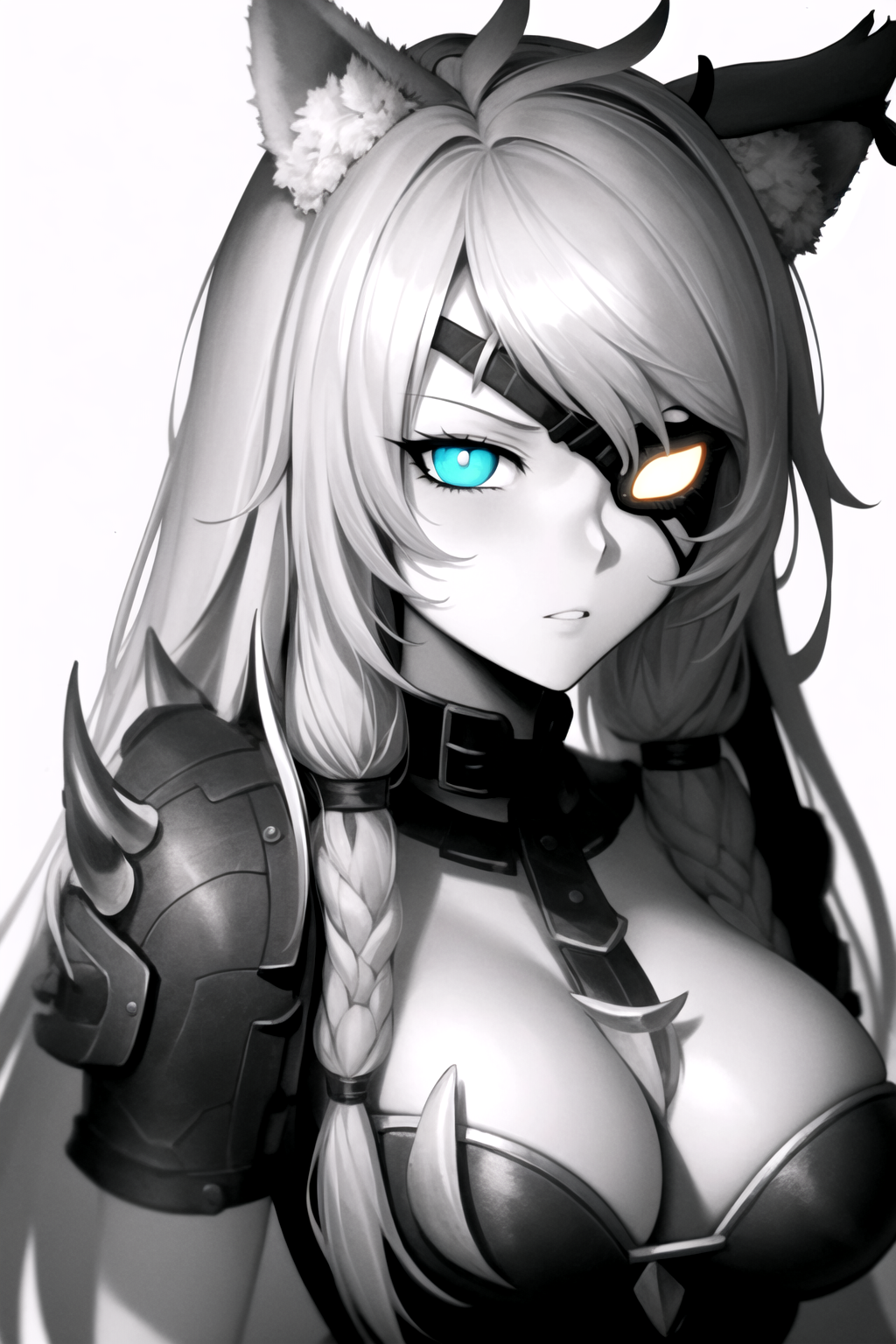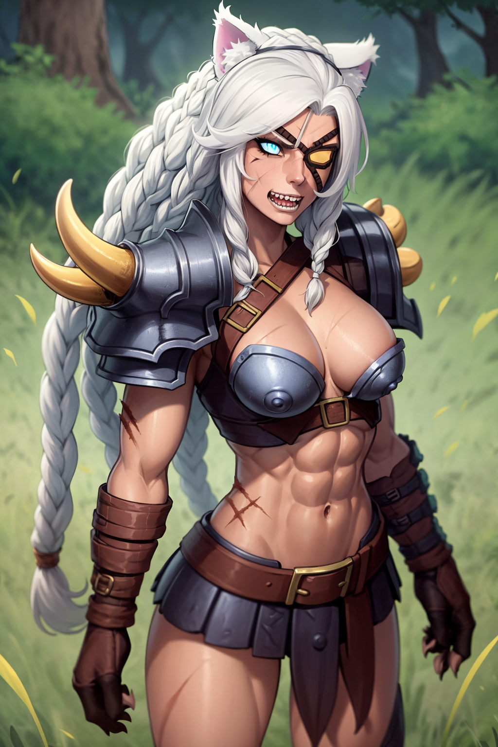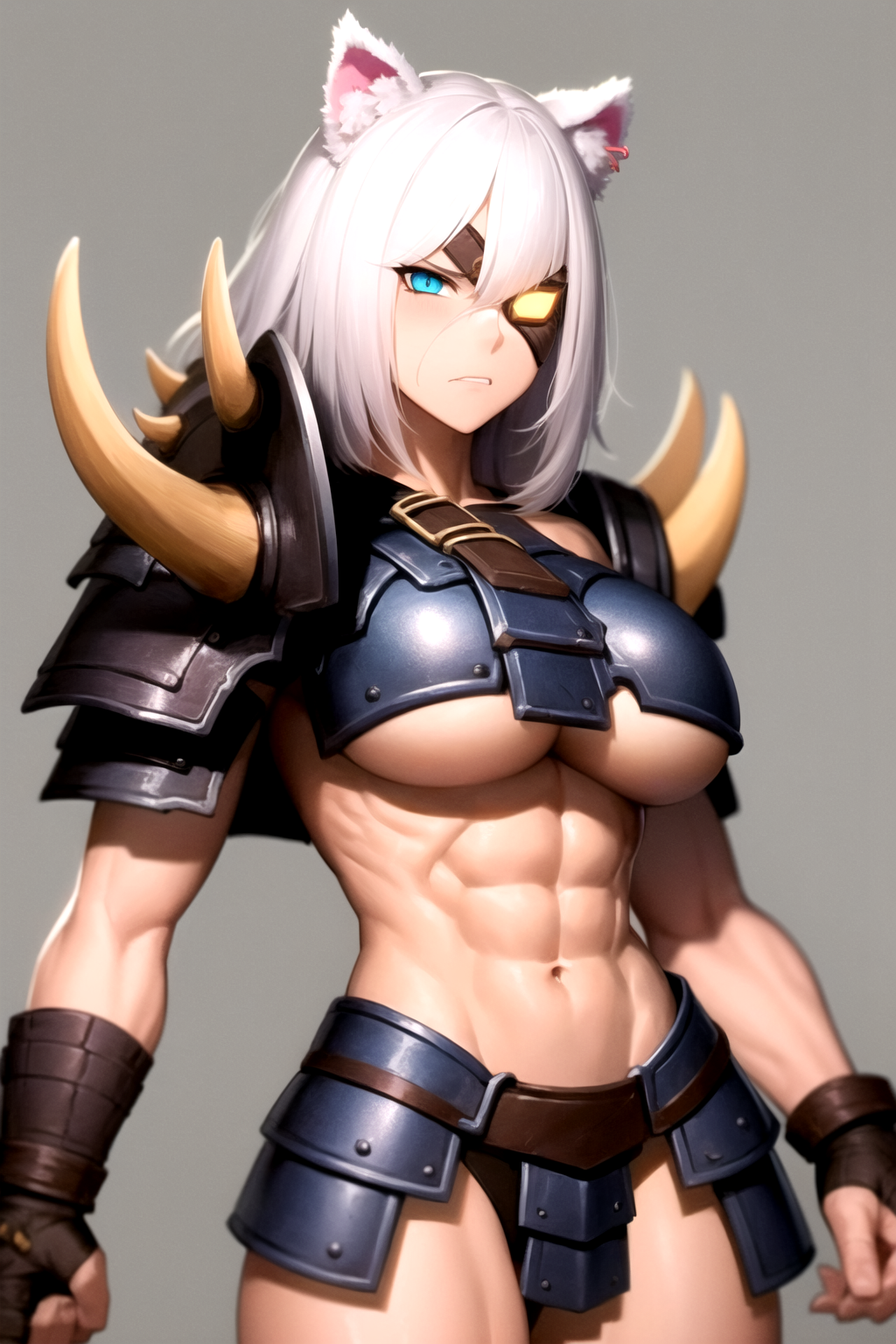 Other prompts : 1girl, cat ears, blue eye, eyepatch, scar, muscular female, abs, shoulder armor, long hair, braid, white hair, cleavage, navel, gloves