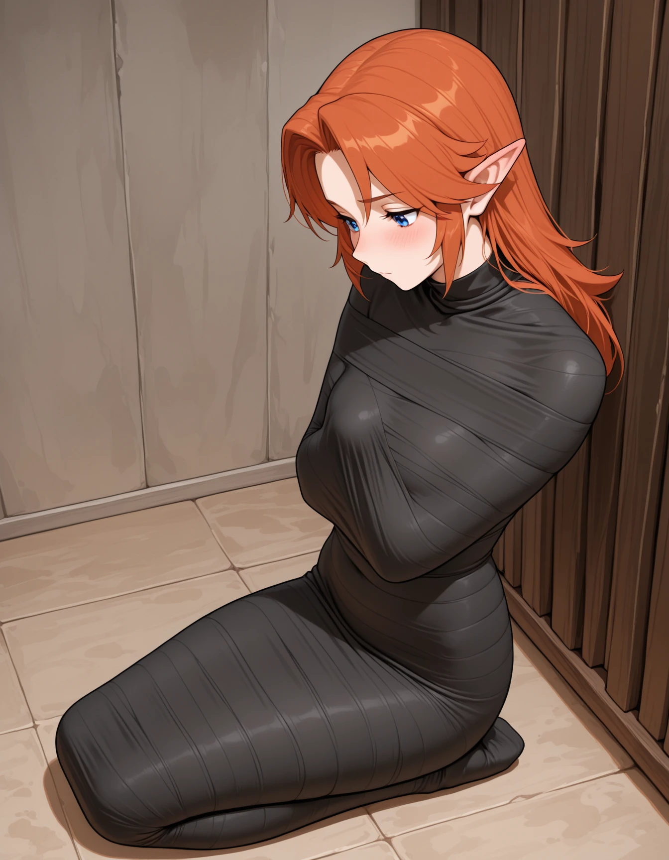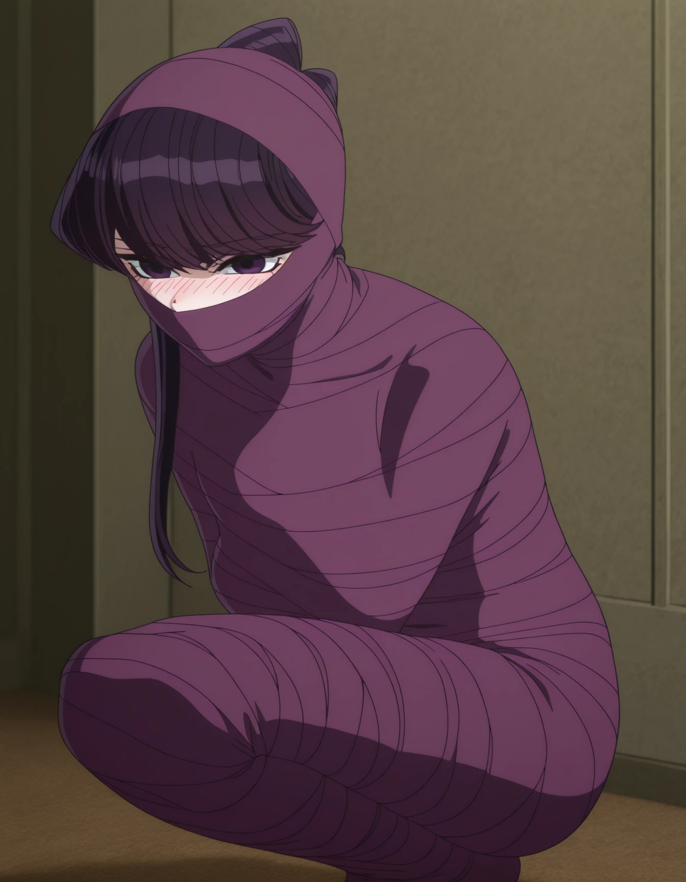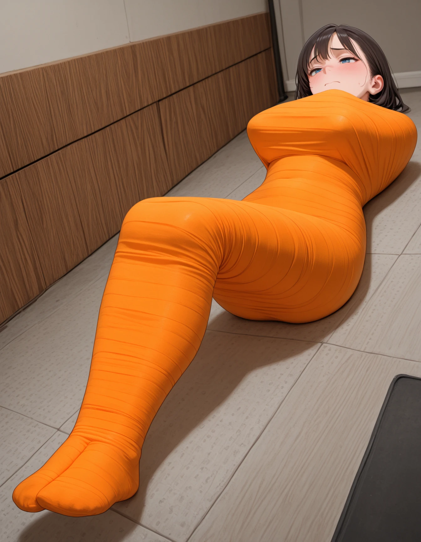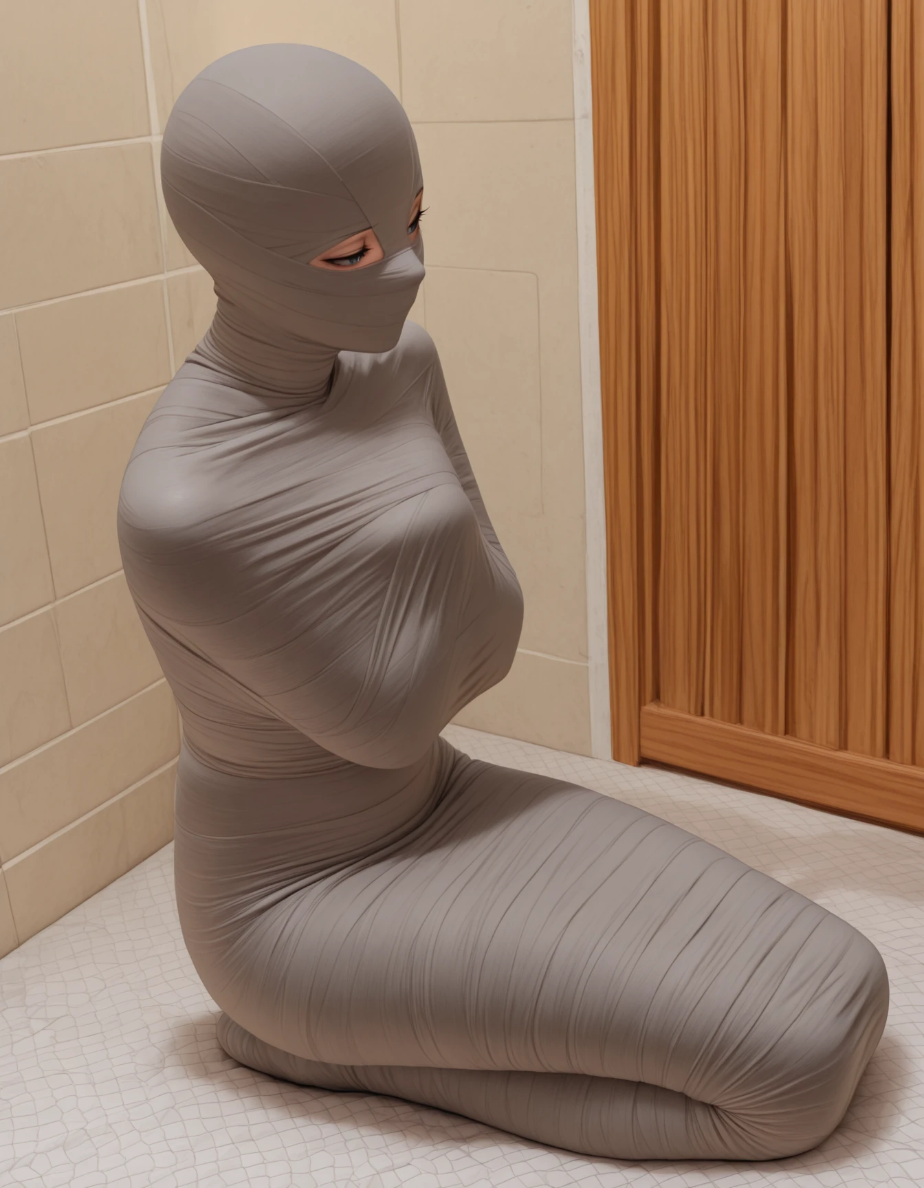 Additional Tags (use as needed): mummification \(bound\), <colour> bandages, covered mouth, covered nose, covered eyes, wrapped head, bandaged head, covered face, arms over chest, arms at sides, arms behind back, arms at sides, bound arms, bound legs, legs together