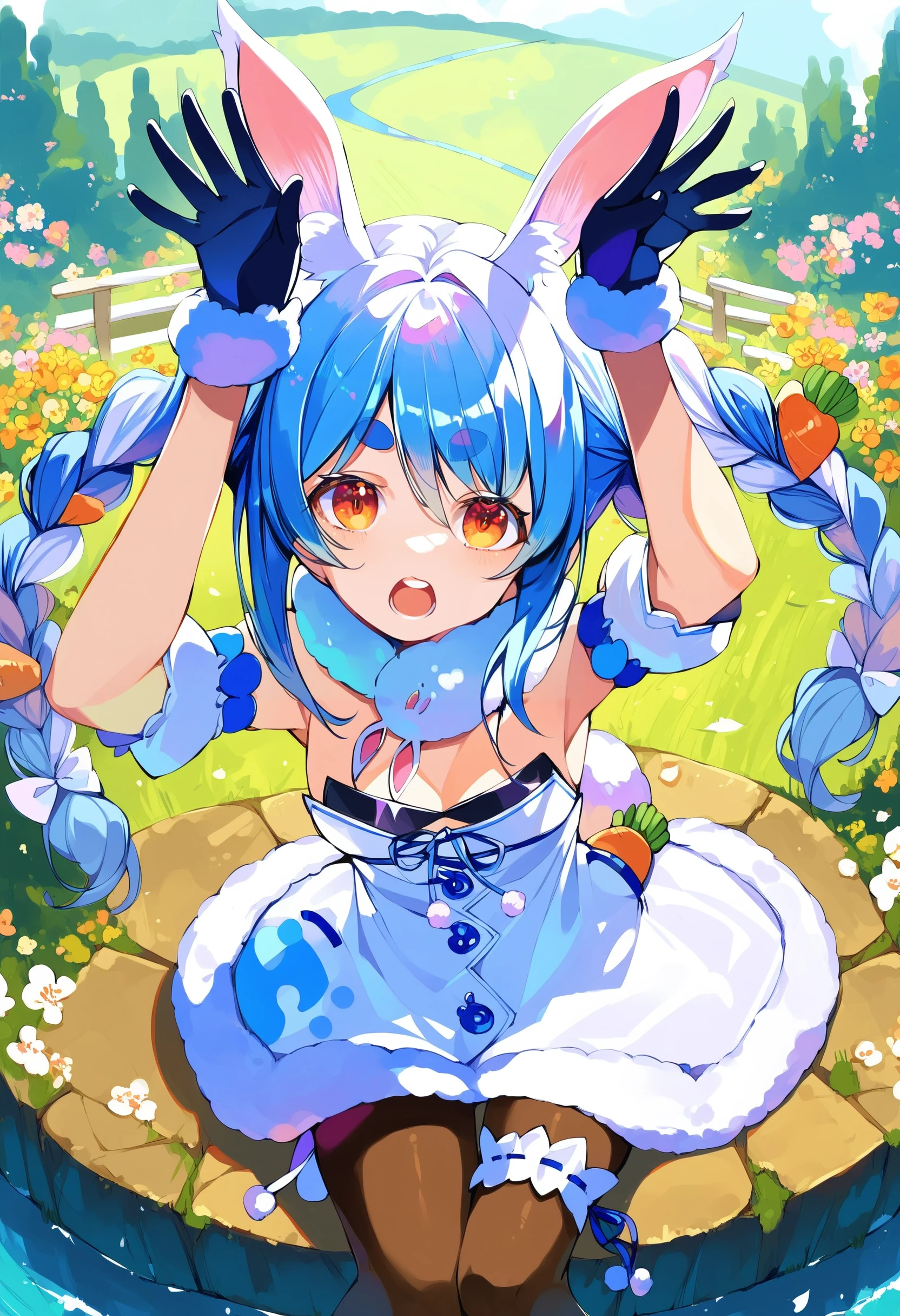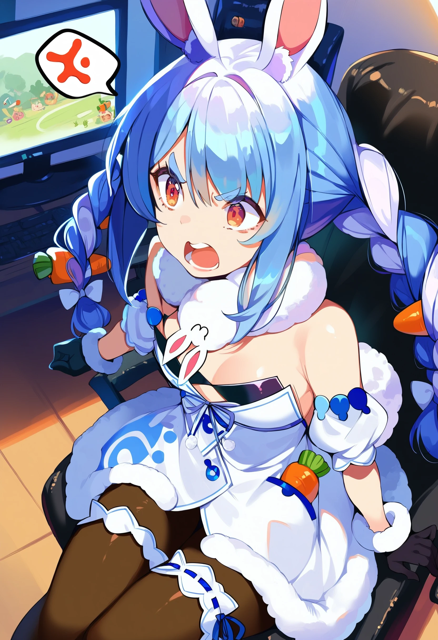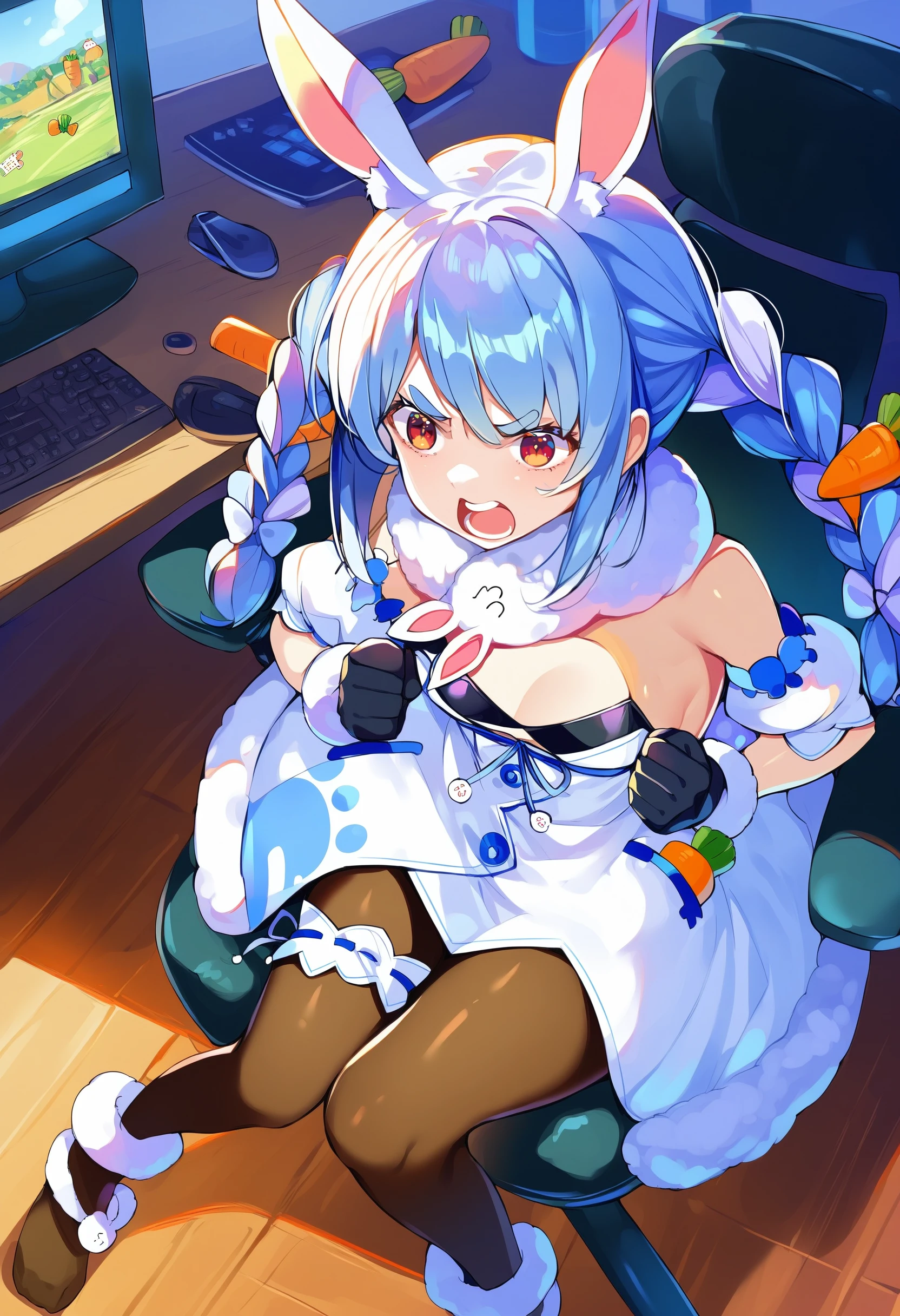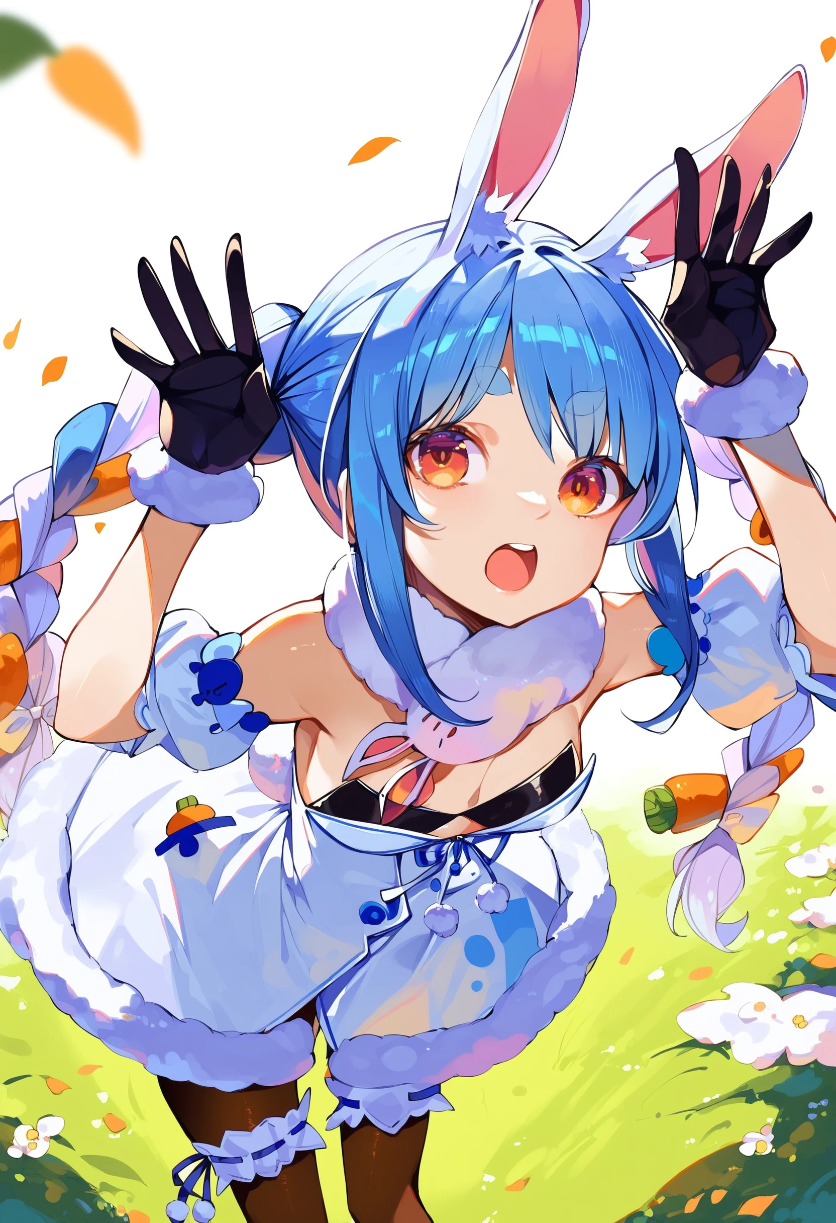 usada pekora, rabbit girl, rabbit ears, animal ear fluff, rabbit tail, twin braids, carrot hair ornament, thick eyebrows,