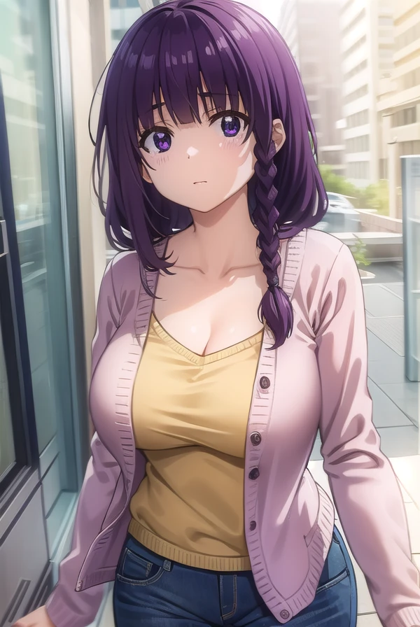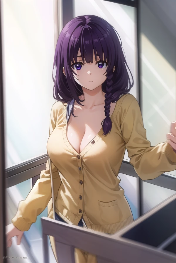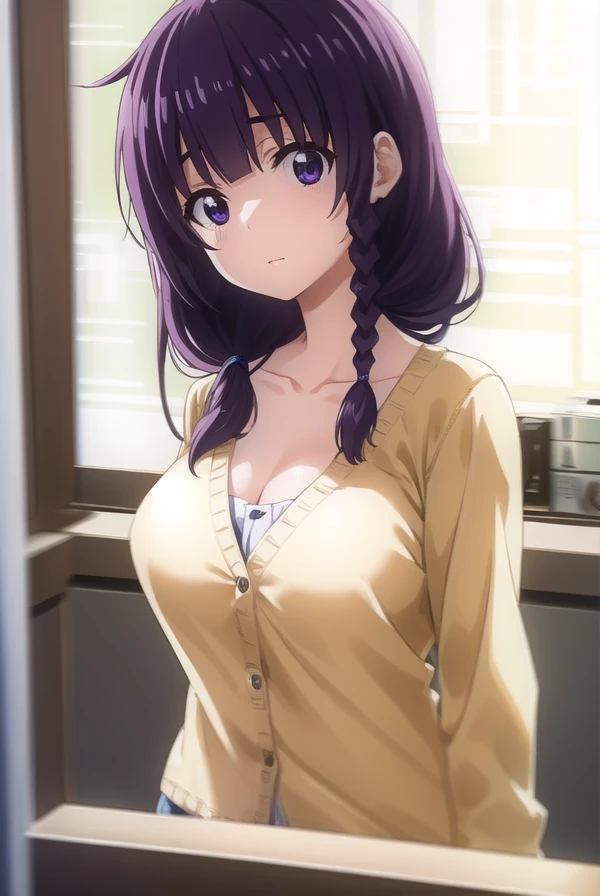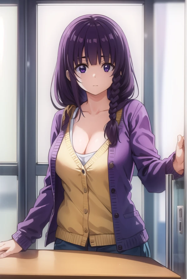 mayu matsukaze, long hair, bangs, purple hair, (purple eyes:1.1), braid, single braid, hair over shoulder,