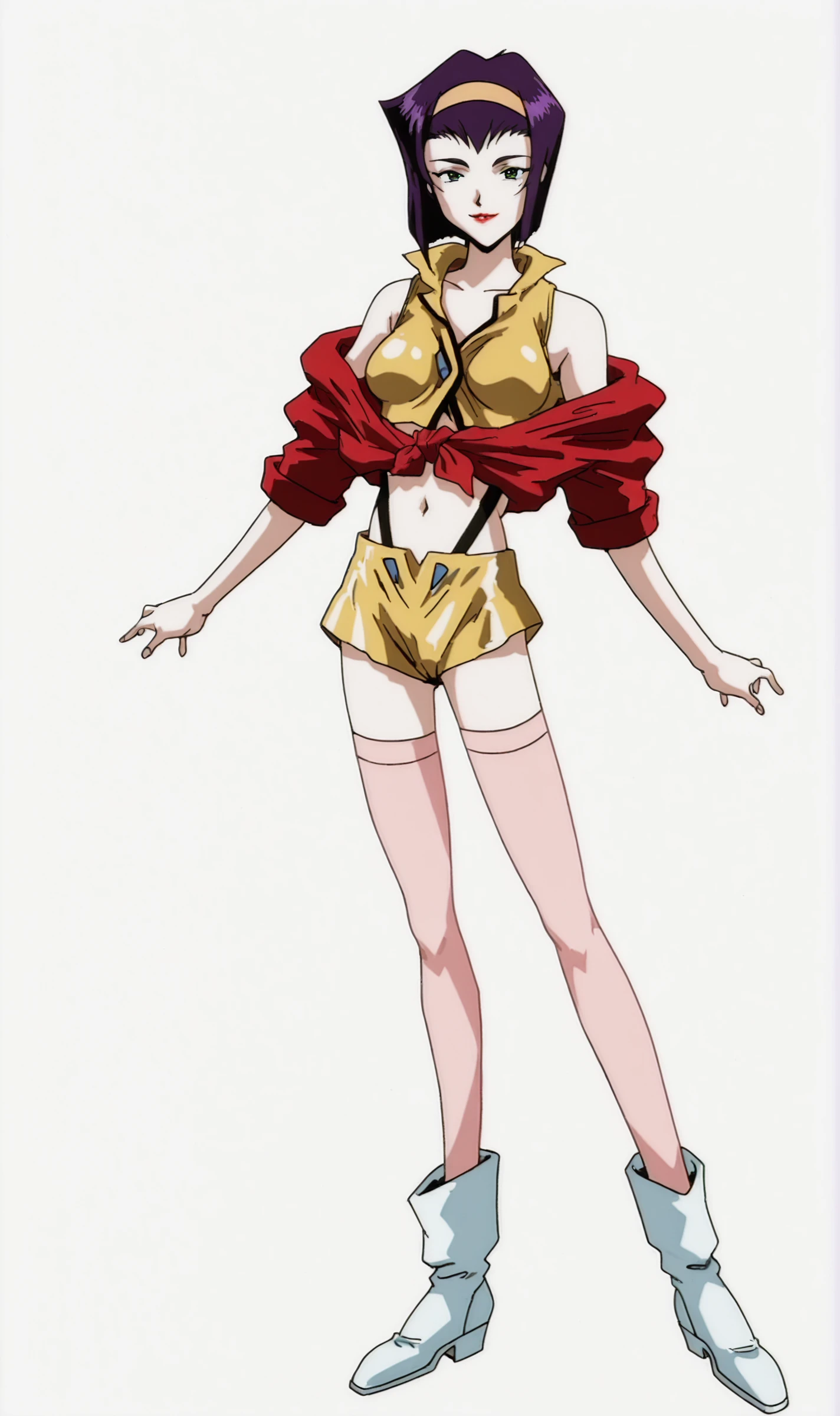 Outfit 1-'yellow vest, red off shoulder jacket, front tied, yellow suspender shorts, thighhighs, boots'