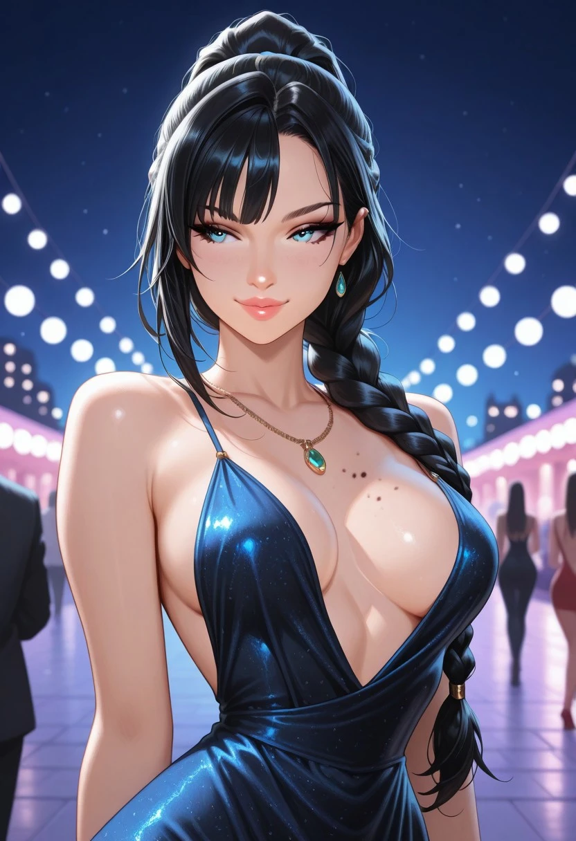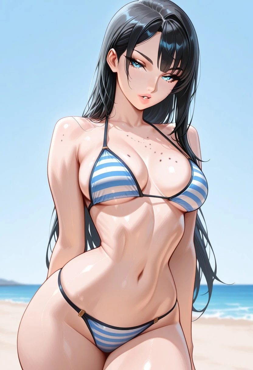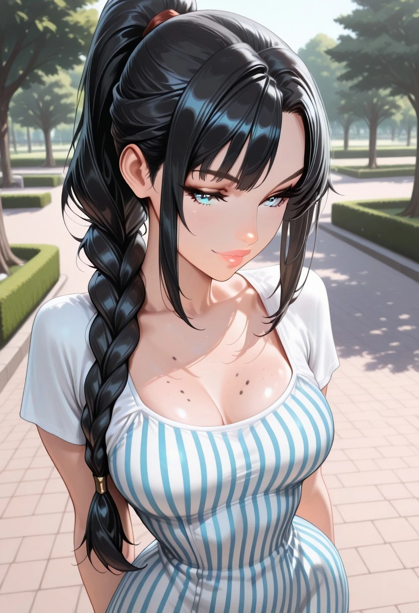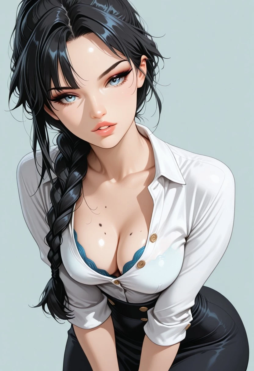 long black hair, swept wispy_bangs, ponytail braid, long braid, icy blue eyes, busty, medium breasts, narrow waist, thin nose, moles, moles on body