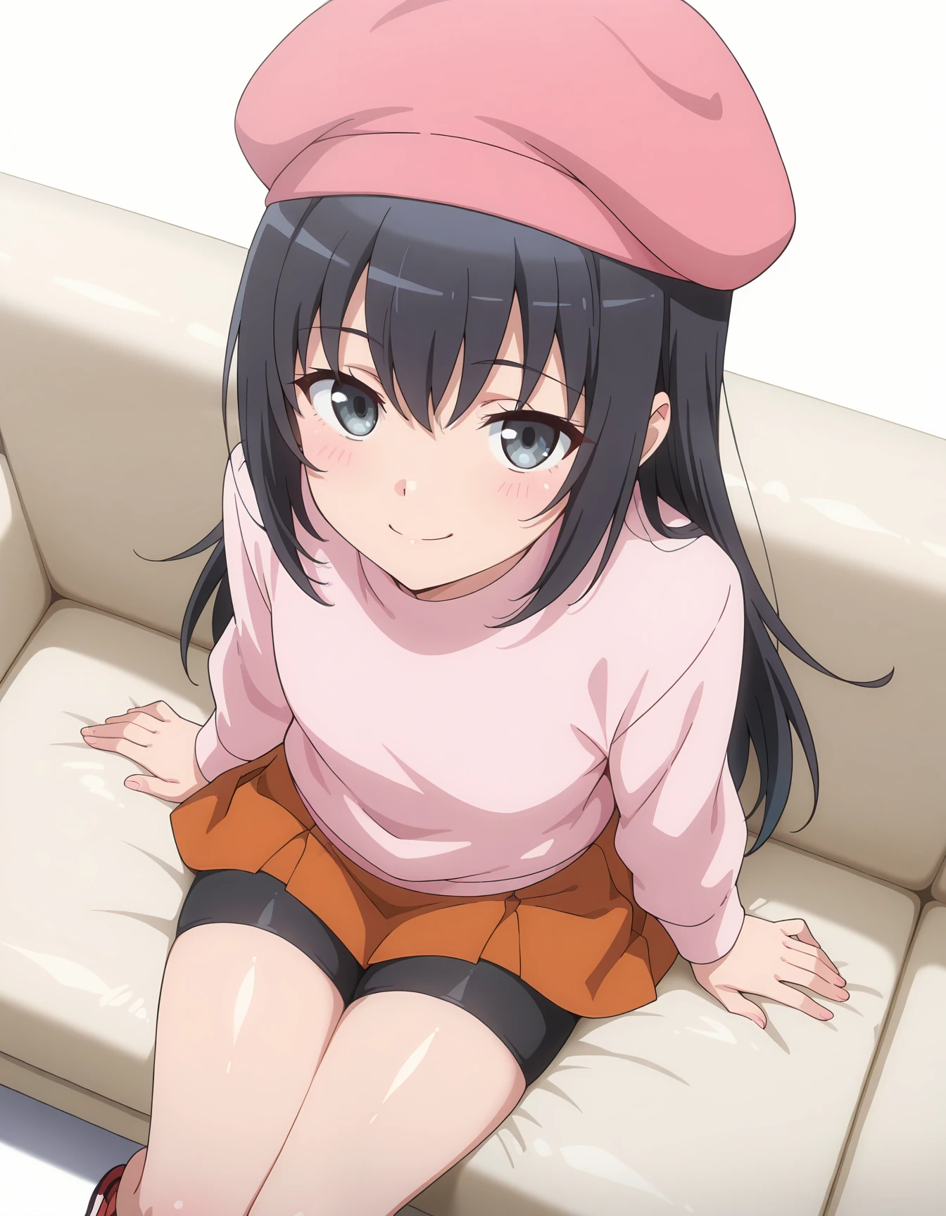 pink sweater,turtleneck,orange pleated skirt,black bike shorts,