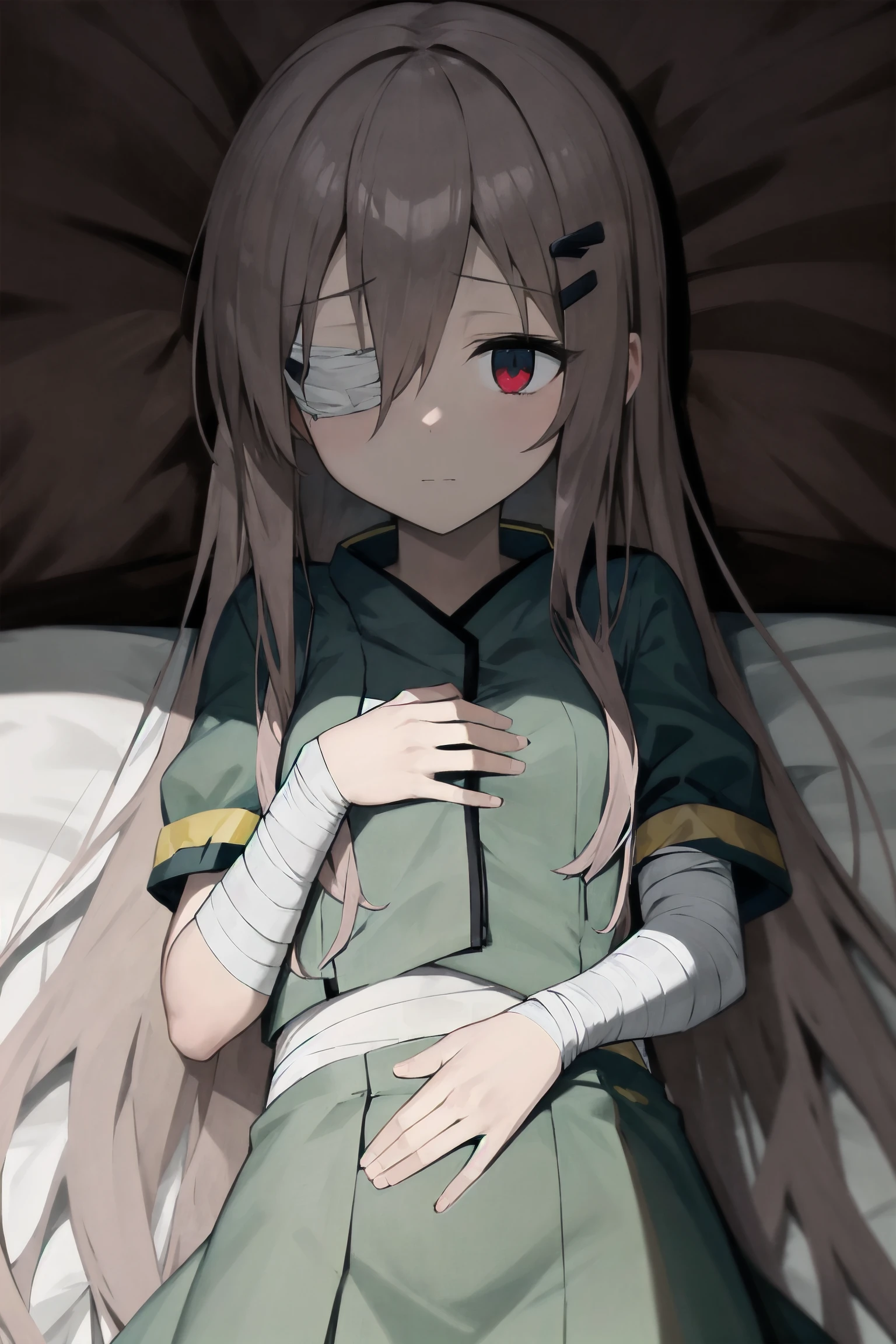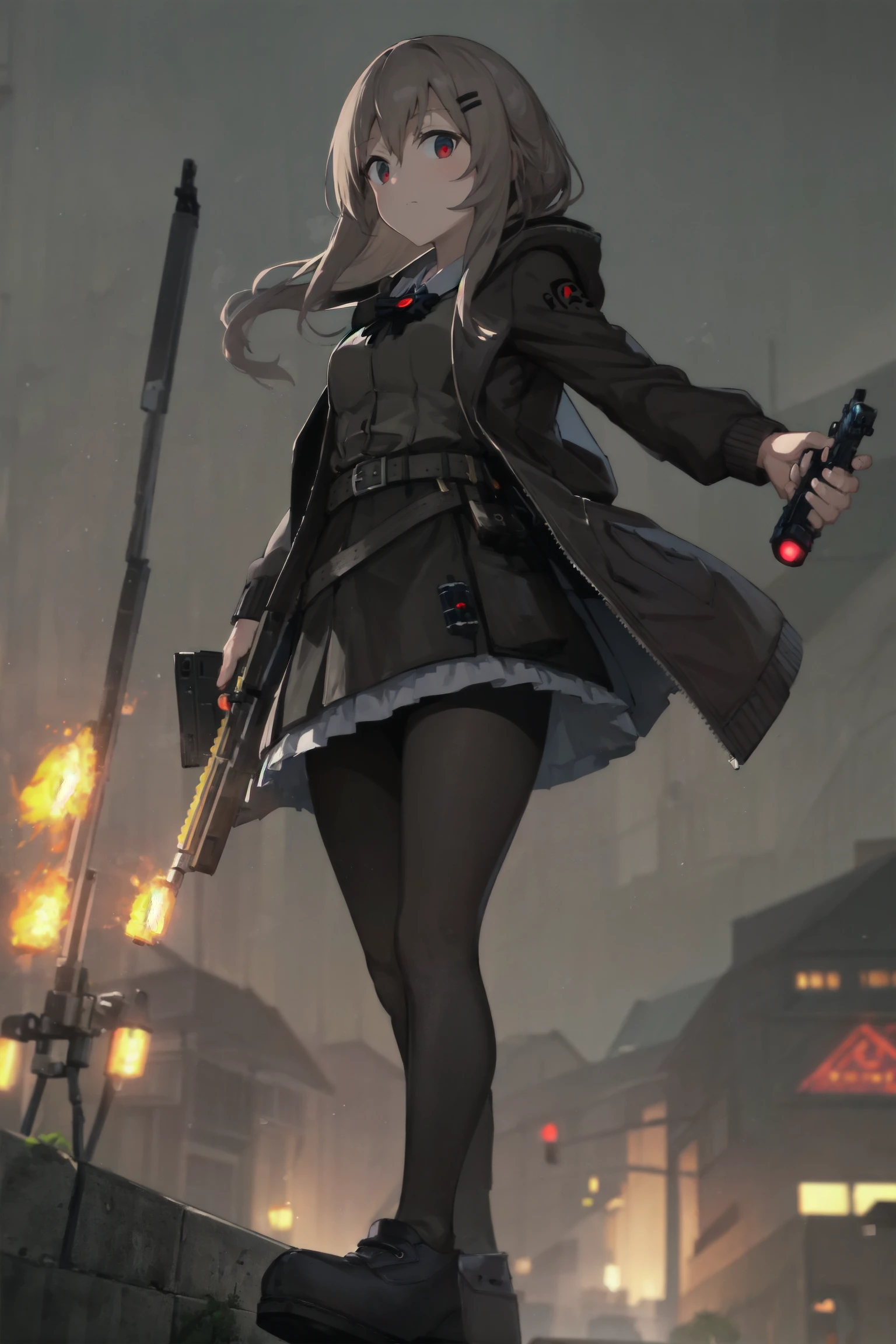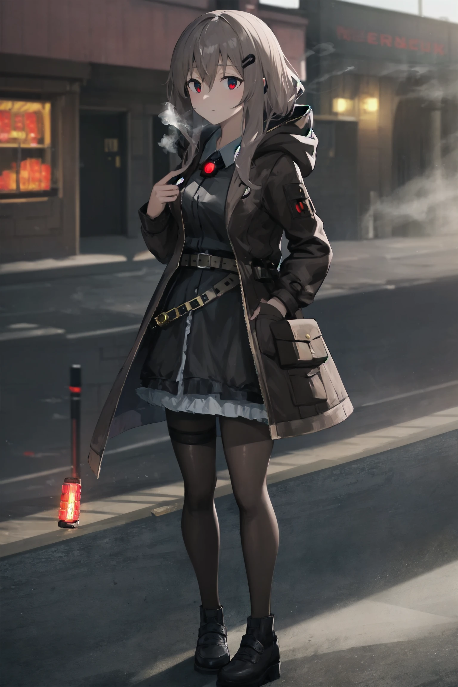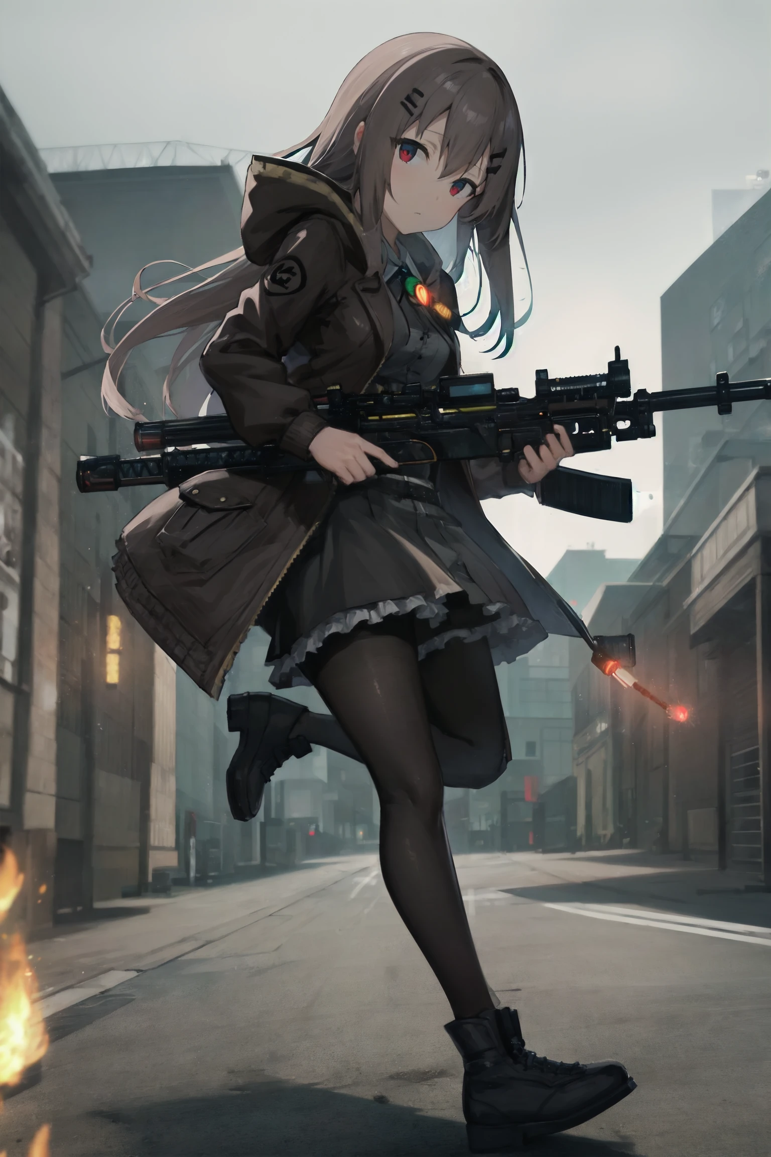 uniform: hairclip, brown coat, hooded coat, long sleeves, brooch, shotgun shell, black dress, belt, frills, brown pantyhose, black footwear