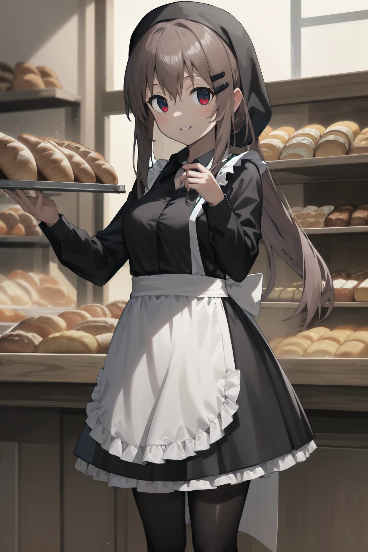 people clothes: hairclip, black dress, collared shirt, long sleeves, frills, black pantyhose, black footwear
