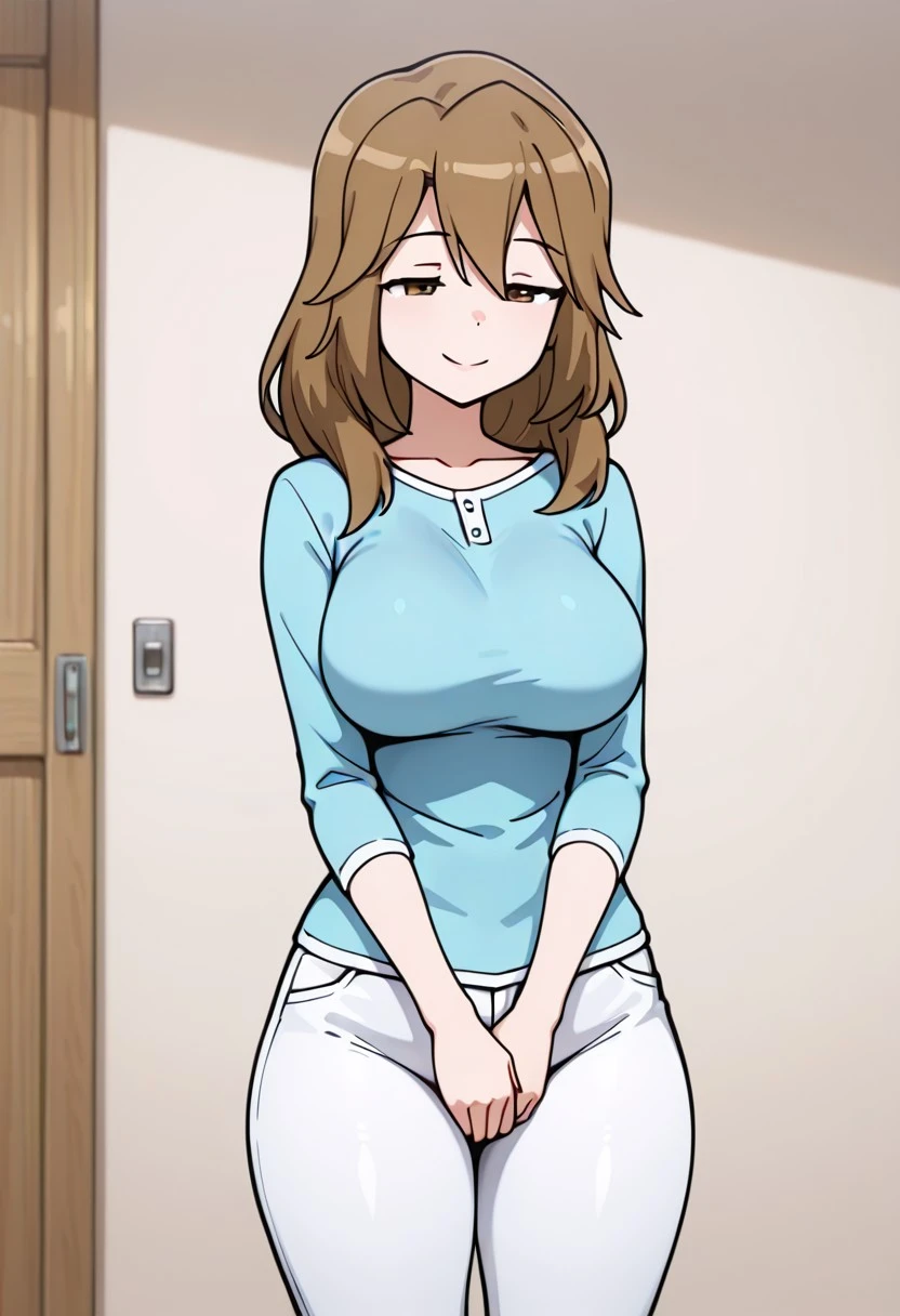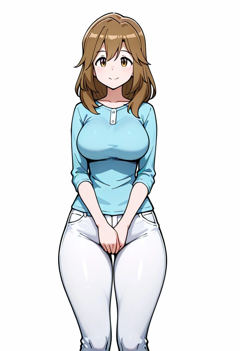 Blue shirt, white pants