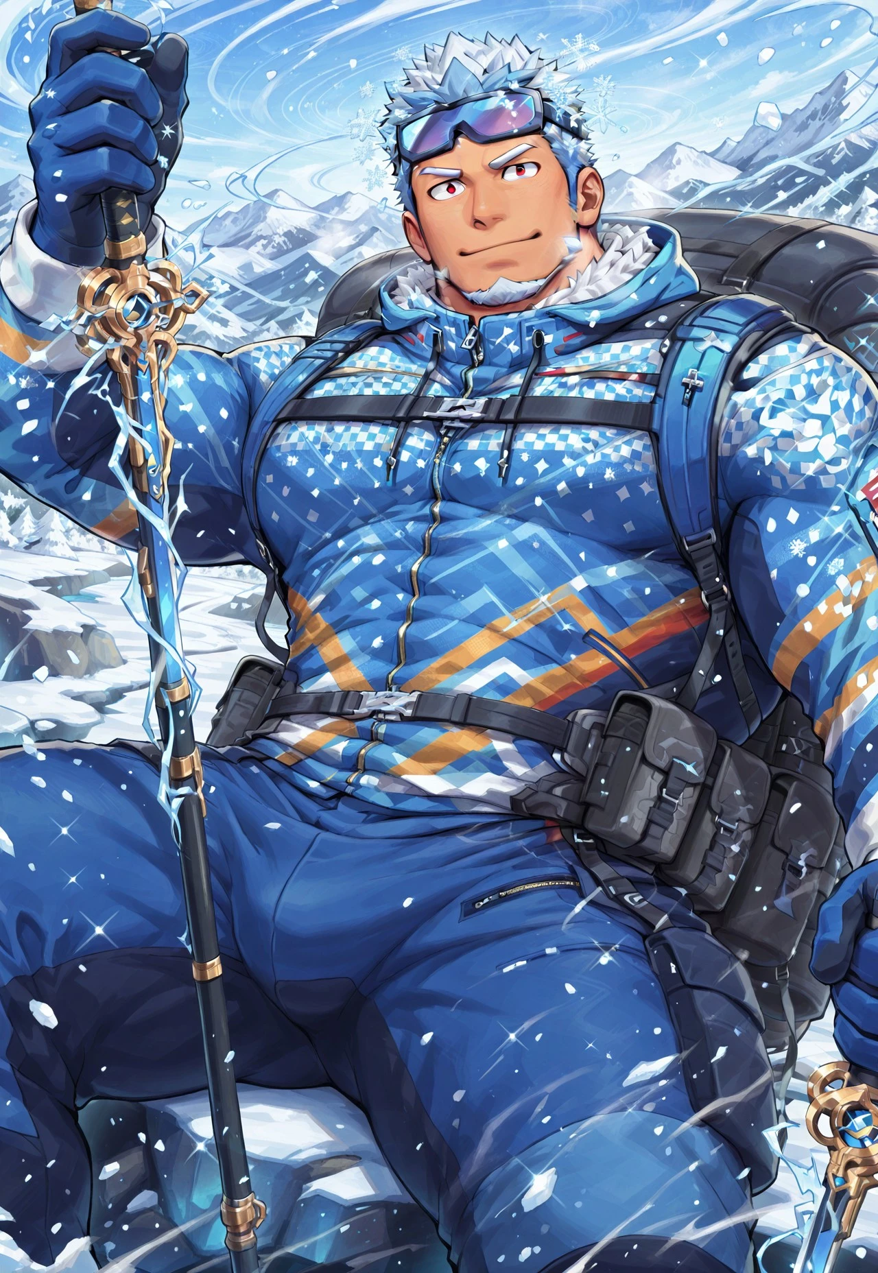 him4v4t, white hair, blue hair, multicolored hair, short hair, snowflakes in hair, red eyes, beard, facial hair, goatee, mature male