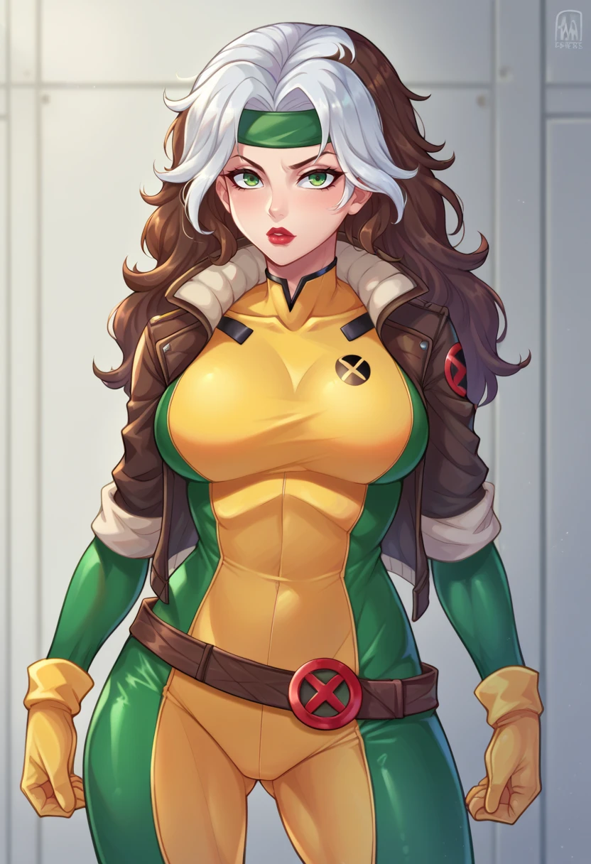 rogueSDXL,1girl,solo,long hair,looking at viewer,brown hair,gloves,green eyes,jacket,white hair,open clothes,open jacket,lips,bodysuit,makeup,headband,lipstick,skin tight,multicolored clothes,buckle,belt buckle,leather,superhero,bomber jacket,dyed bangs,multicolored bodysuit,green bodysuit,yellow bodysuit