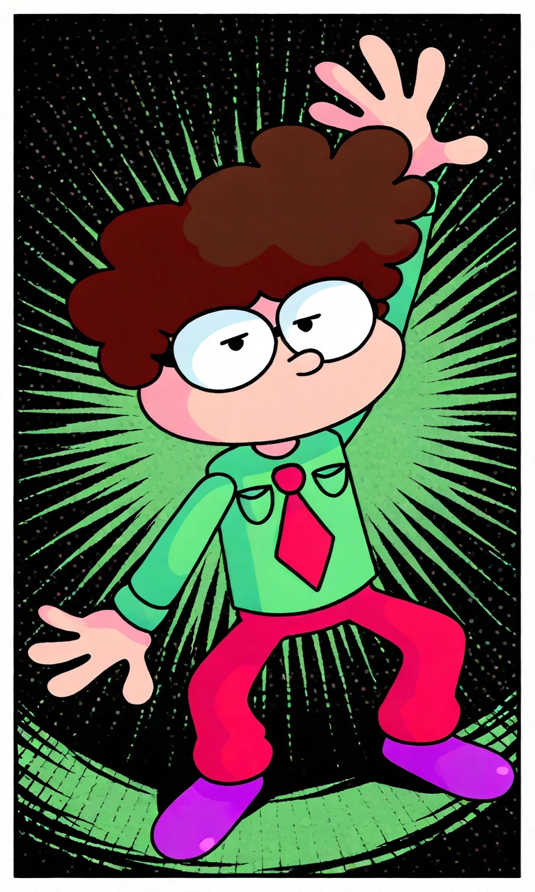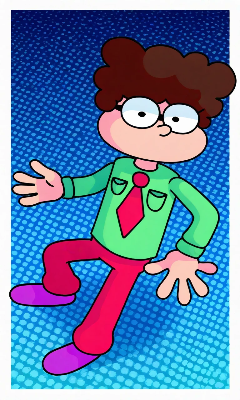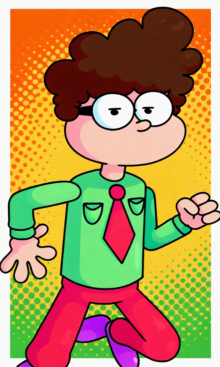 JuanFNF, 1boy, round head, big round black glasses with white lenses, spherical nose, black eyes, thick curly brown hair, green shirt, red neck tie, red pants, purple oval shoes
