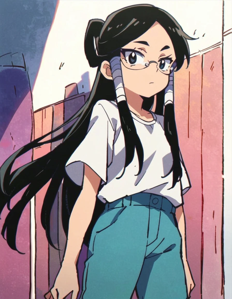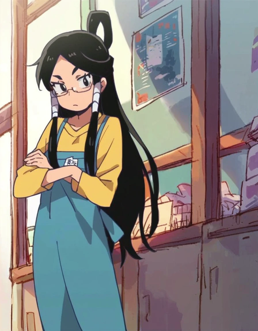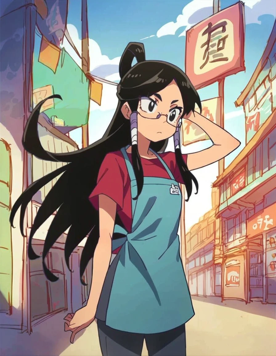 Description: long hair, black hair, glasses, hair tubes, pants, black eyes, apron