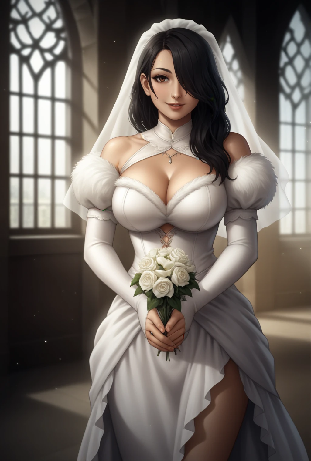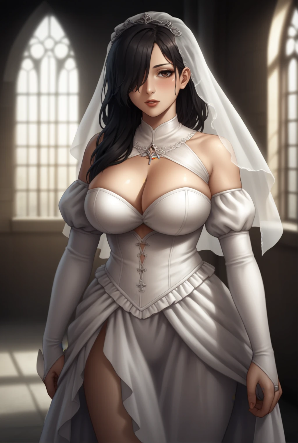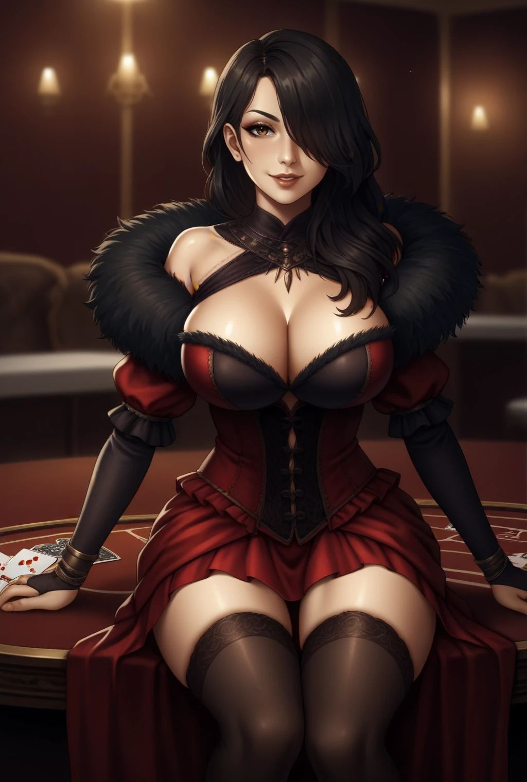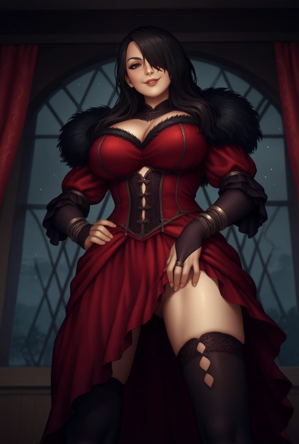 Outfit: ["brown eyes, black hair, long hair, hair over one eye, red dress, jewelry, corset, fur trim, bridal gauntlets, thighhighs, lips, makeup"]