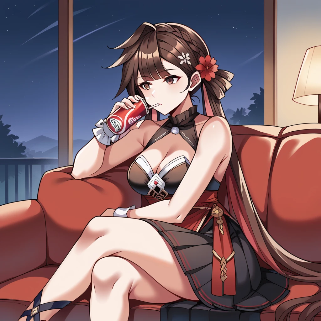SusHi3, Shg_CN, brown eyes, brown hair, long hair, braid, twintails, red hair, streaked hair, chinese clothes, short dress, pleated dress, black dress, layered dress, black skirt, criss-cross straps, red thigh strap, shrug (clothing), coin print, sleeveless, frilled collar, black collar, black shrug, coin, sleeveless shrug, bare shoulders, alt single-shoulder cape, red cape, alt stole, red stole, pom pom (clothes), white rope, rope around waist, red sash, white bra, high-waist skirt, cleavage, hair flower, red flower, animal on head, rabbit on head, cash (chinese), frilled wrist cuffs, single wrist cuff,Midnight Moon Outfit:
