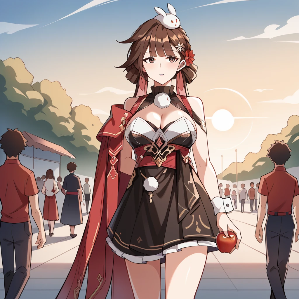 Sus_CN, sleeveless dress, red dress, black dress, pleated skirt, red sash, cleavage, frilled wrist cuffs, hair flower, bunny on head, braid, side cape, red cape, stuffed bunny,Swimsuit Outfit: