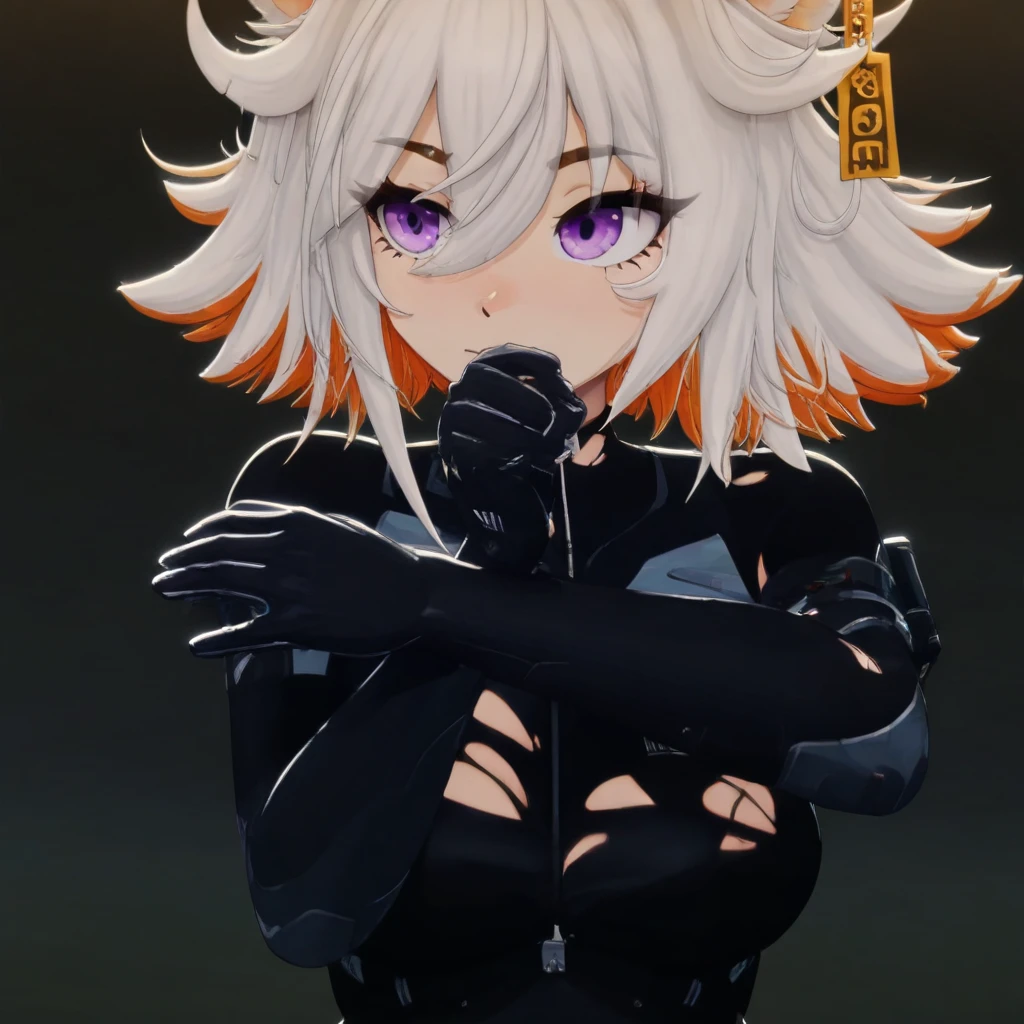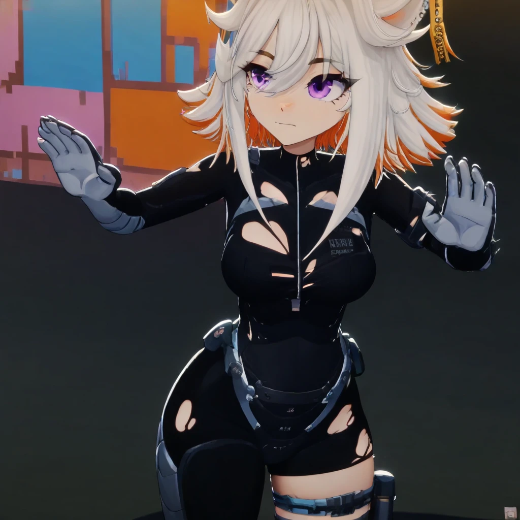 Deme_(vtuber), ahoge, white hair, orange hair, multicolored hair, short hair, purple eyes, cat ears, ear tag, black bodysuit, gloves, torn clothes, thigh strap, cyber legs