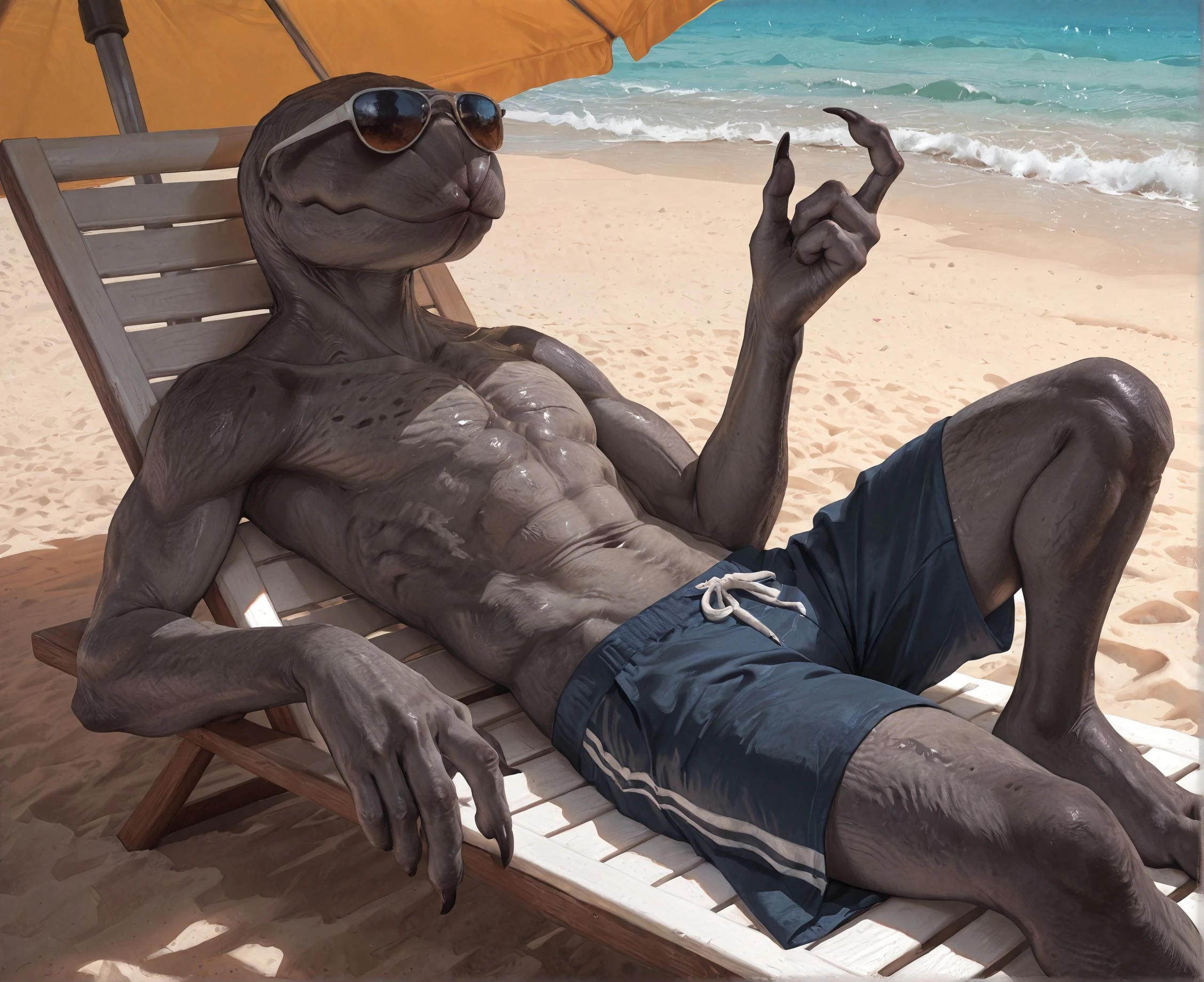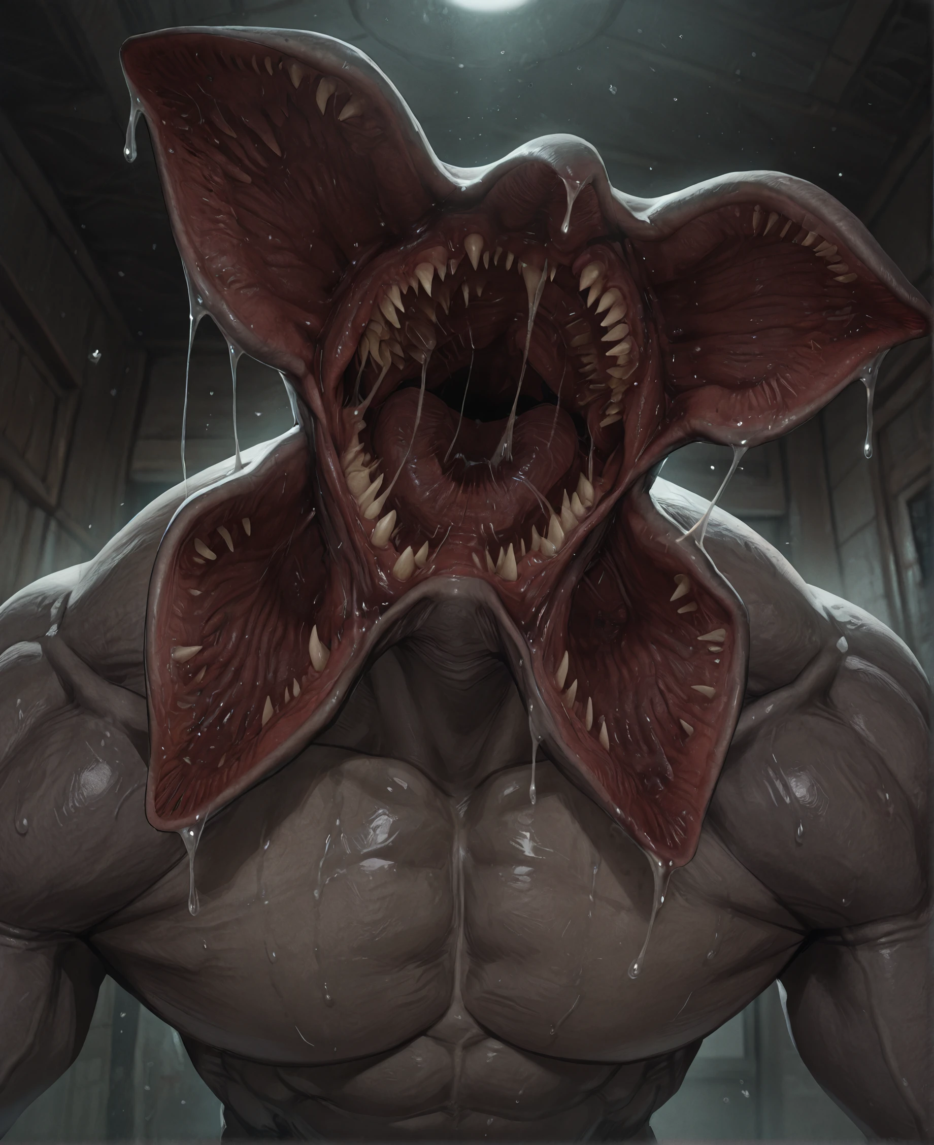 Tags: d3mogorgon, monster, creature, horror (theme), no nose, no ears, no face, no eyes, lanky, long fingers, grey skin, claws, collar bone, long arms, digitigrade, textured skin, split jaw, split mouth