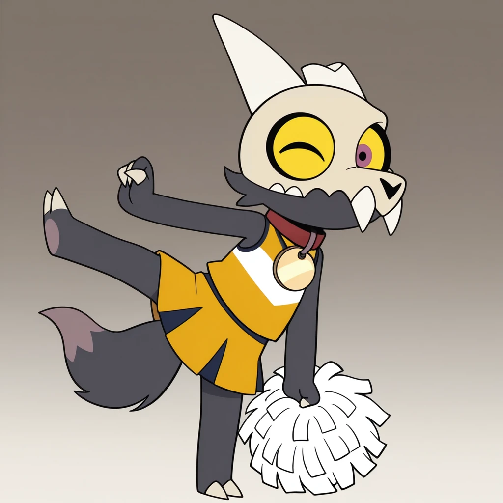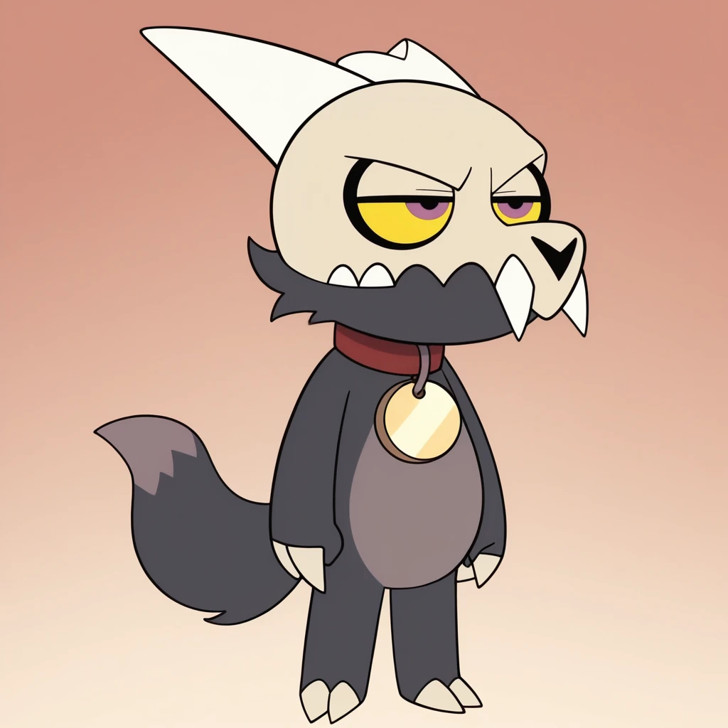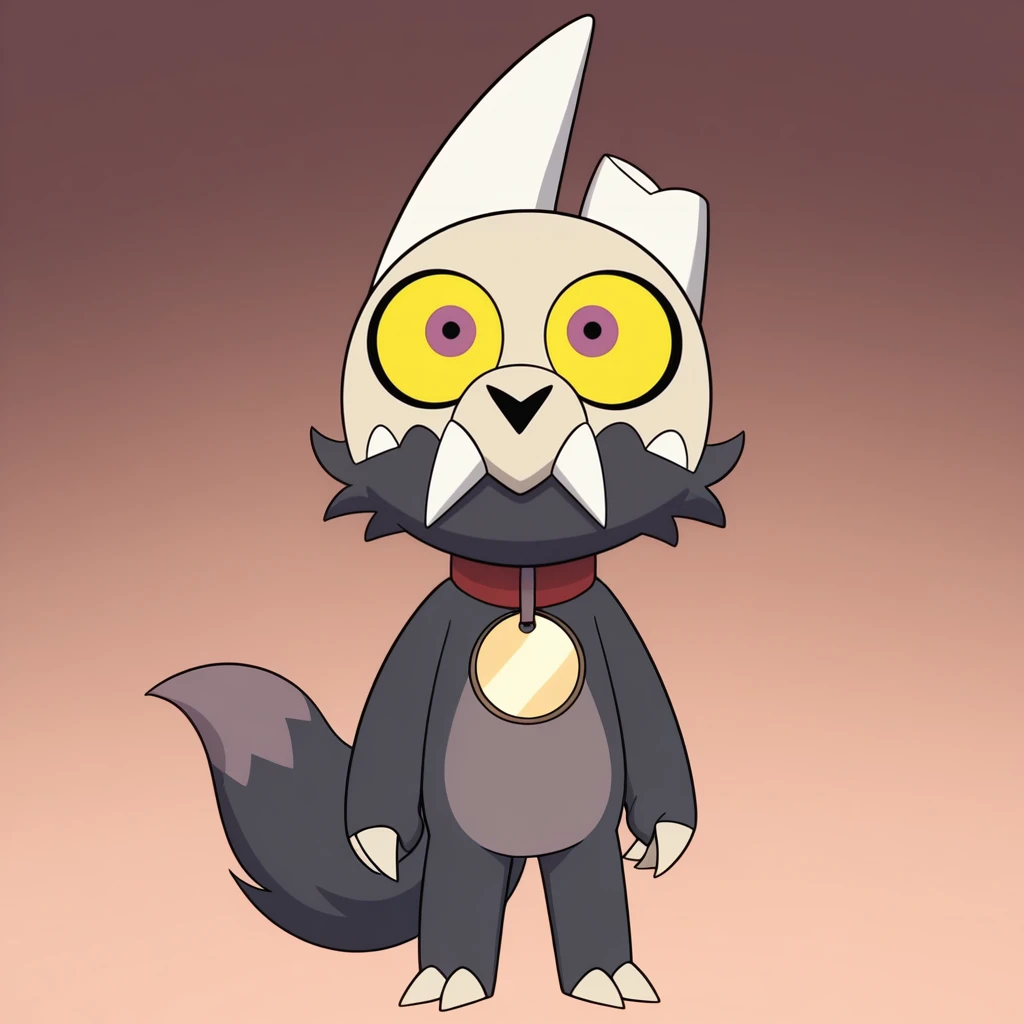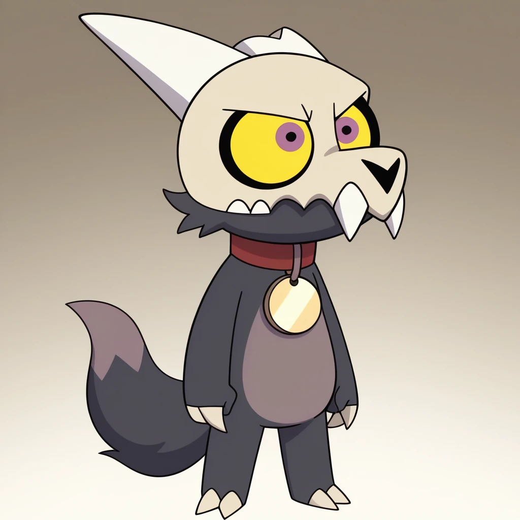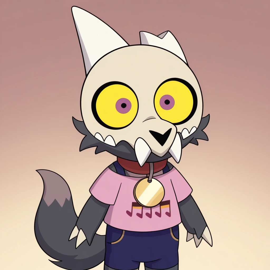 1boy, male, furry, furry male, young, solo, grey fur, two-tone fur, skull head, horns, one broken horn, yellow sclera, purple eyes, fangs, sharp claws, dipstick tail, fox tail, short