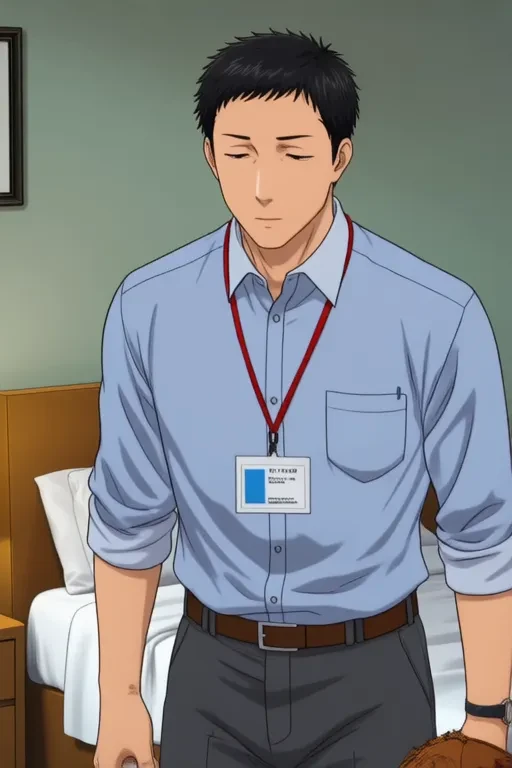 Trigger Word:Yashiro Kizuku, anime-style boy. The image depicts a person with short, dark hair styled in a casual manner. The individual is wearing a light blue button-up shirt with the sleeves rolled up to the elbows. A red lanyard with an ID card hangs around their neck, which has a blue background and some text on it. They are also wearing dark gray pants with a brown belt and a black wristwatch on their left wrist.