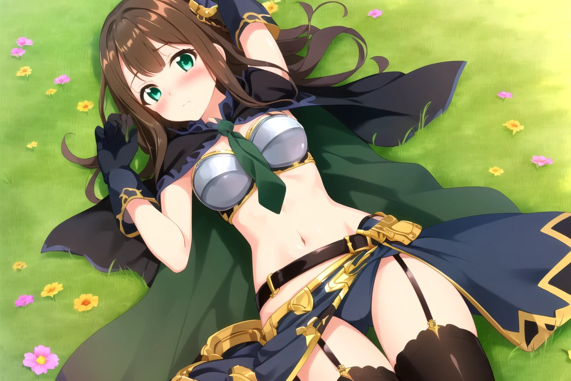 long hair, brown hair, hair ornament, gloves, green eyes, navel, midriff, belt, cape, breastplate, garter straps, green necktie, sheath, black thighhighs, bootsOptional tags :