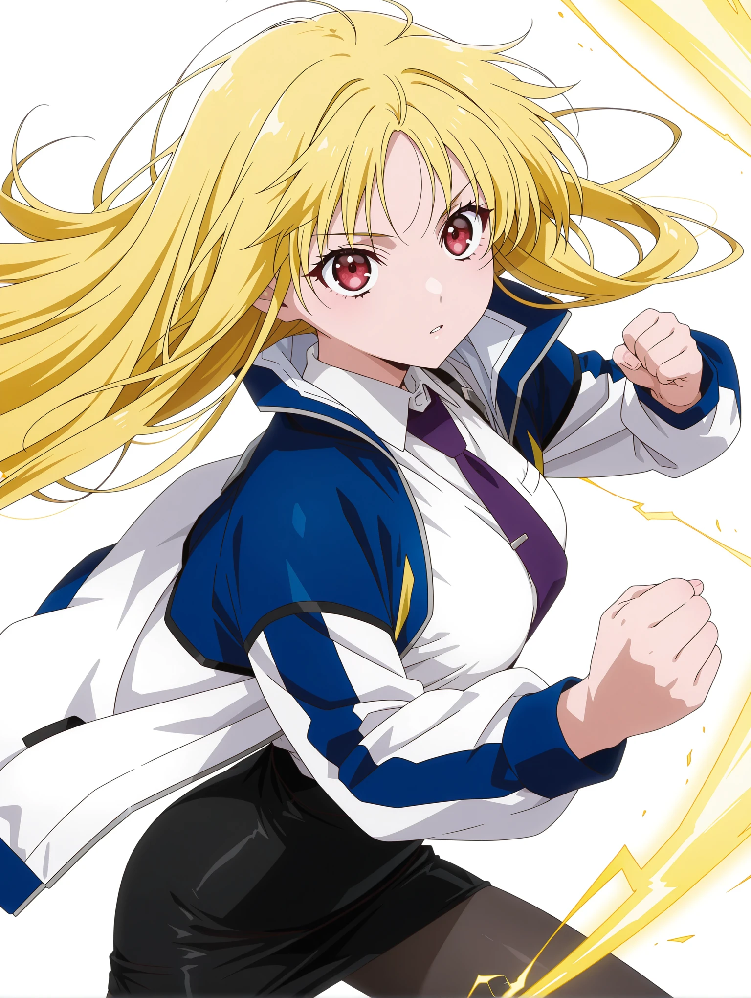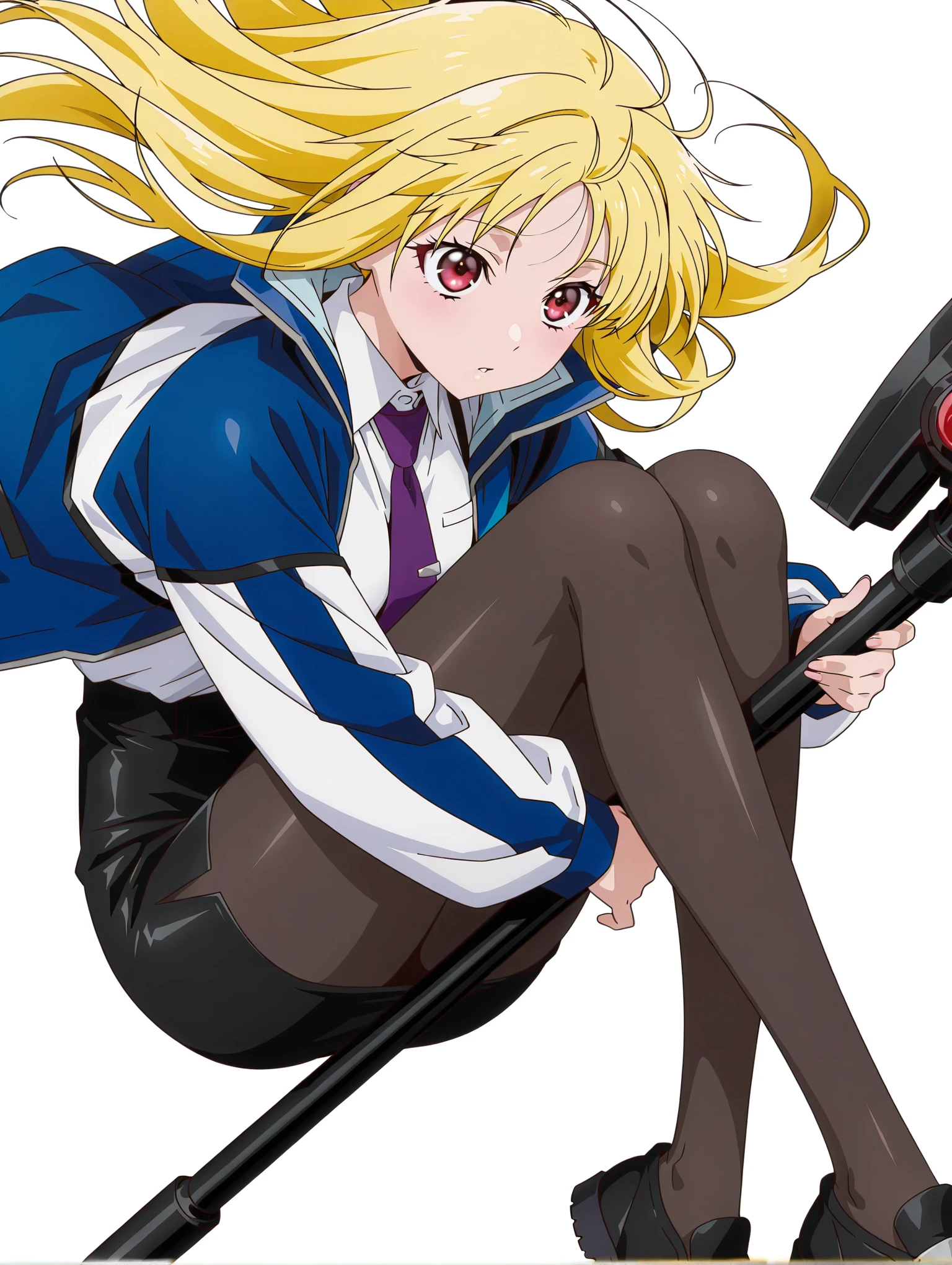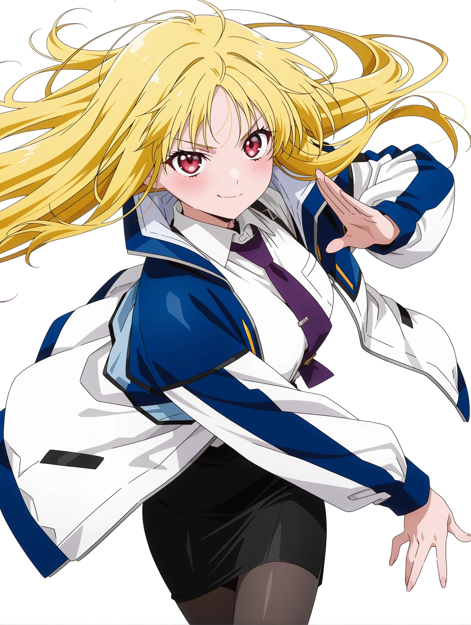 f_clothes,tie clip,purple necktie,two-tone jacket,collared shirt,white shirt,,,long sleeves,black pencil skirt,black pantyhose,black footwear,