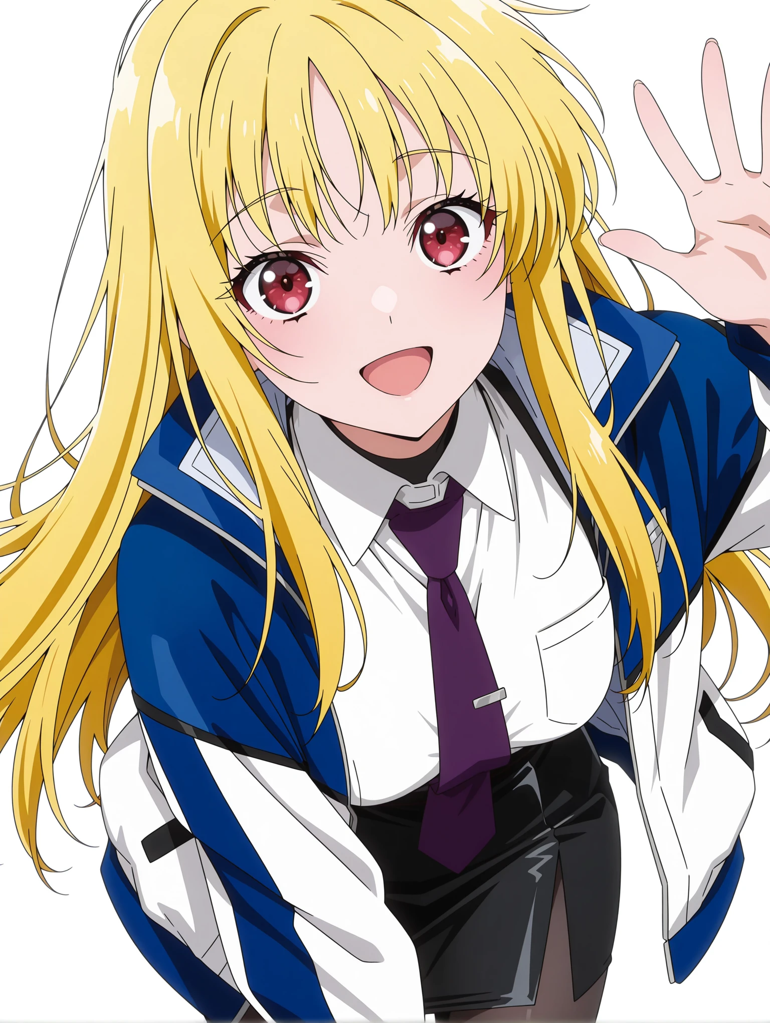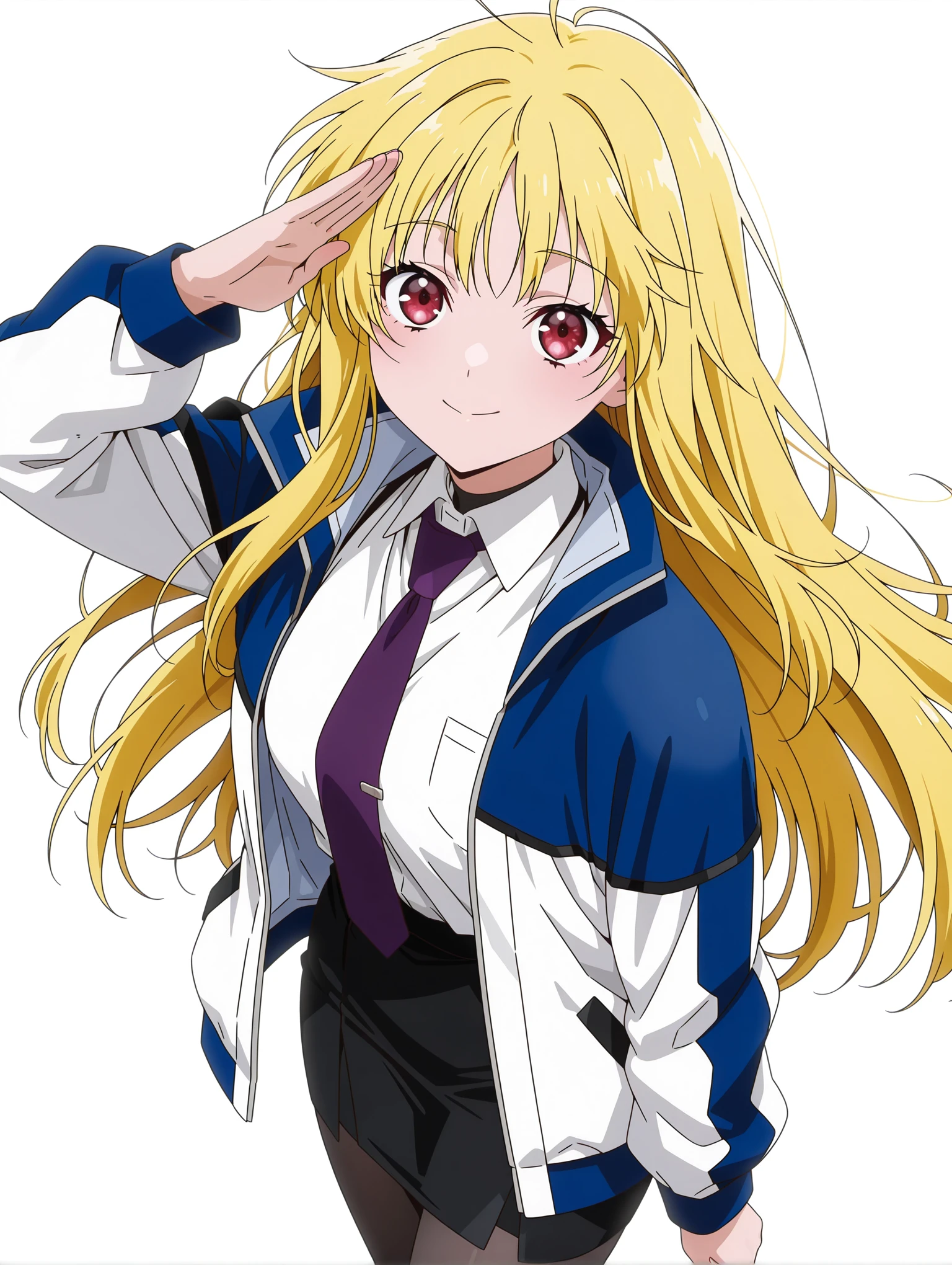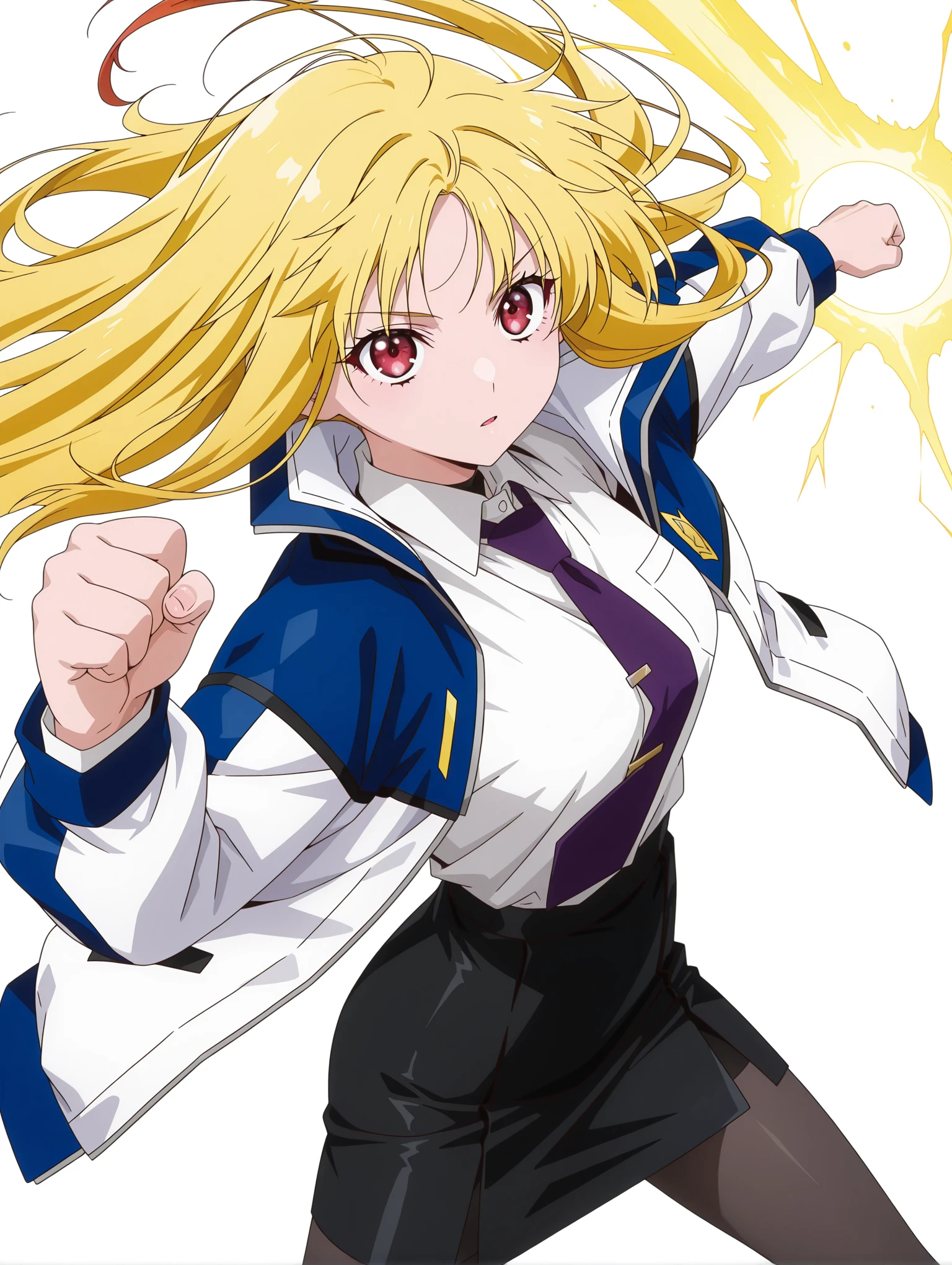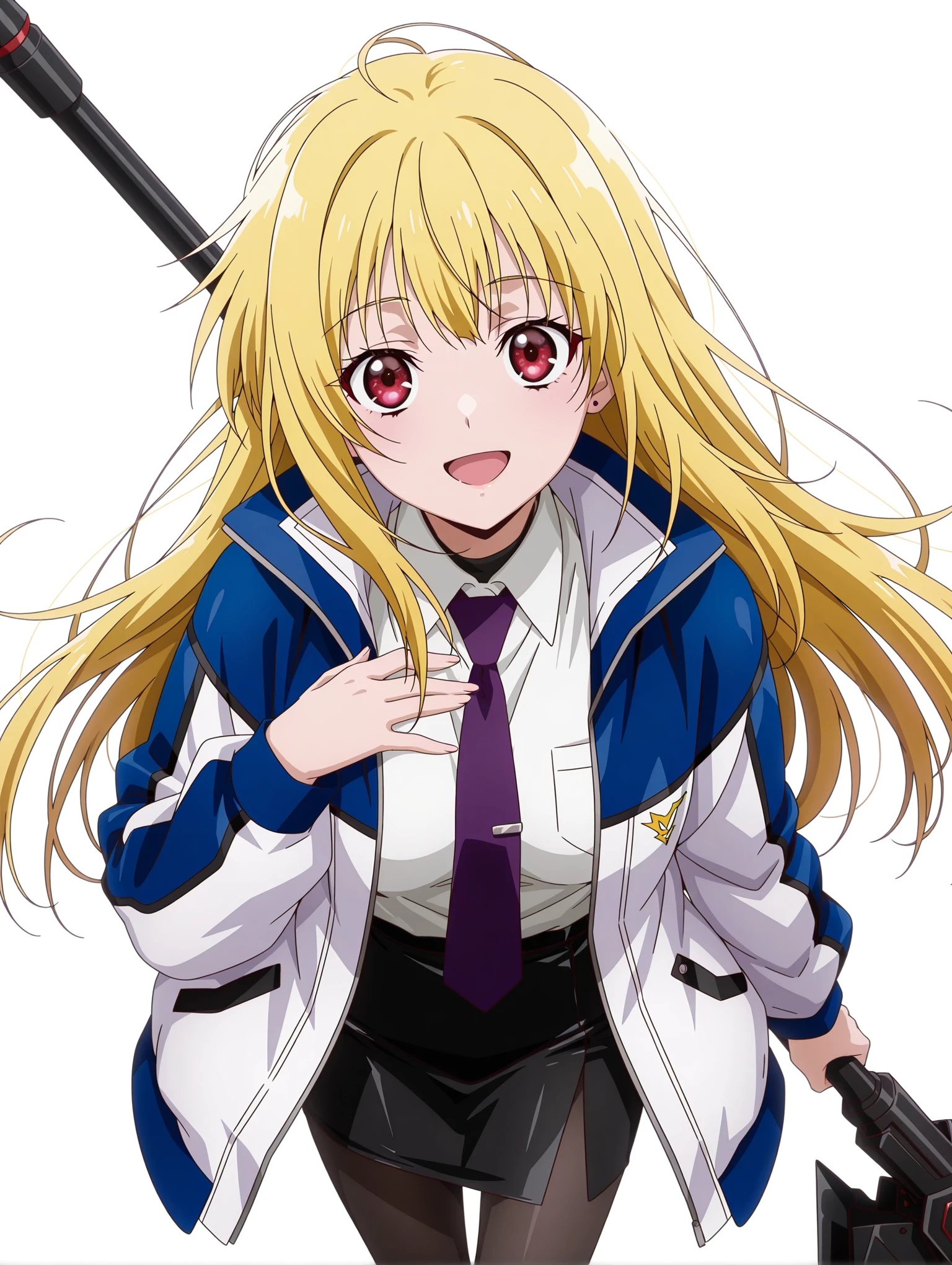 f_clothes,tie clip,purple necktie,two-tone jacket,collared shirt,white shirt,,,long sleeves,black pencil skirt,black pantyhose,black footwear,