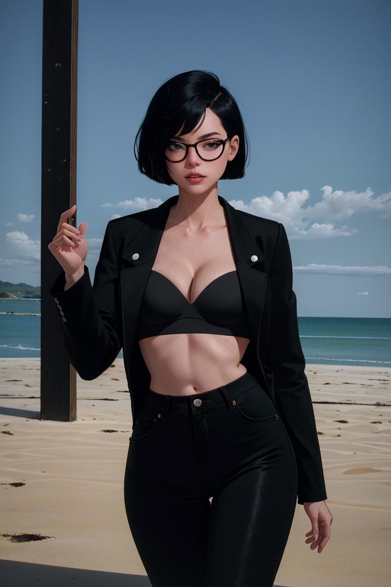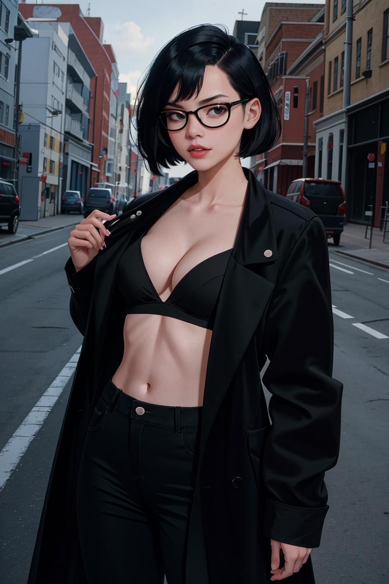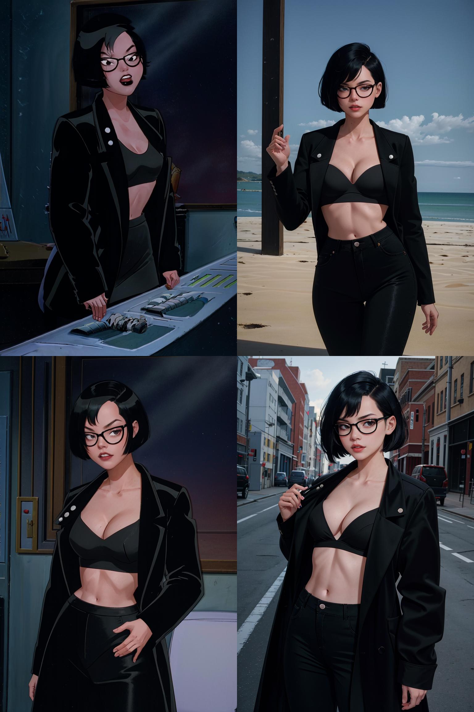 BODY PROMPTSblack hair, short hair, navel, black eyes, black lips, makeup, lipstick, breasts, round eyewear, bob cut, bangs, black-framed eyewear,