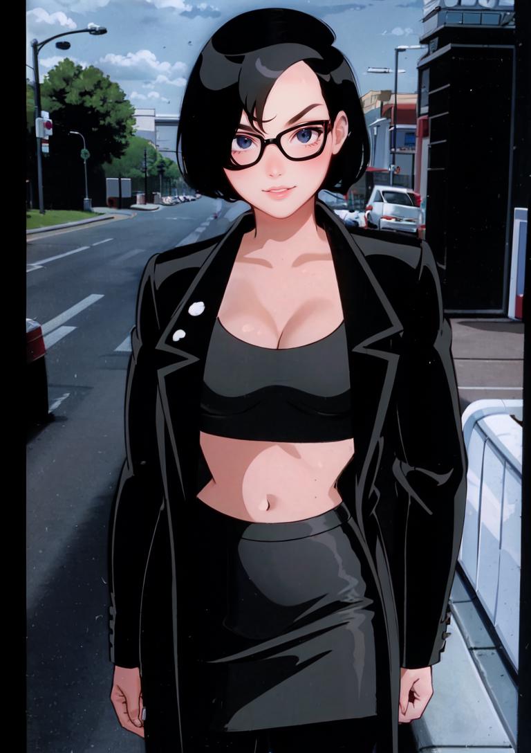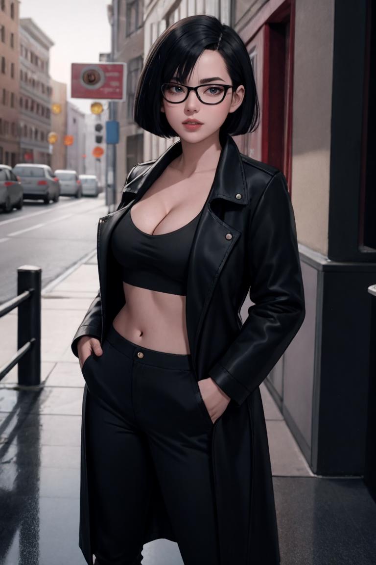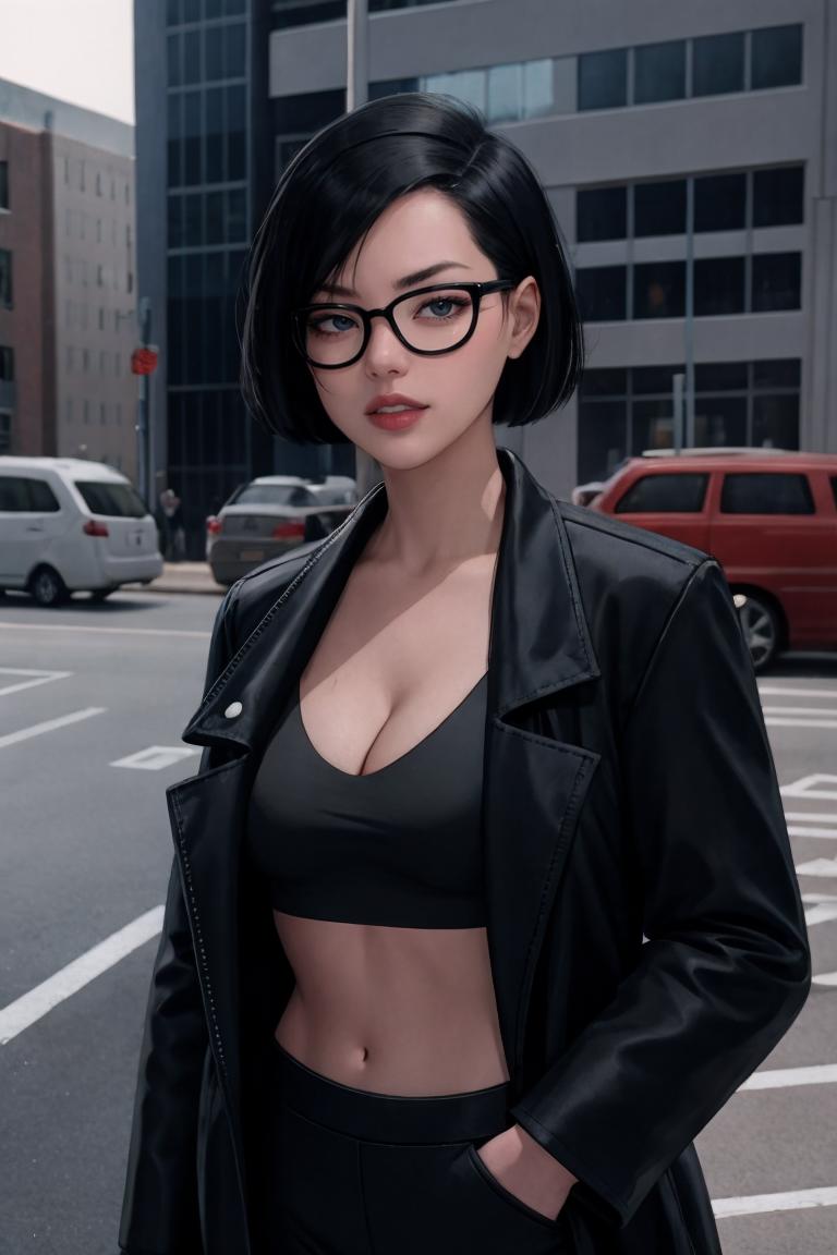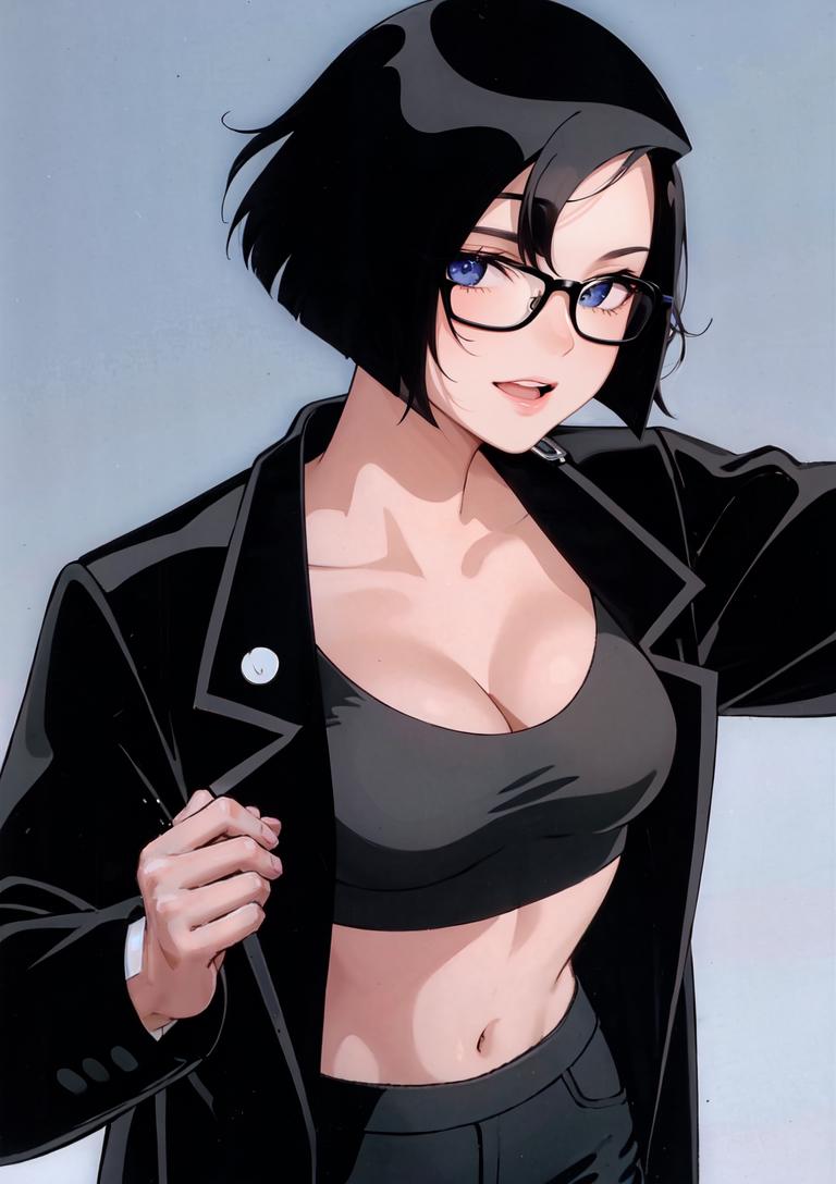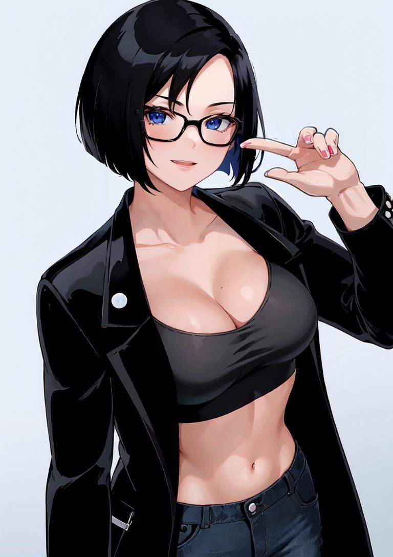 OUTFIT PROMPTSglasses, jacket, midriff, black jacket, crop top, long sleeves, pants, coat, black coat, cleavage,